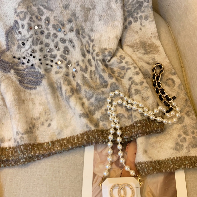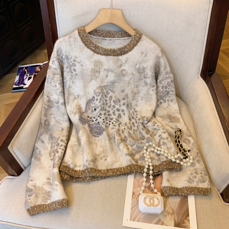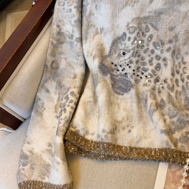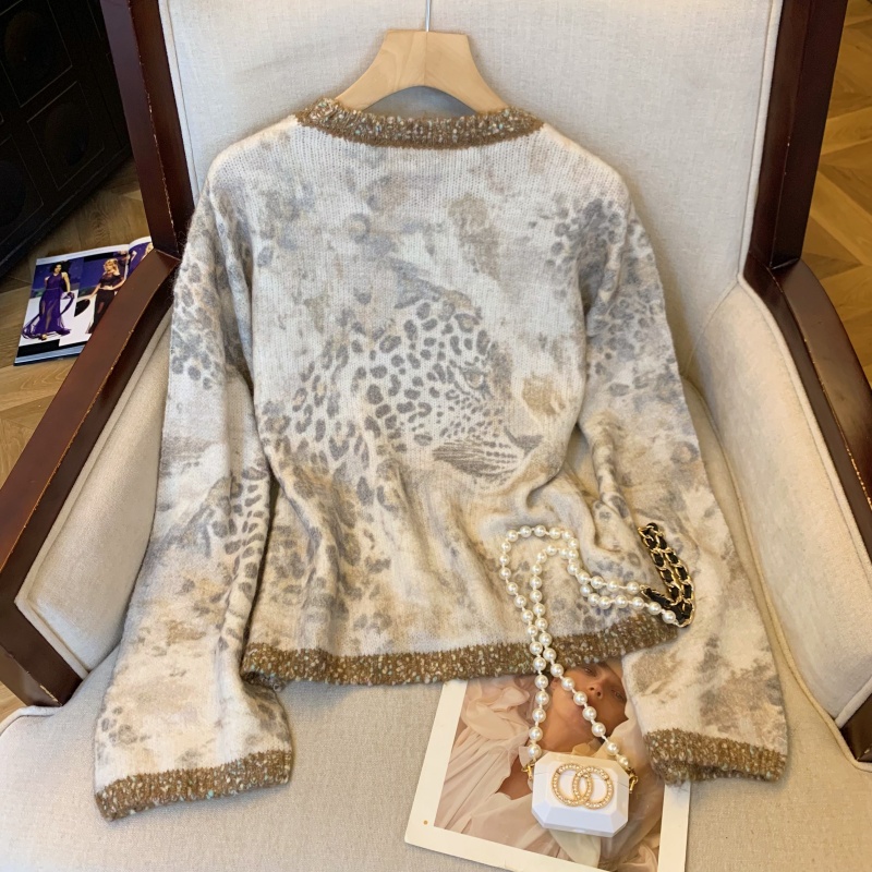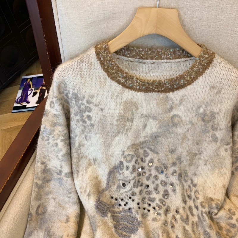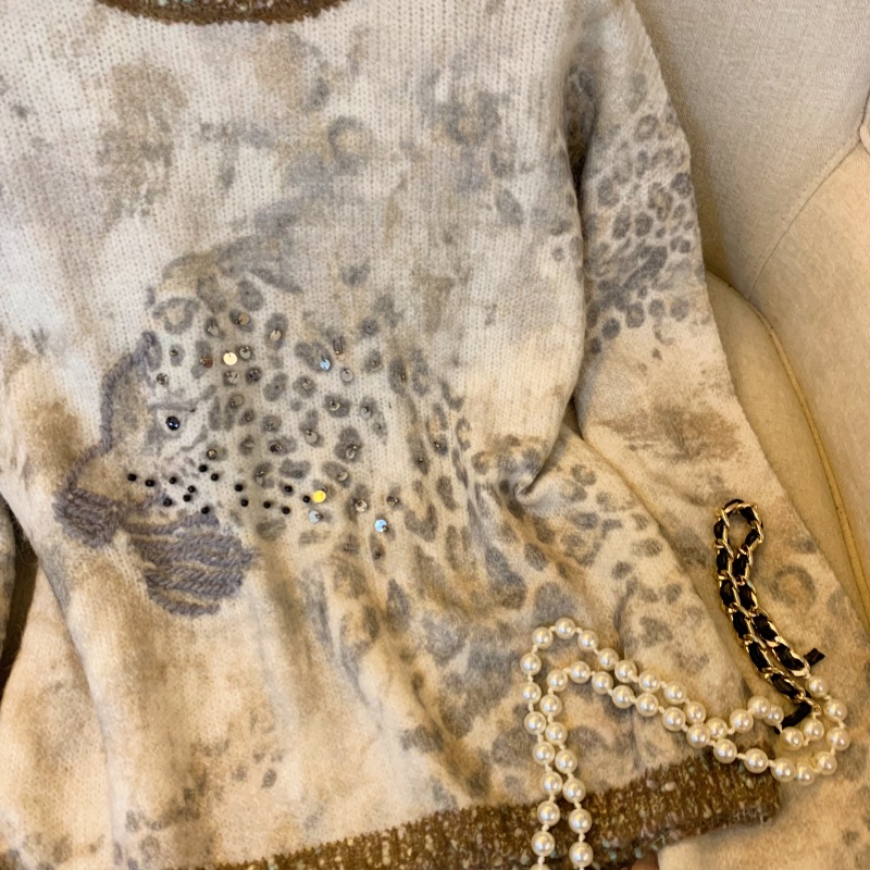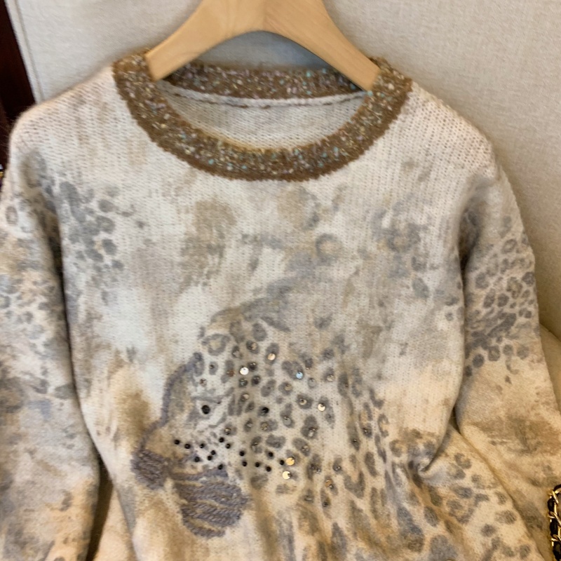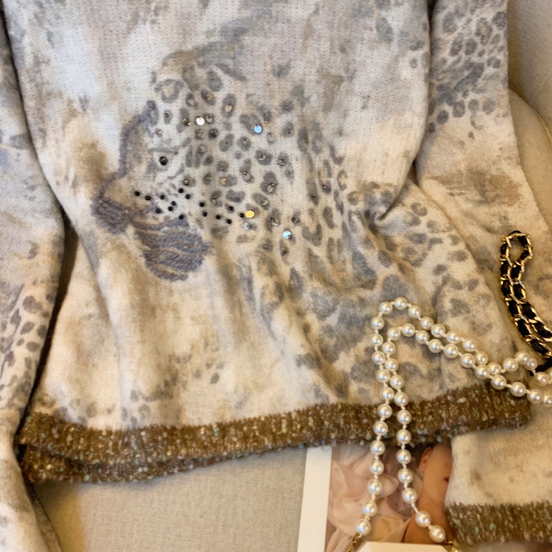 MY13836# 女裝貨源法式氛围感轻奢撞色豹纹毛衣女重工钉珠亮片针织长袖上衣女裝貨源服裝批發服裝批發