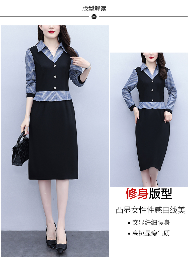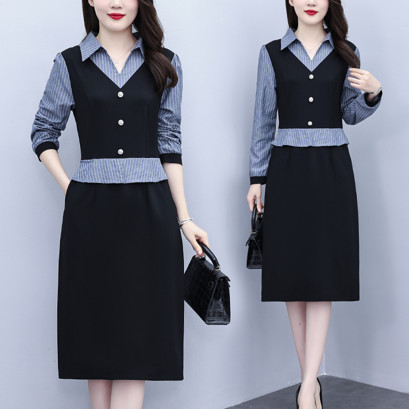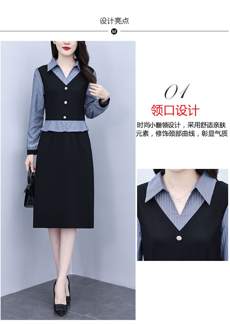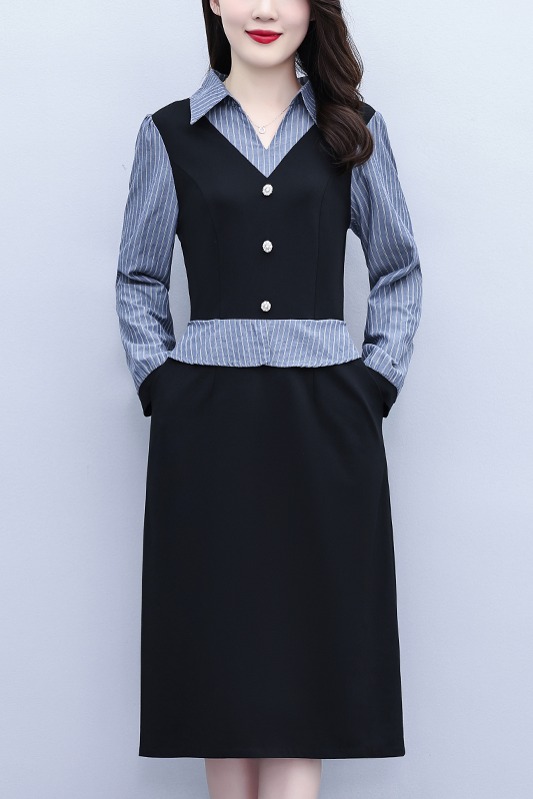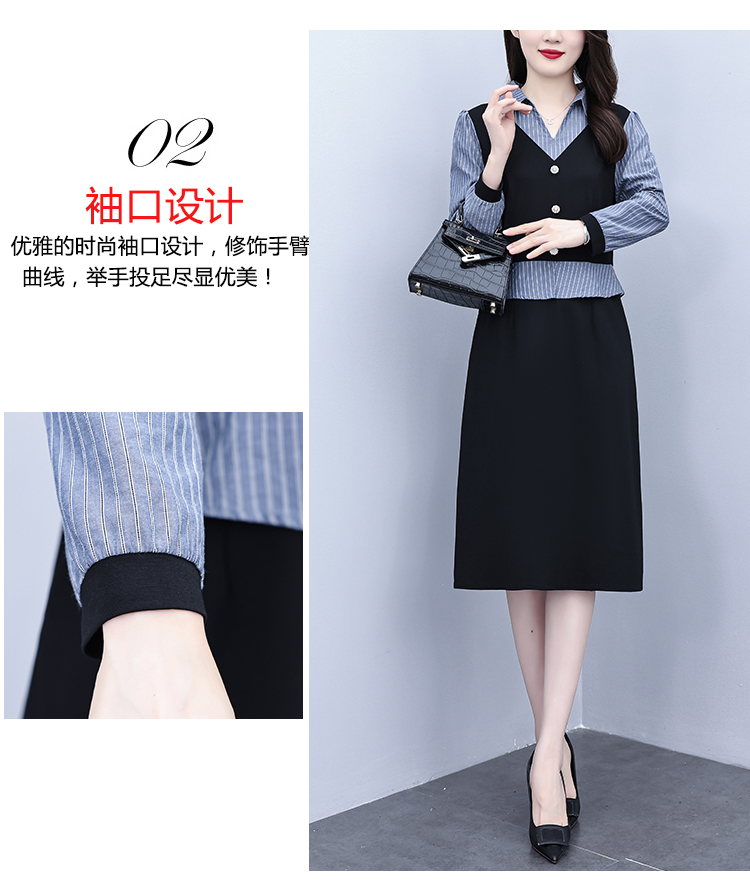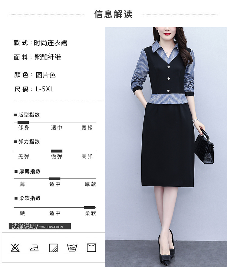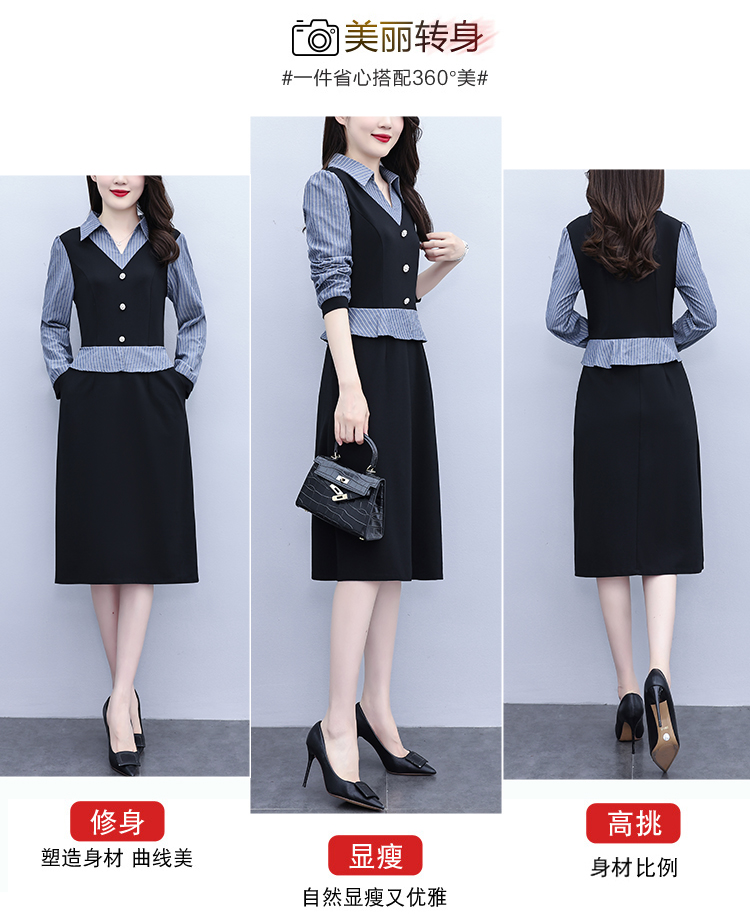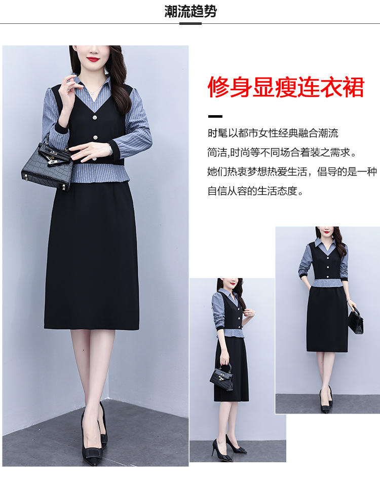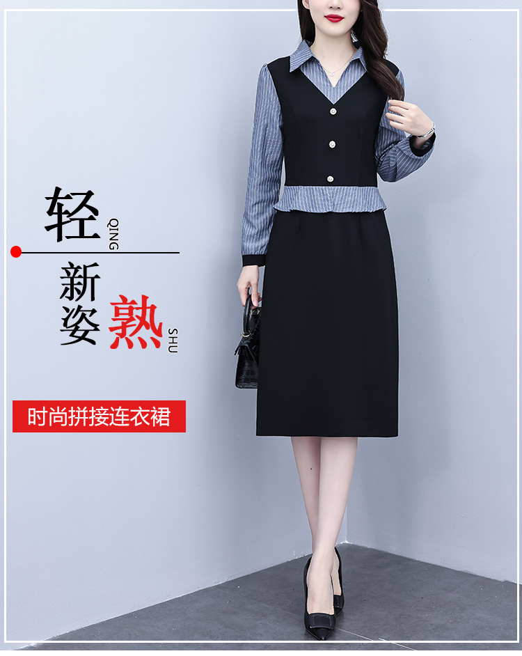 MY13854# 女裝貨源大码裙子新款遮肉条纹拼接气质假俩件显瘦减龄中长连衣裙女裝貨源服裝批發服裝批發