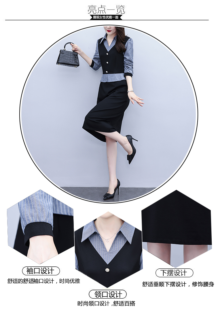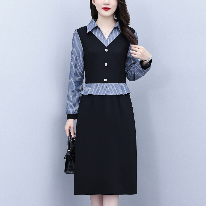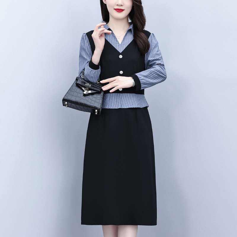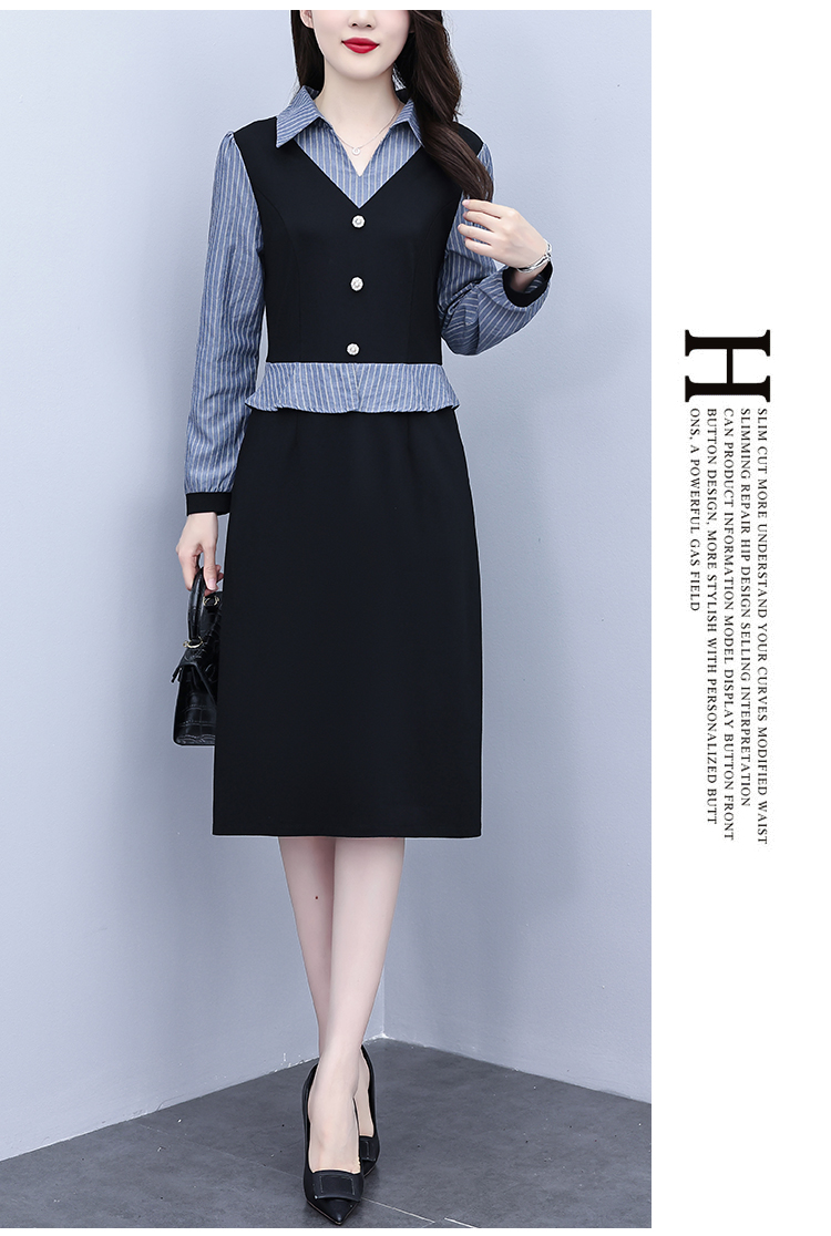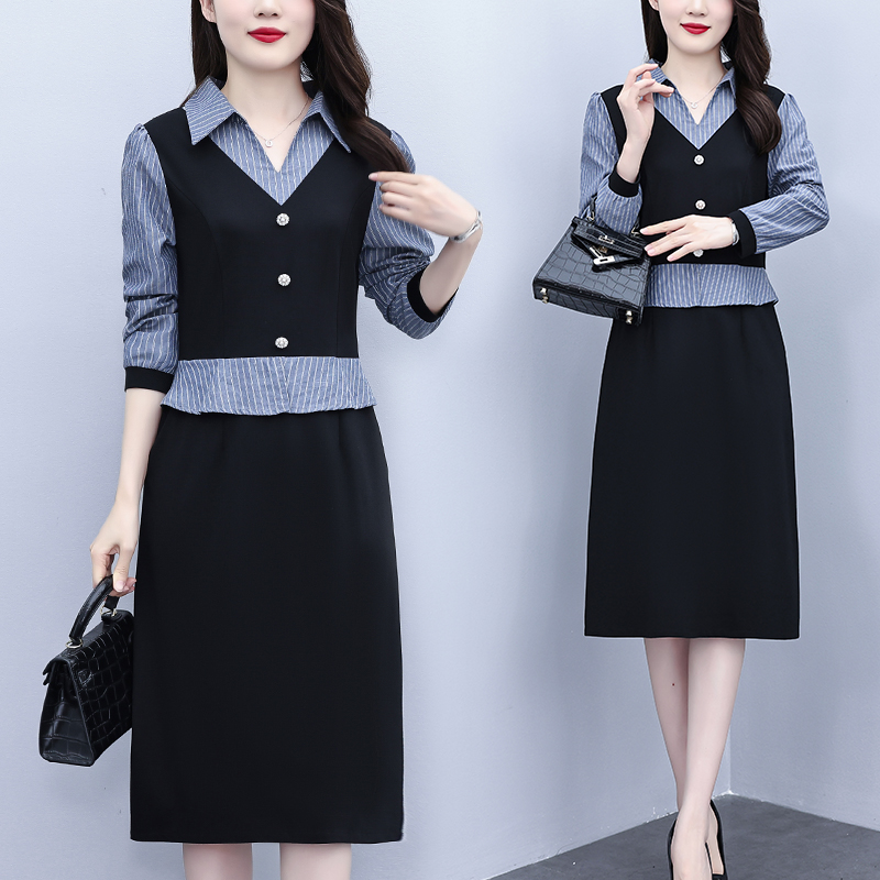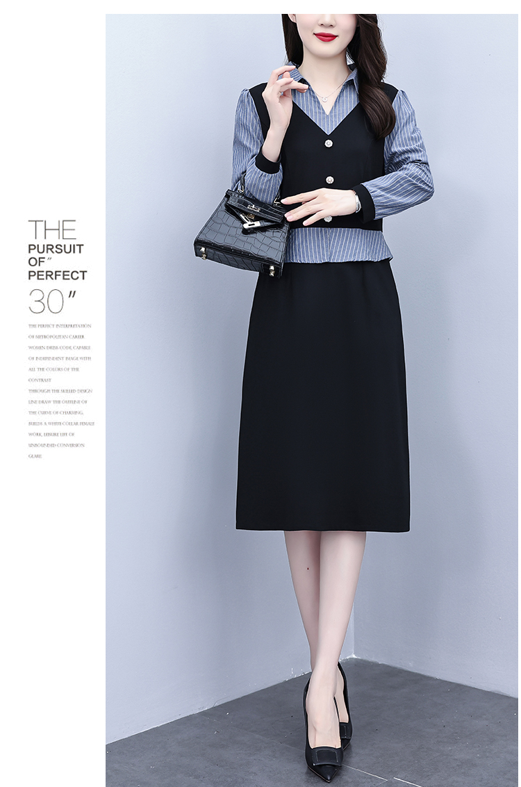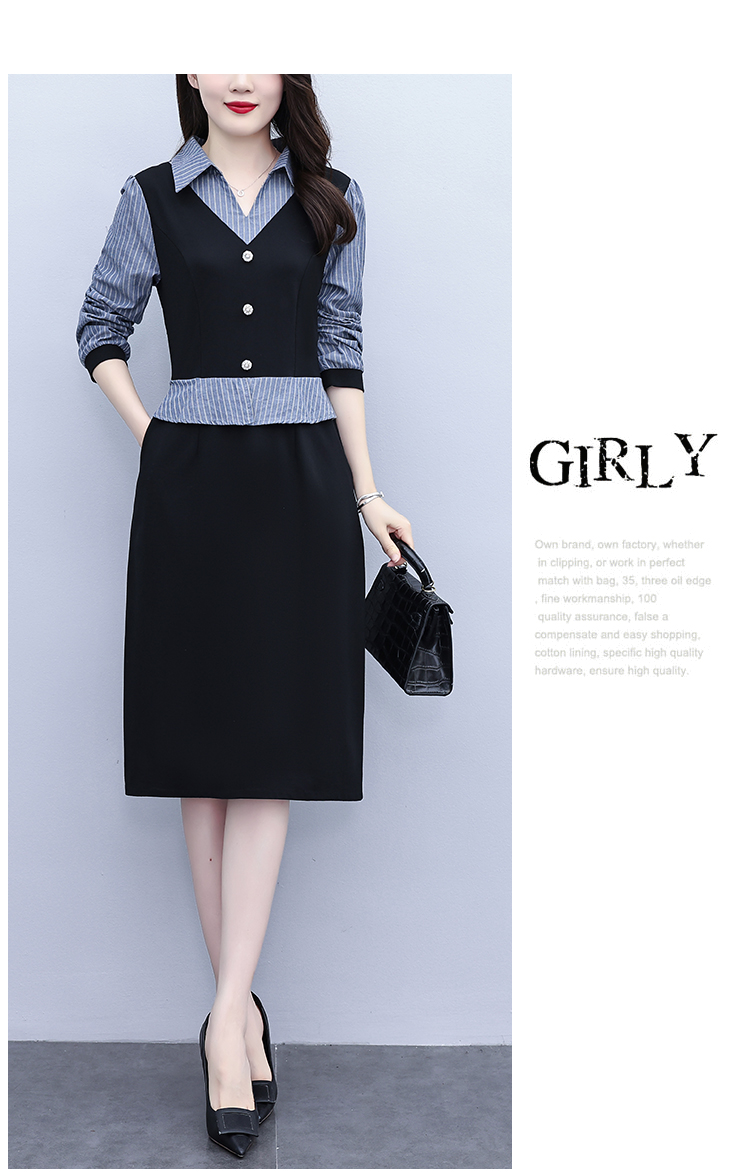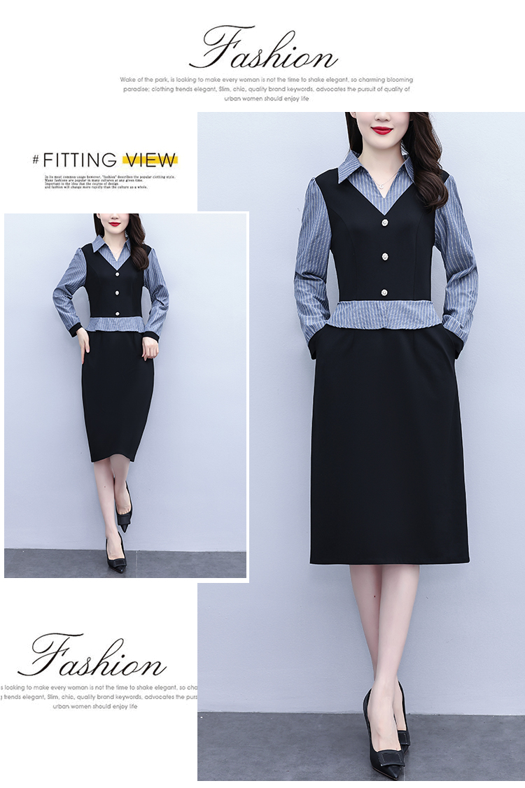 MY13854# 女裝貨源大码裙子新款遮肉条纹拼接气质假俩件显瘦减龄中长连衣裙女裝貨源服裝批發服裝批發
