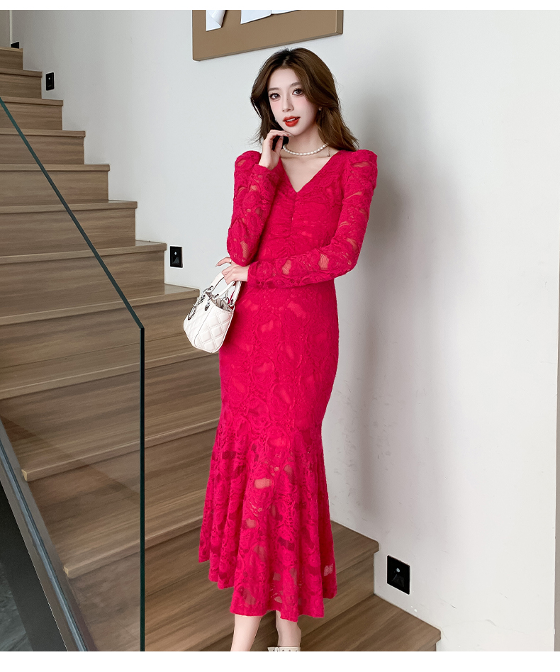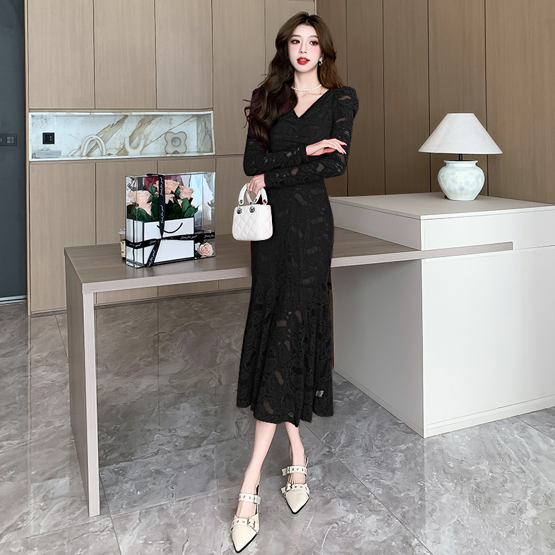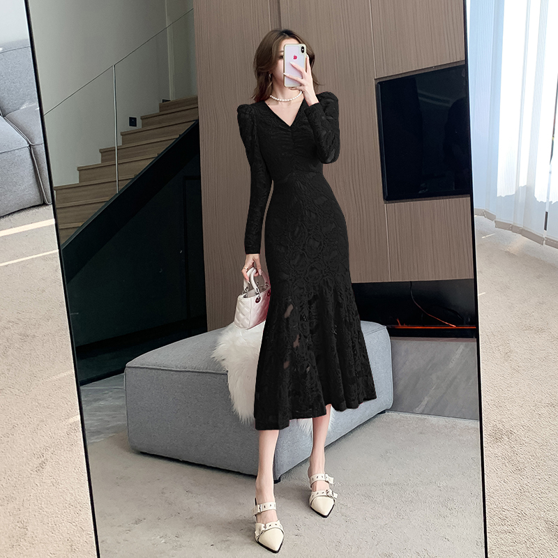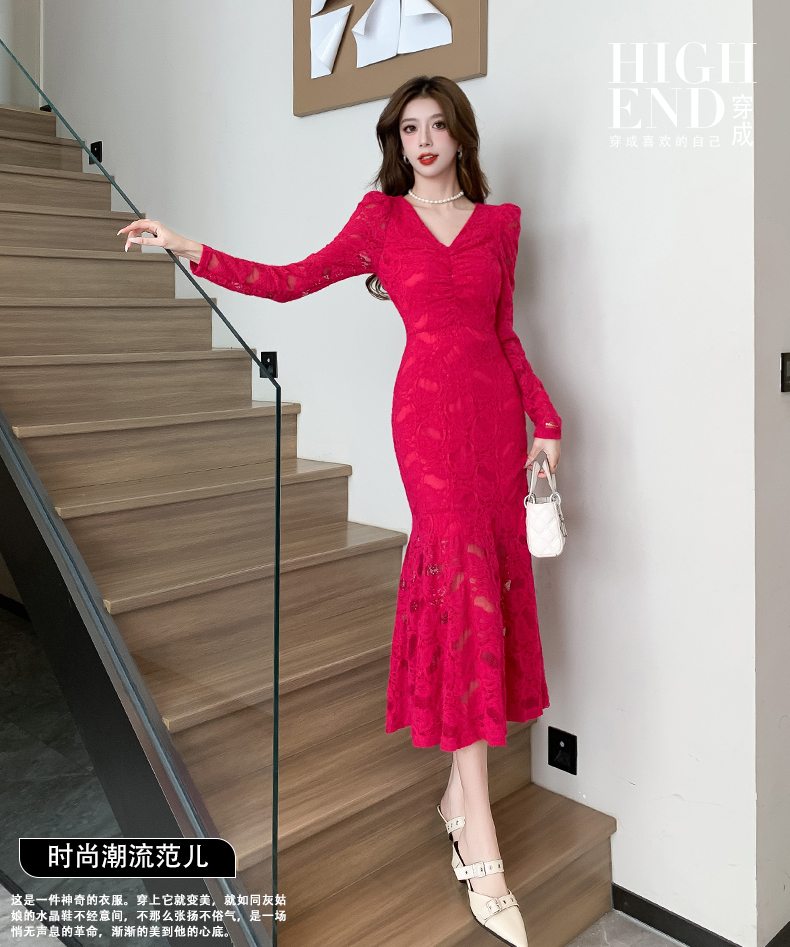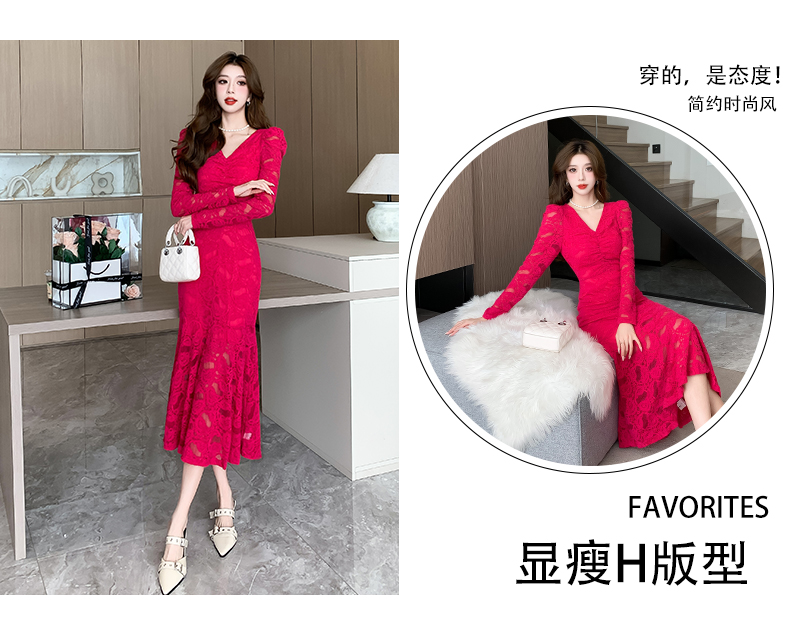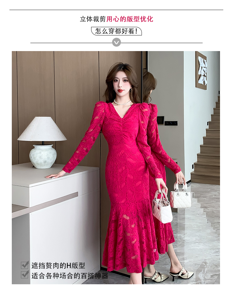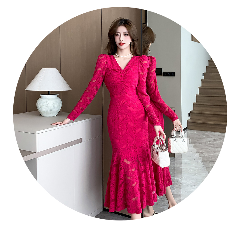 MY13862# 女裝貨源新款蕾丝V领长袖收腰显瘦包臀鱼尾连衣长裙女裝貨源服裝批發服裝批發