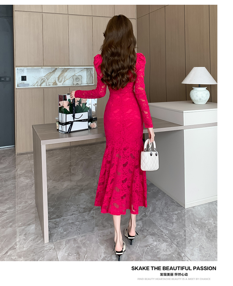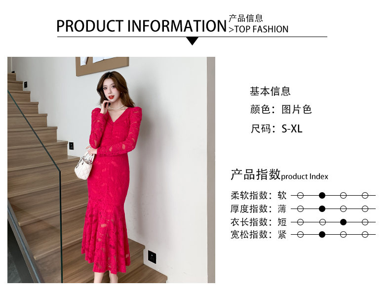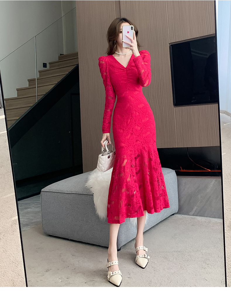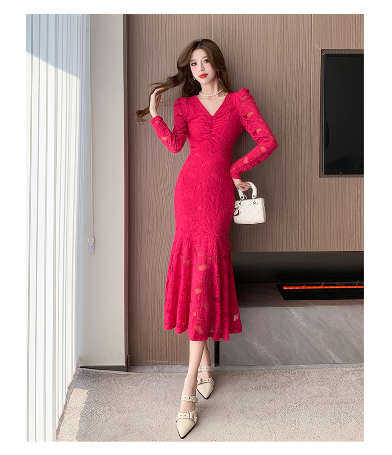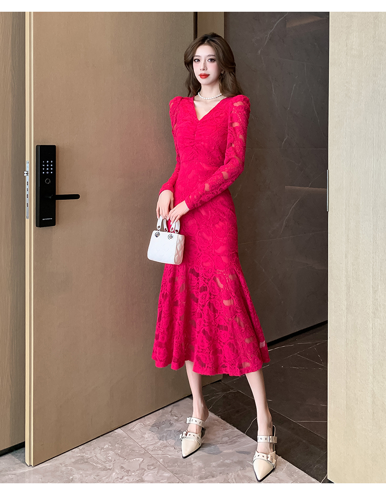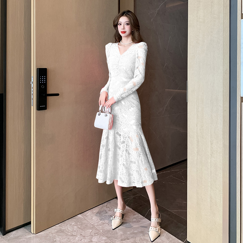 MY13862# 女裝貨源新款蕾丝V领长袖收腰显瘦包臀鱼尾连衣长裙女裝貨源服裝批發服裝批發