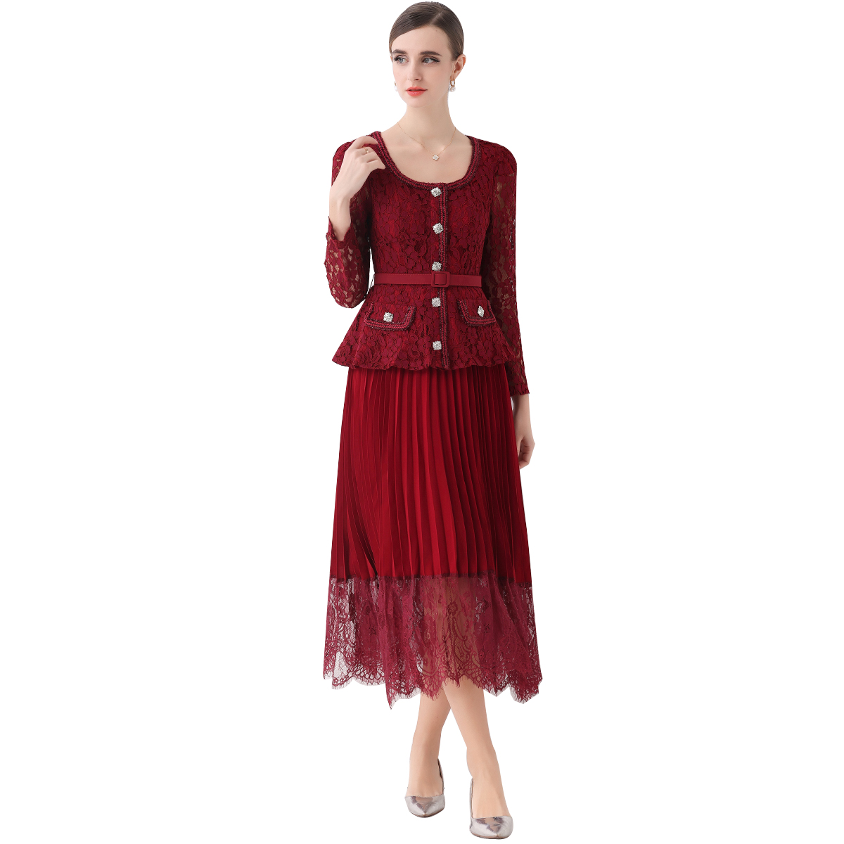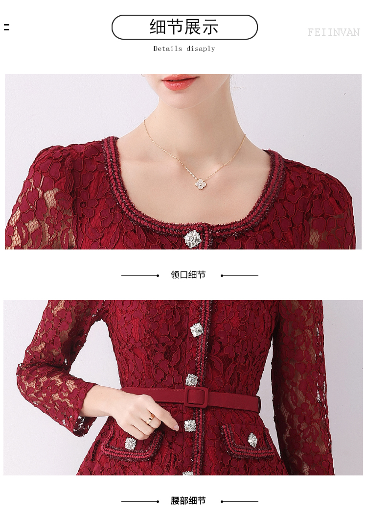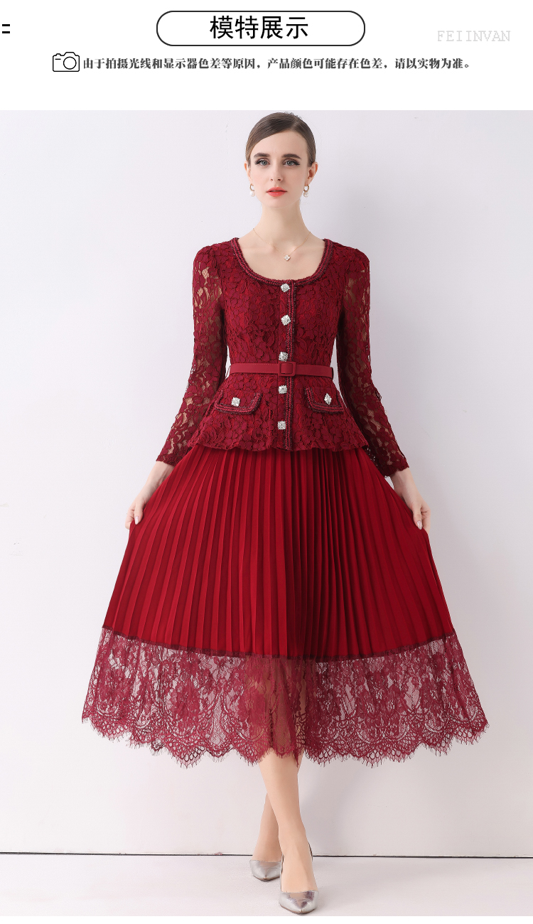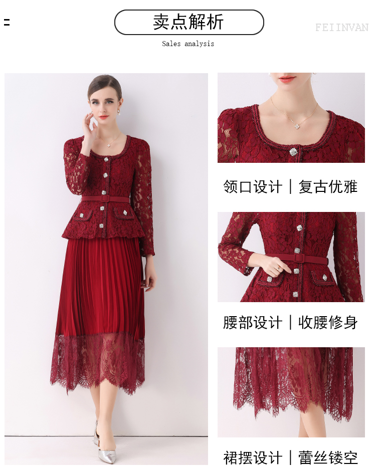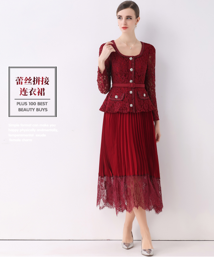 MY13876# 女裝貨源法式翻领蕾丝拼接收腰压褶连衣裙女秋季小香风长裙子送腰带女裝貨源服裝批發服裝批發