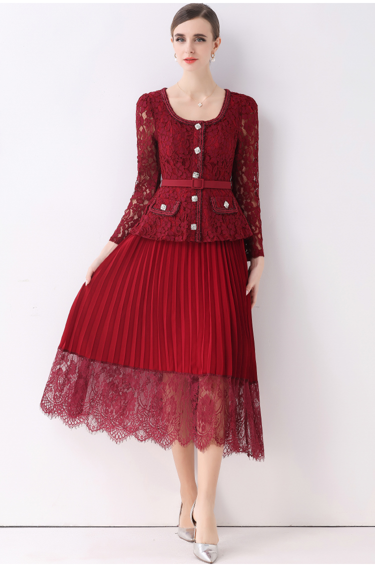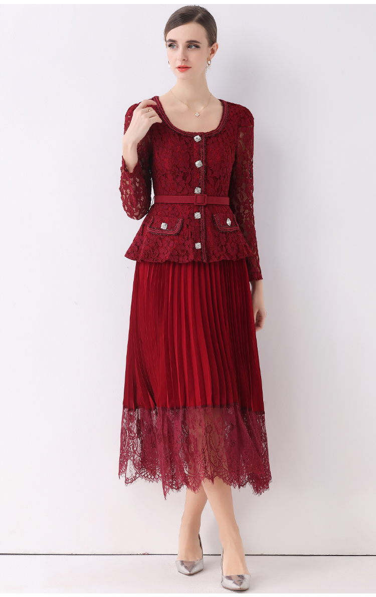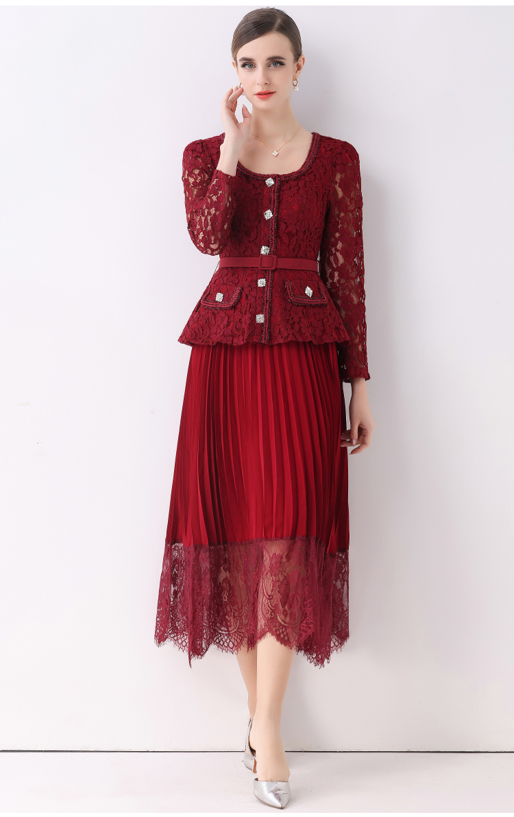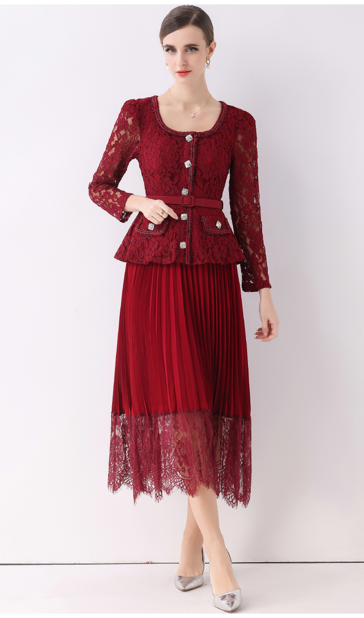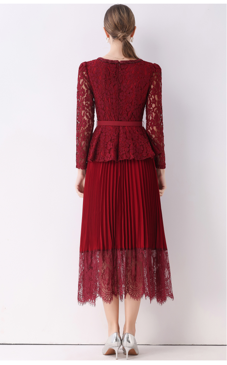 MY13876# 女裝貨源法式翻领蕾丝拼接收腰压褶连衣裙女秋季小香风长裙子送腰带女裝貨源服裝批發服裝批發
