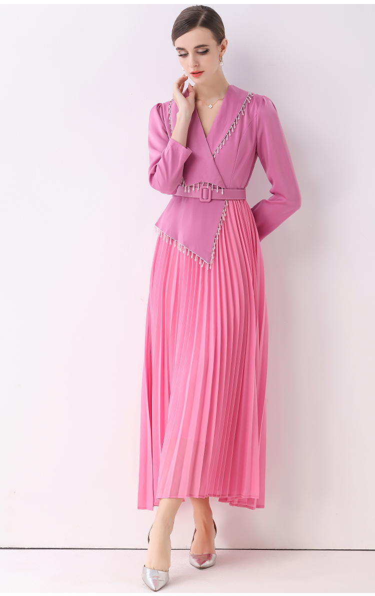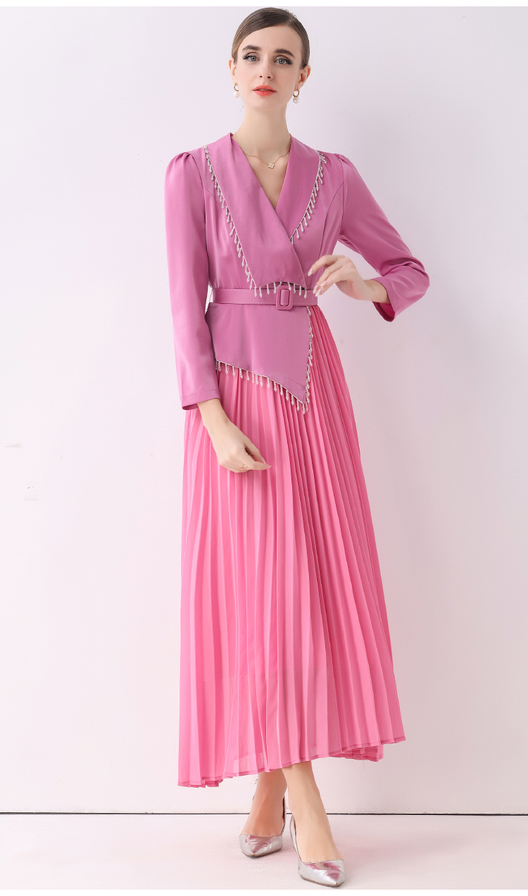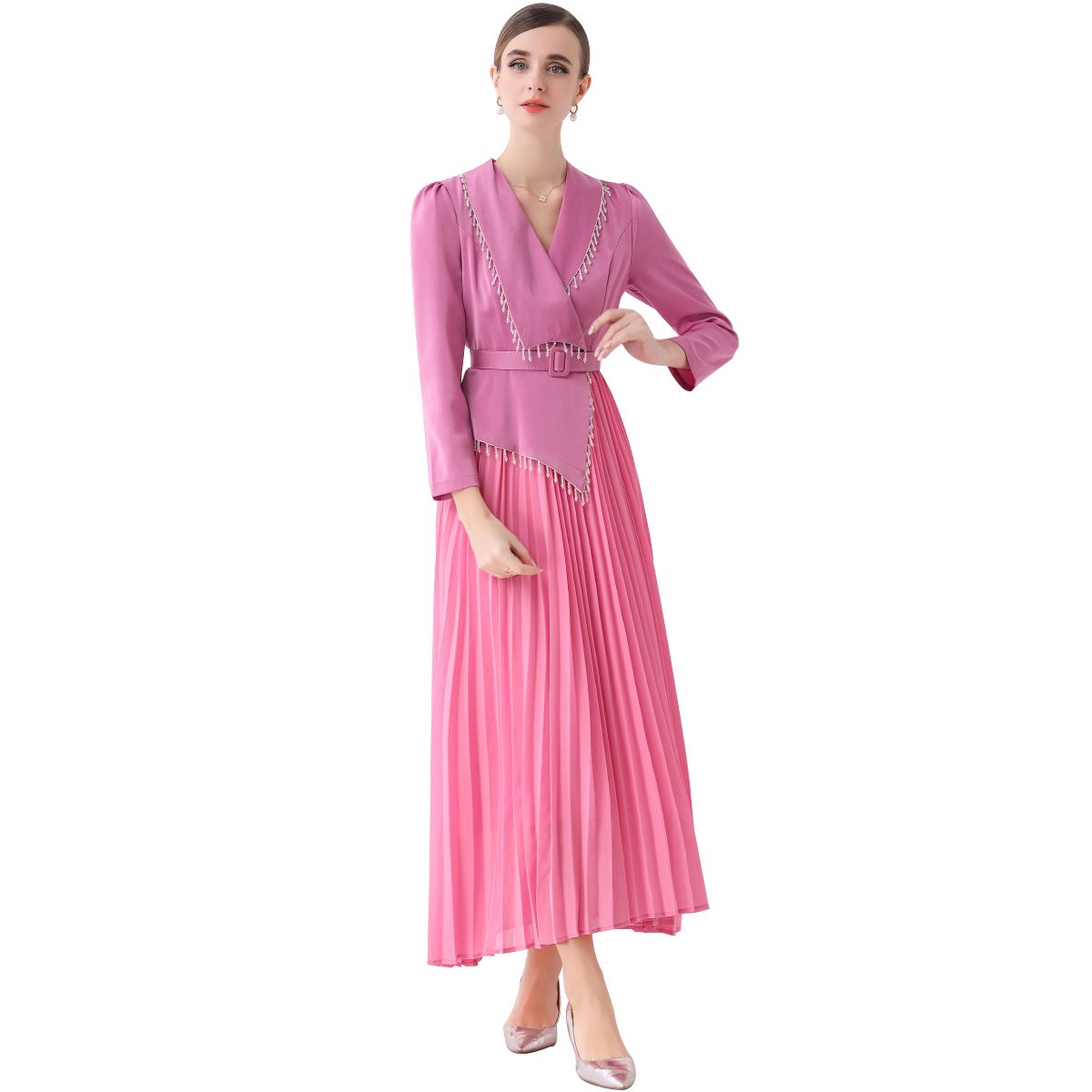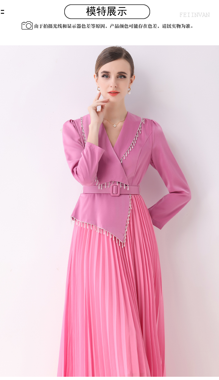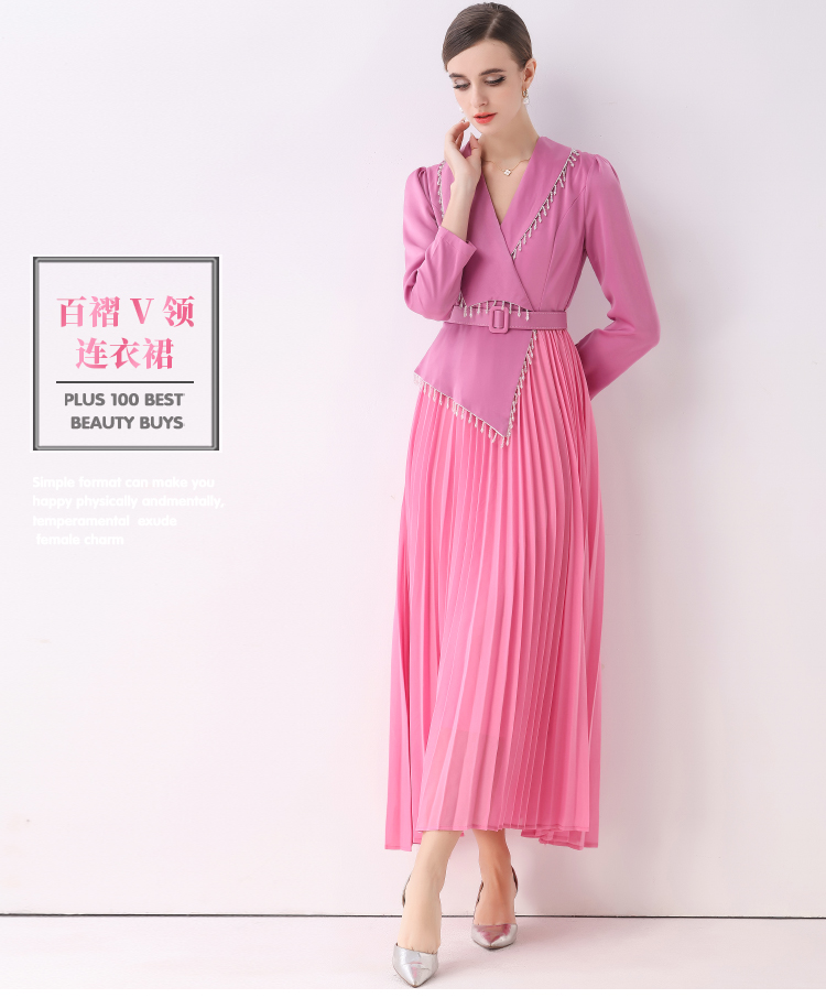 MY13878# 女裝貨源新款气质修身钉珠西装裙女显瘦长款百褶连衣裙V领送腰带女裝貨源服裝批發服裝批發