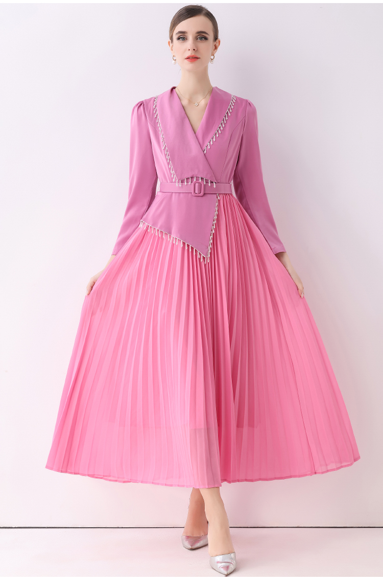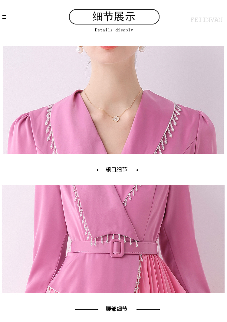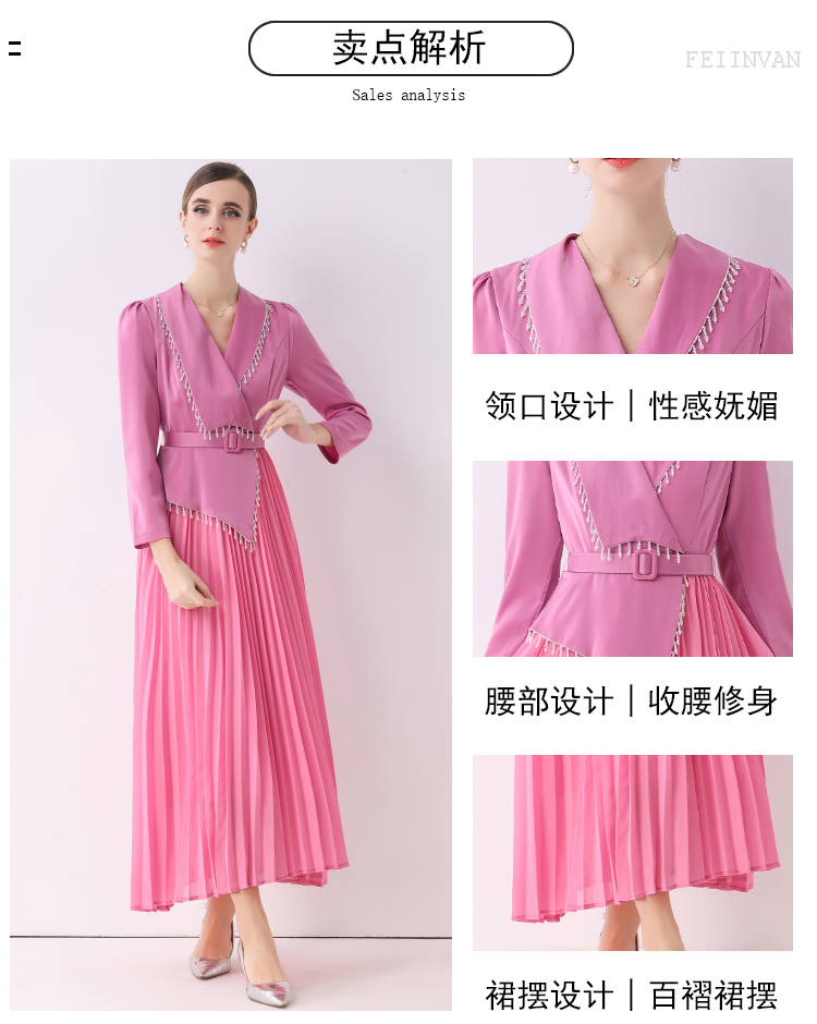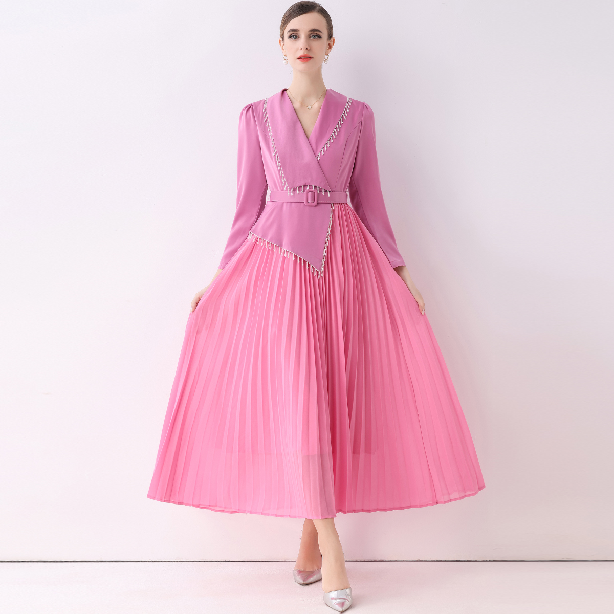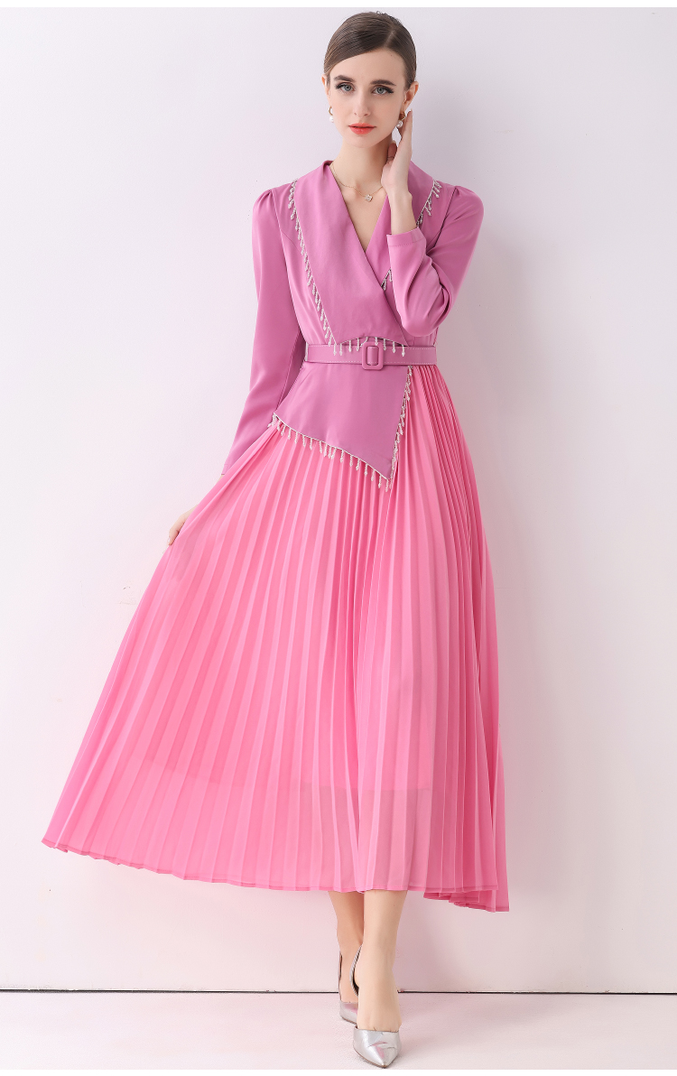 MY13878# 女裝貨源新款气质修身钉珠西装裙女显瘦长款百褶连衣裙V领送腰带女裝貨源服裝批發服裝批發