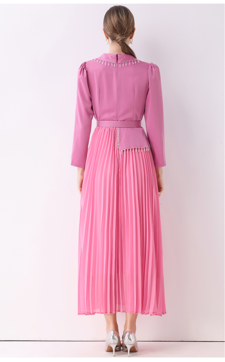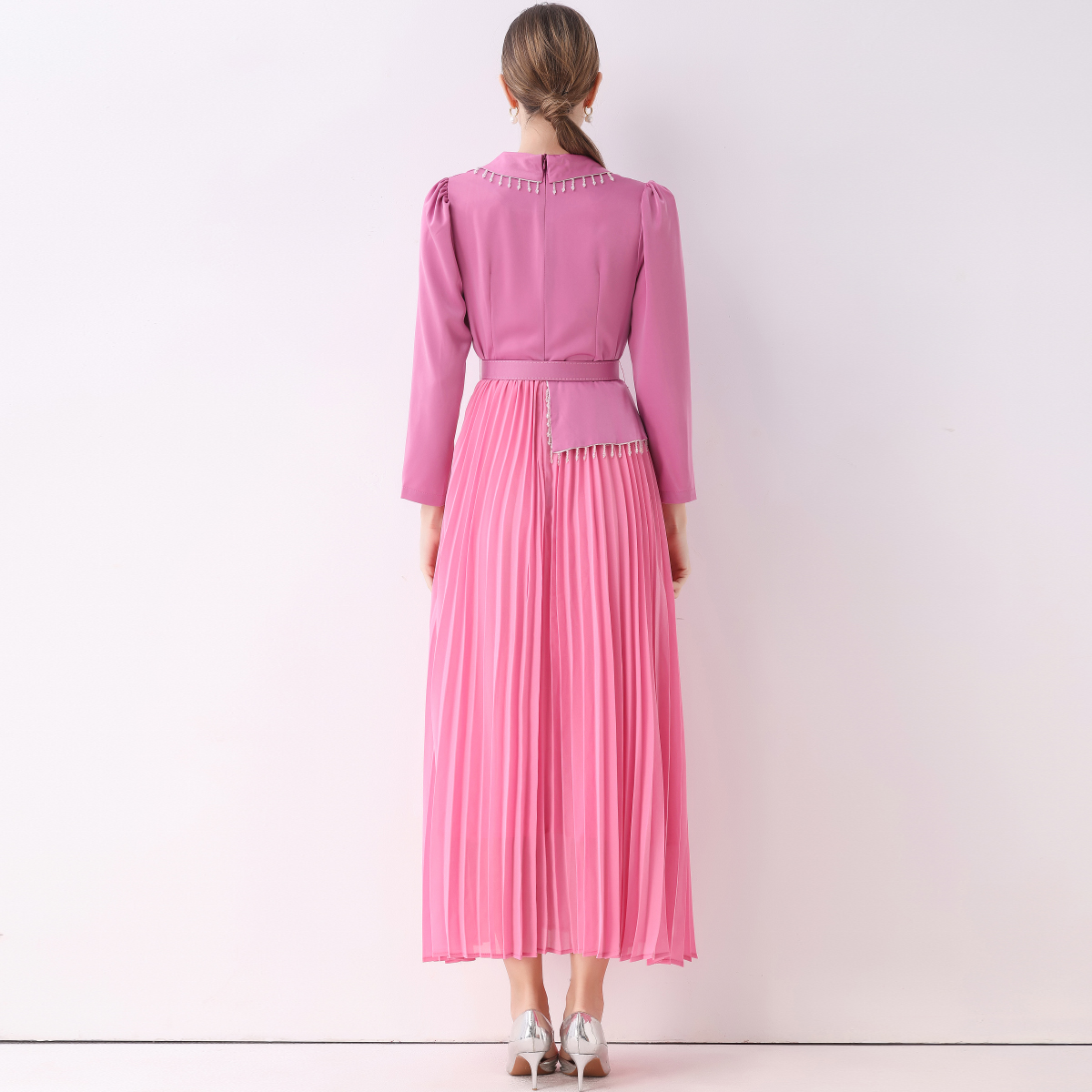 MY13879# 女裝貨源新款气质修身钉珠西装裙女显瘦长款百褶连衣裙V领送...