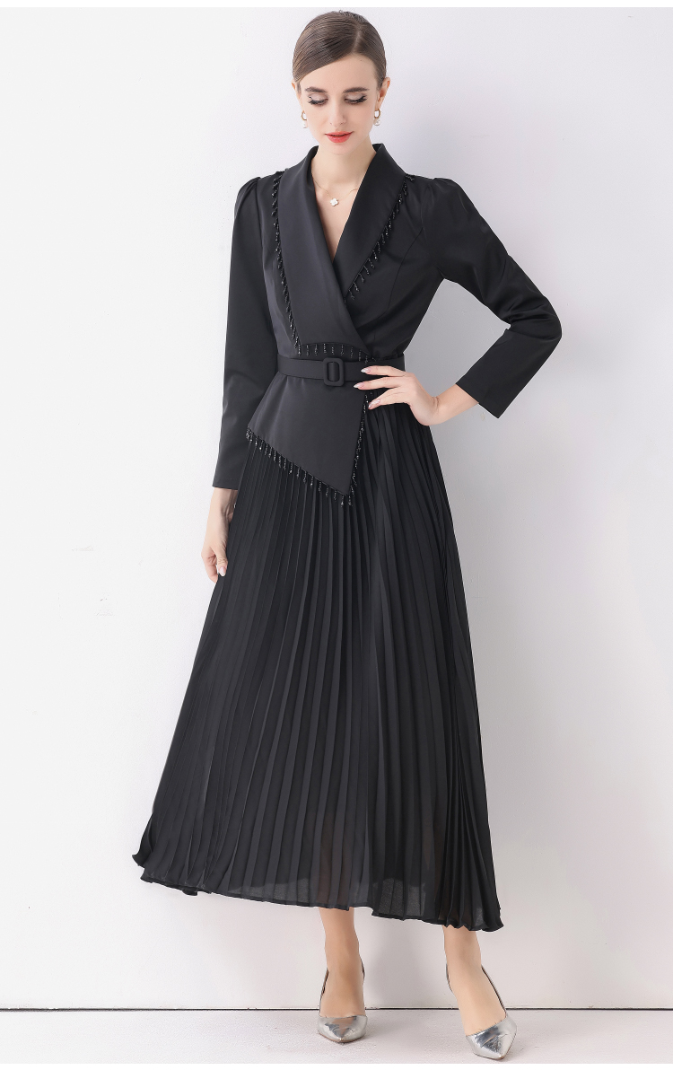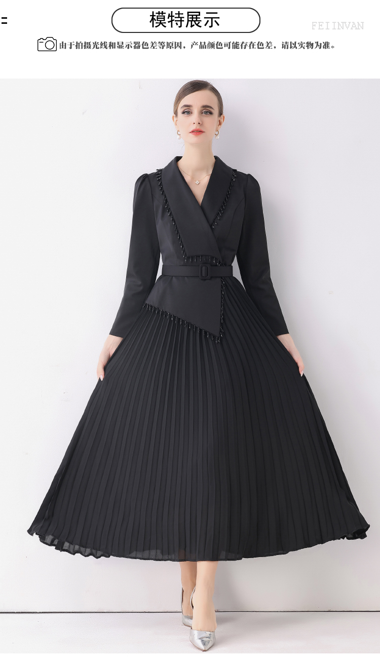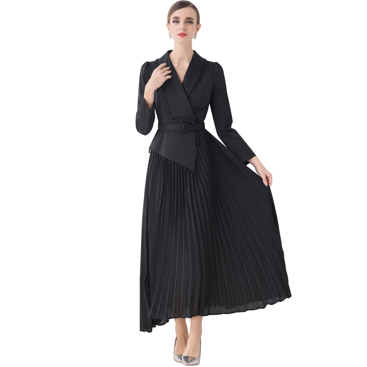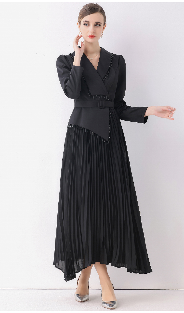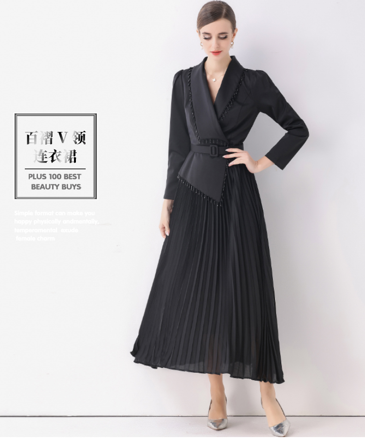 MY13879# 女裝貨源新款气质修身钉珠西装裙女显瘦长款百褶连衣裙V领送腰带女裝貨源服裝批發服裝批發