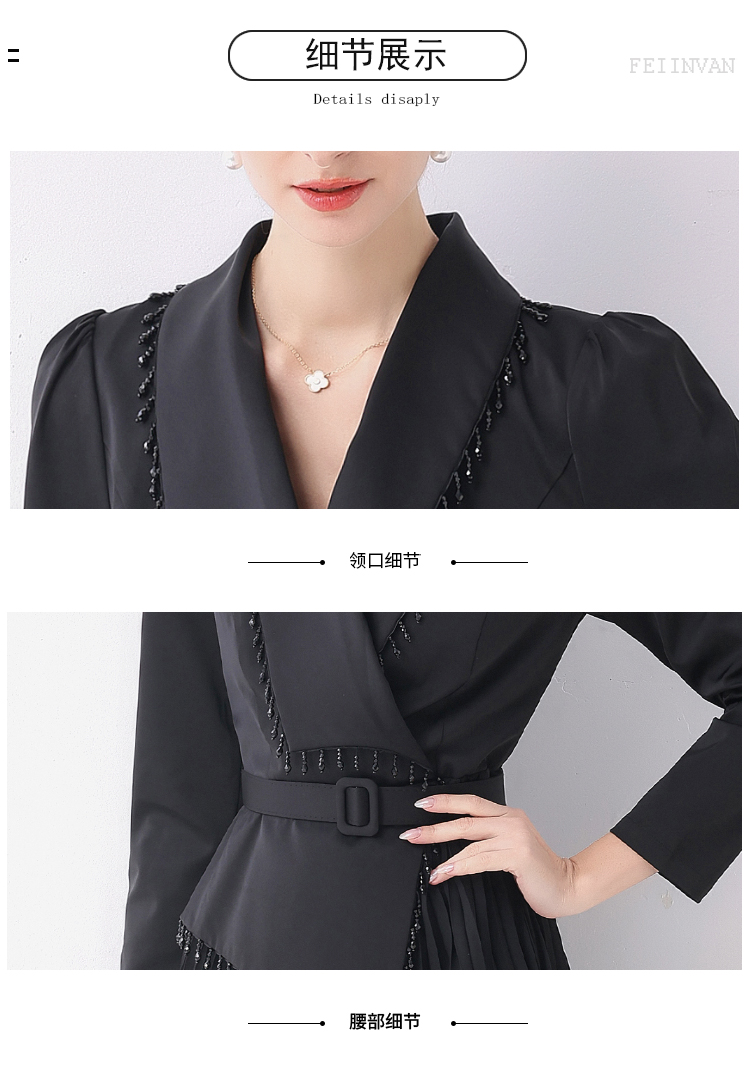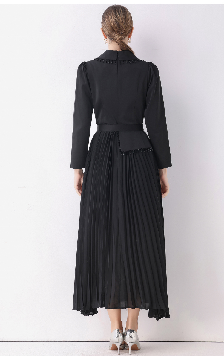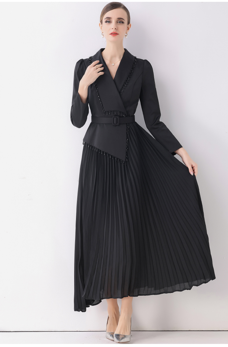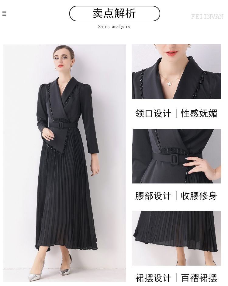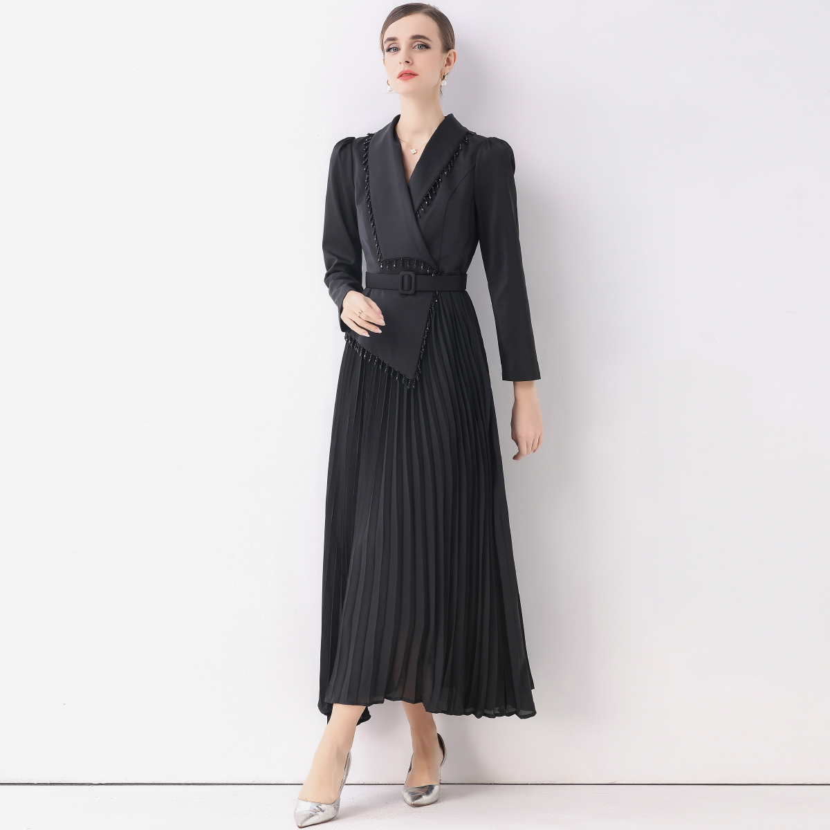MY13879# 女裝貨源新款气质修身钉珠西装裙女显瘦长款百褶连衣裙V领送腰带女裝貨源服裝批發服裝批發