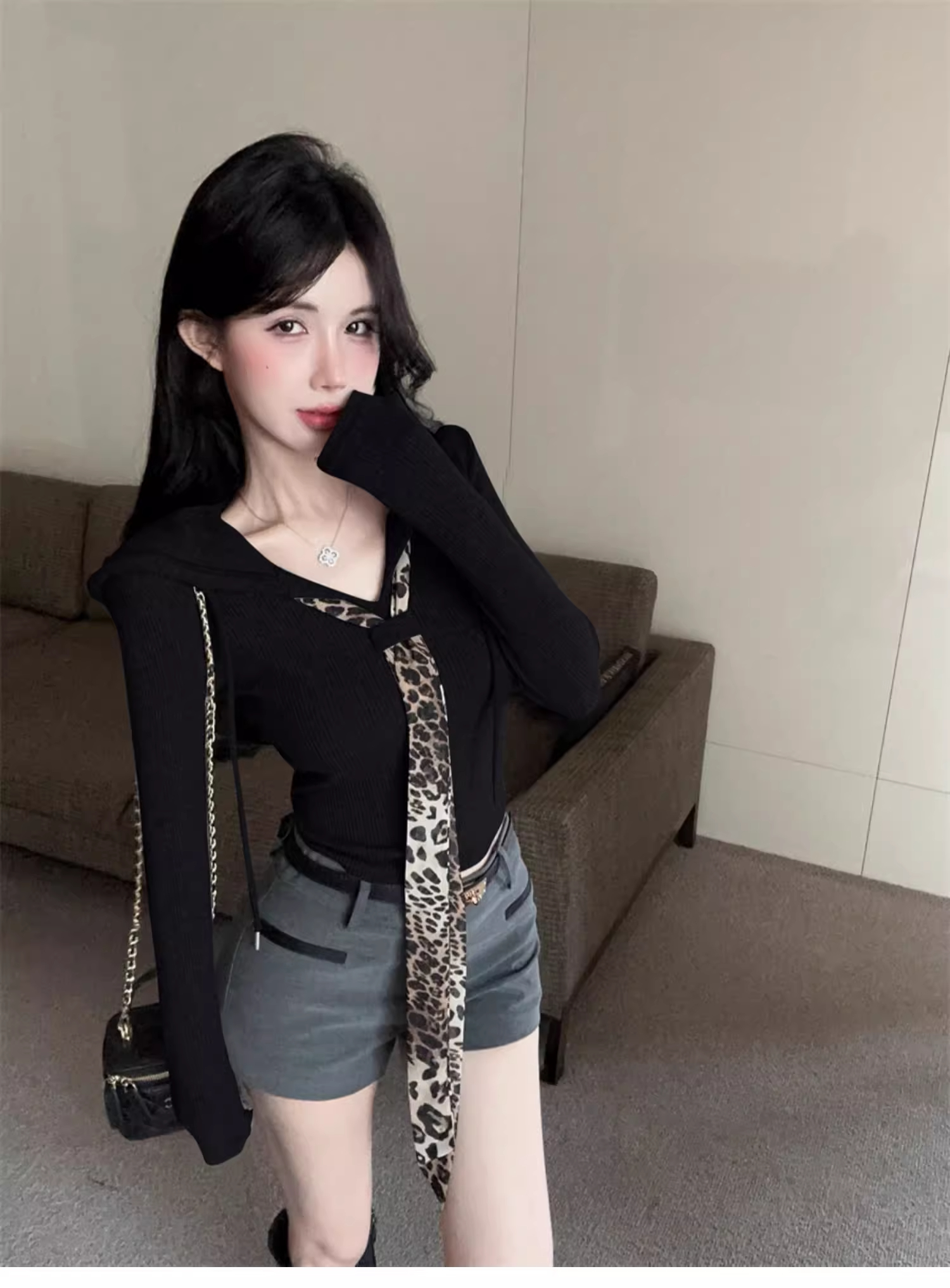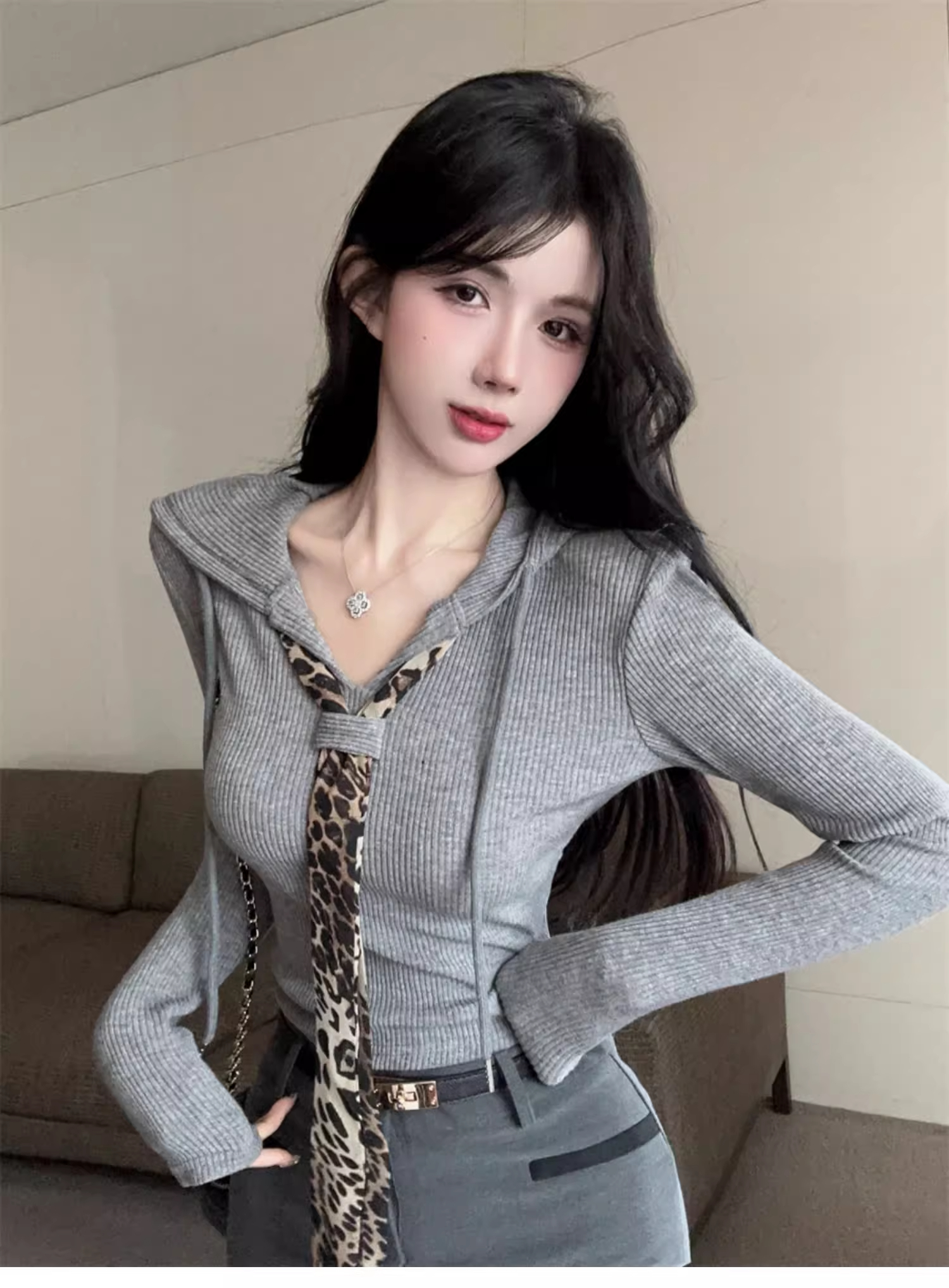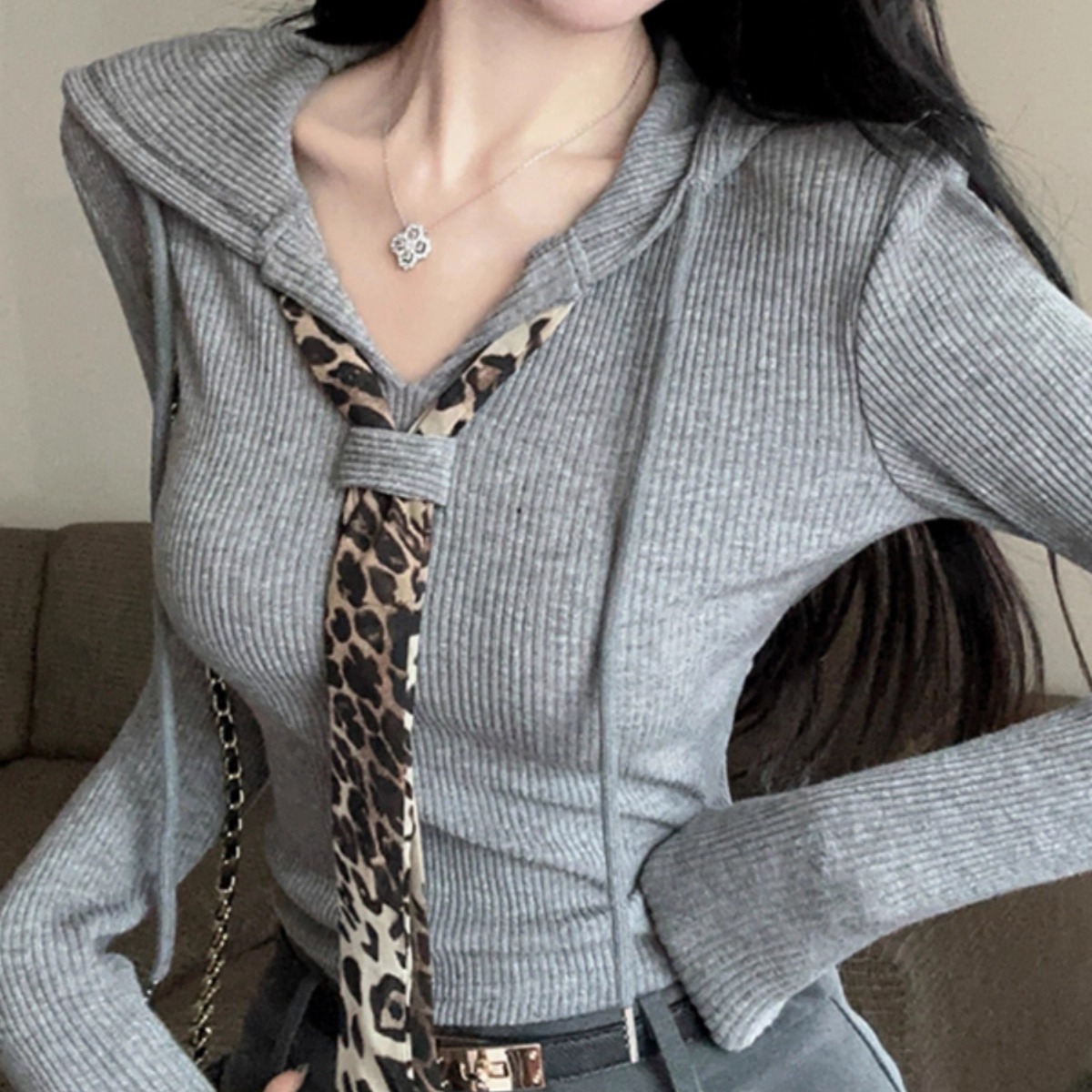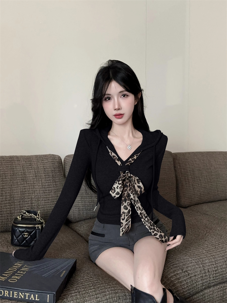 MY13992# 羊绒德绒御姐连帽豹纹领带拼接长袖设计感V领修身打底衫女裝貨源服裝批發