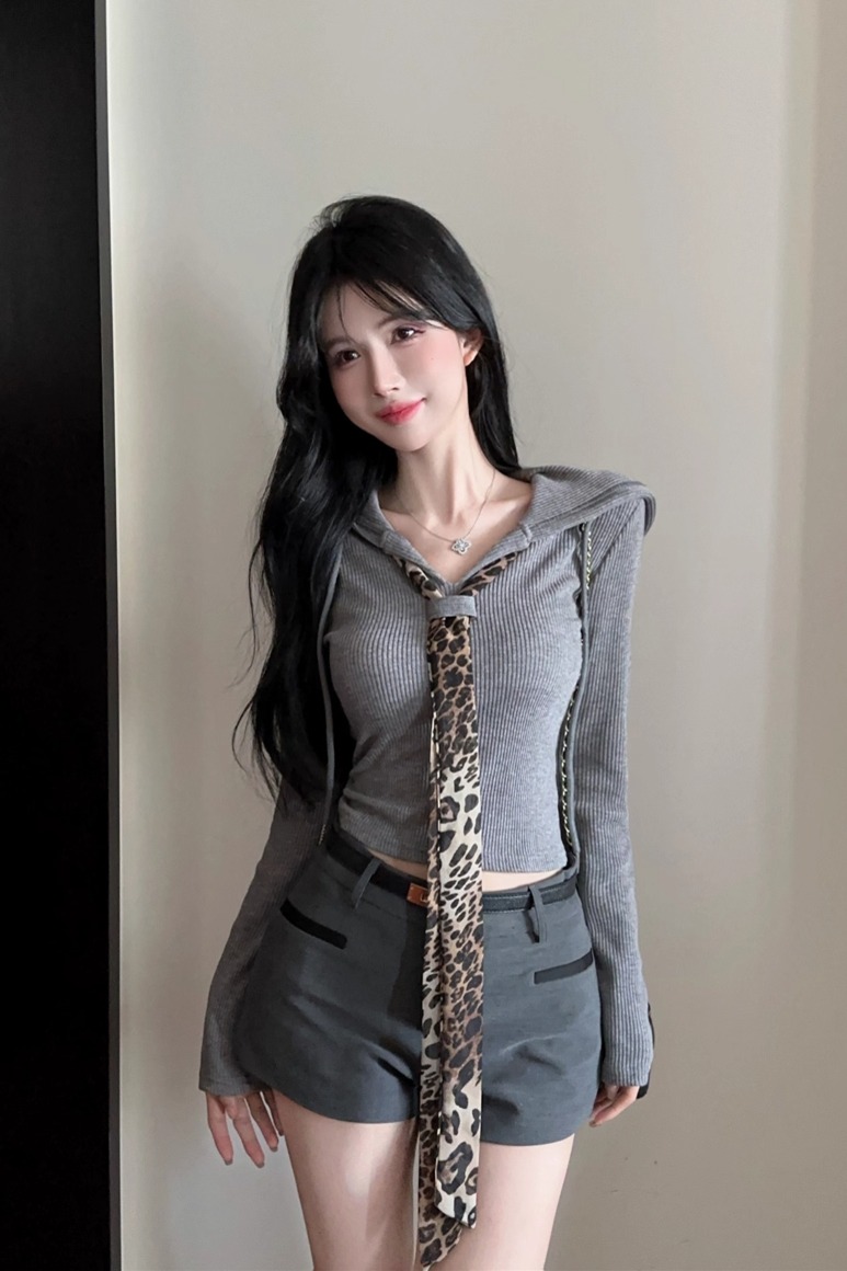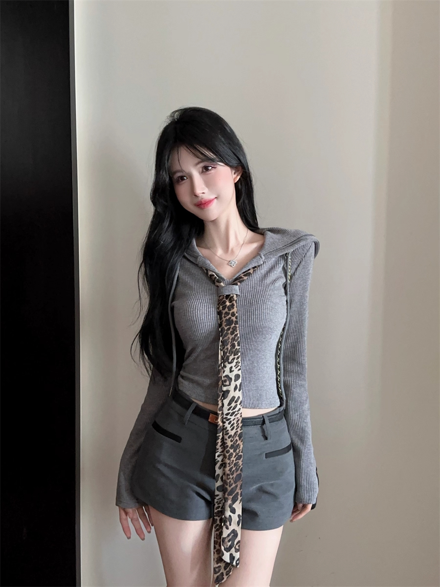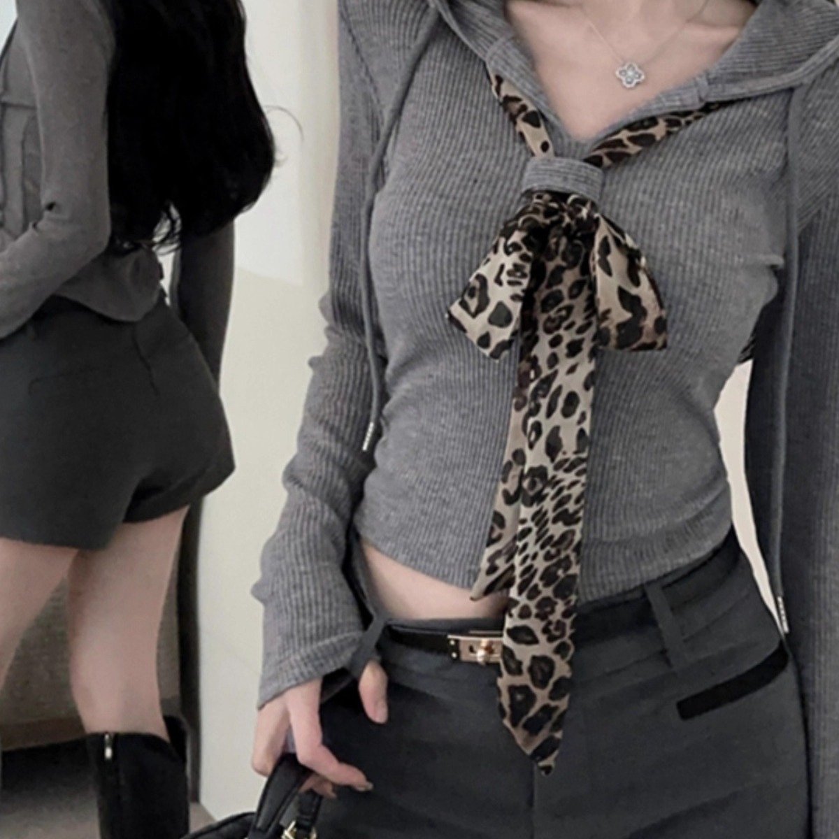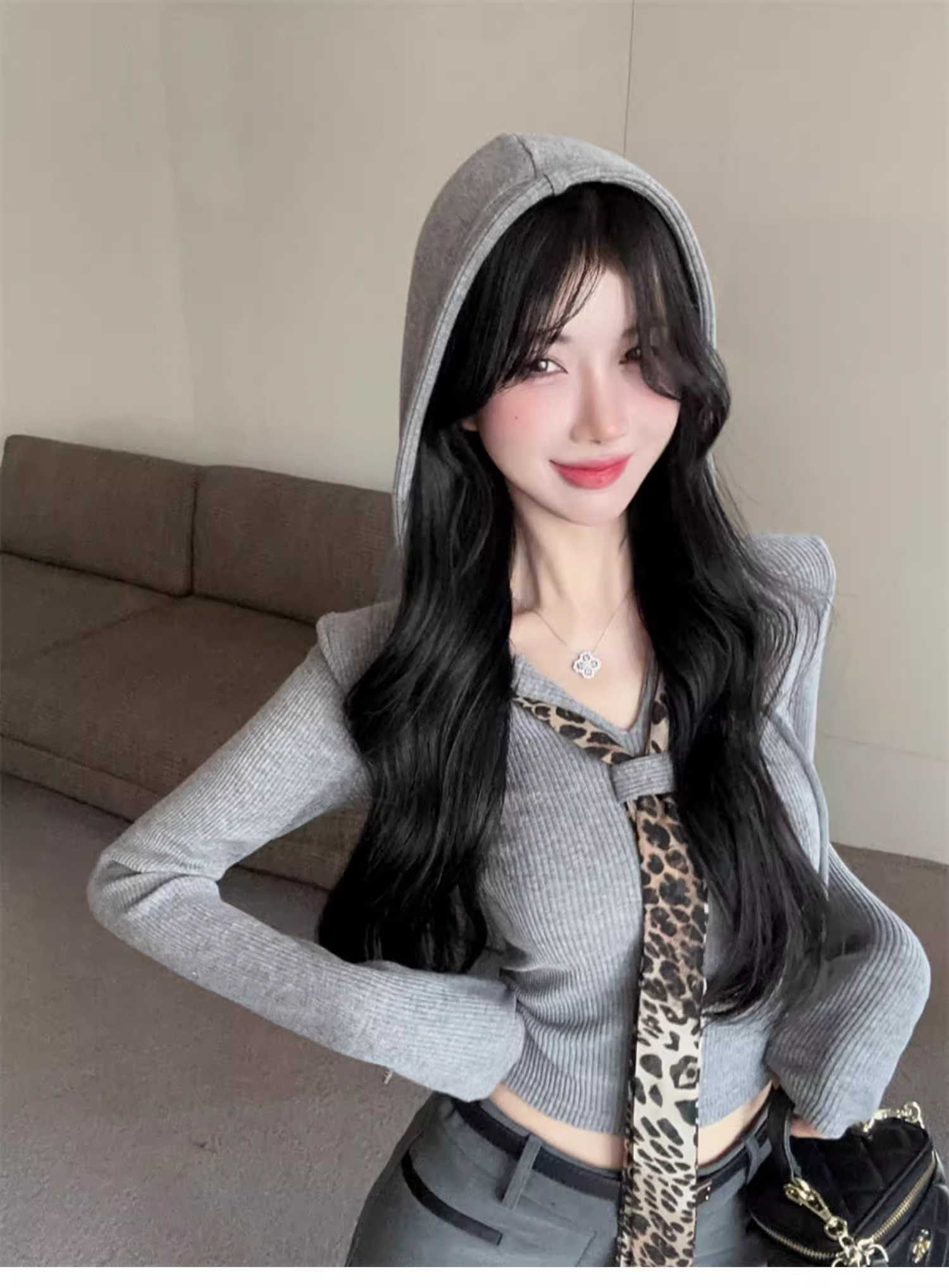 MY13992# 羊绒德绒御姐连帽豹纹领带拼接长袖设计感V领修身打底衫女裝貨源服裝批發