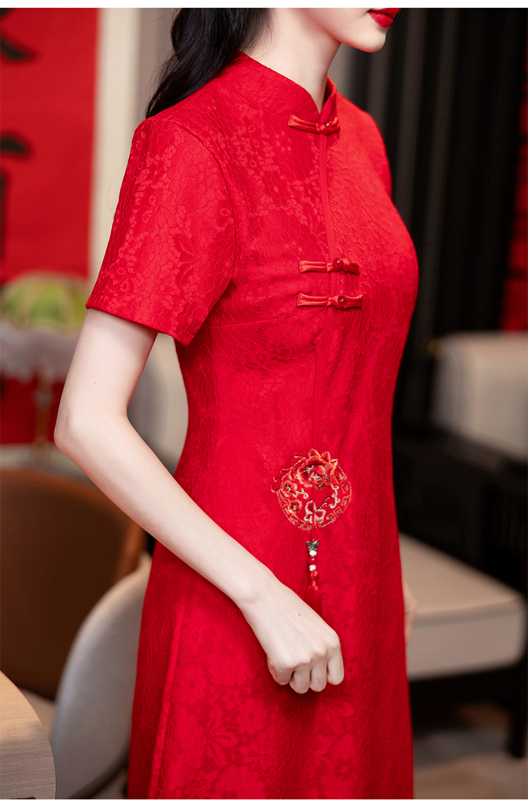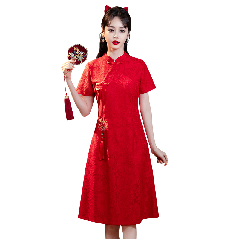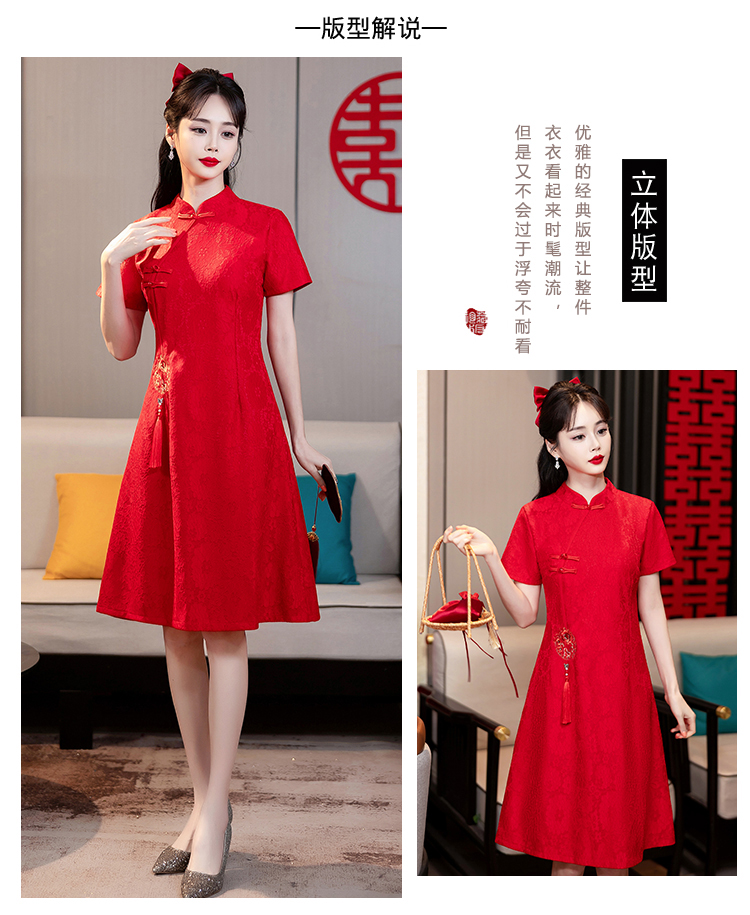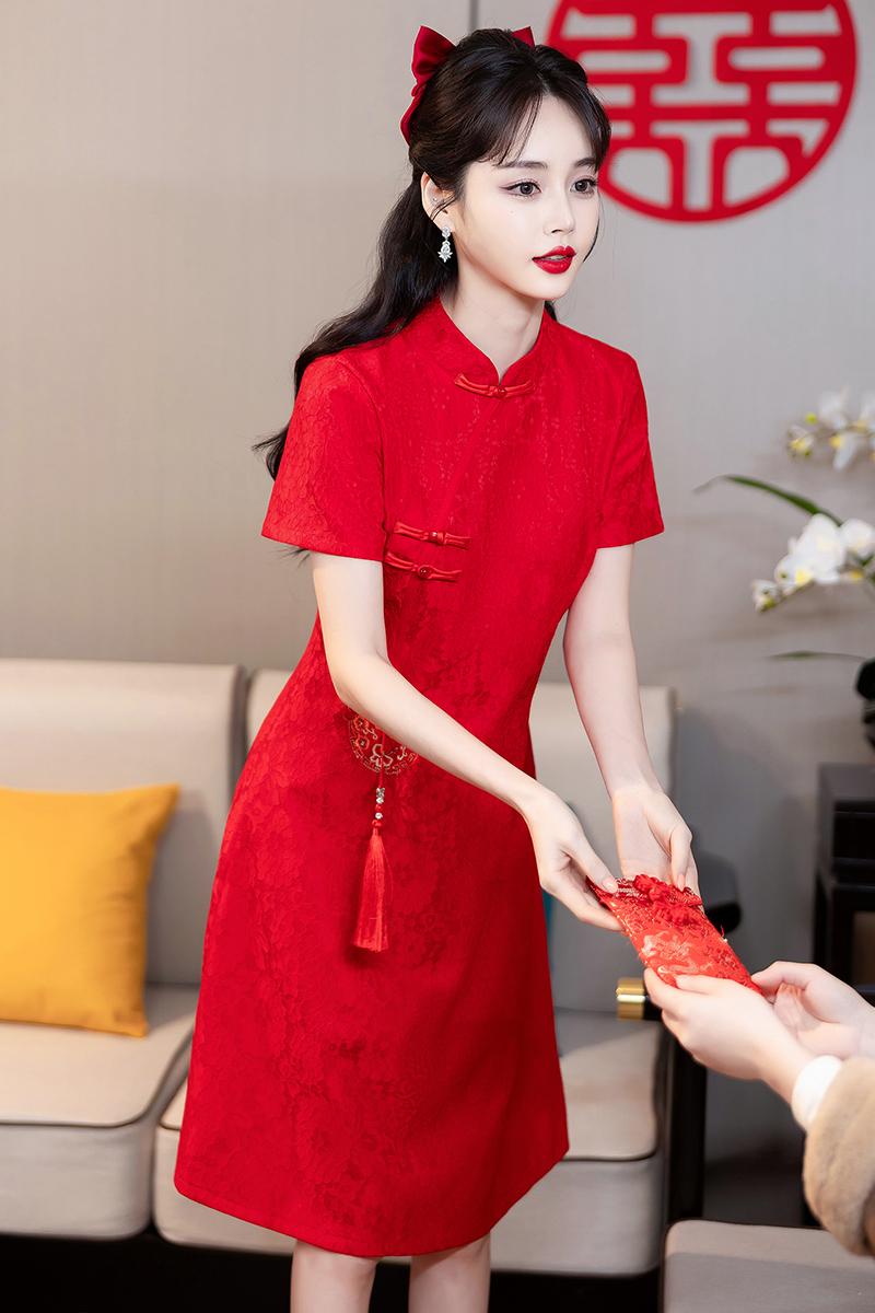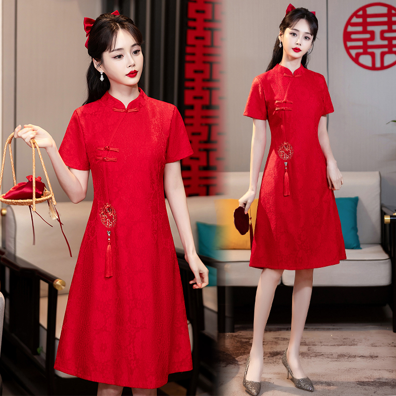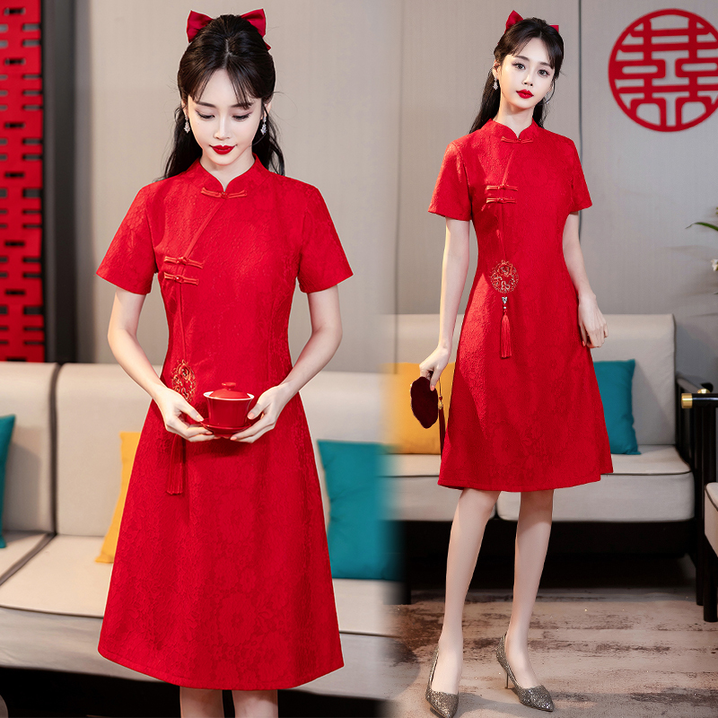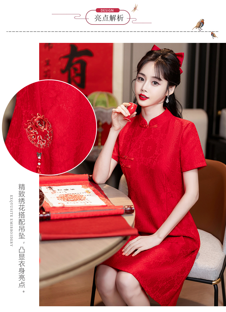 MY14353#改良旗袍新国风红色年轻款绣花礼服订婚连衣裙