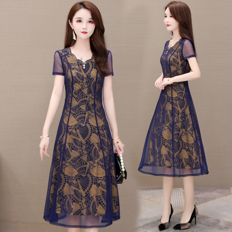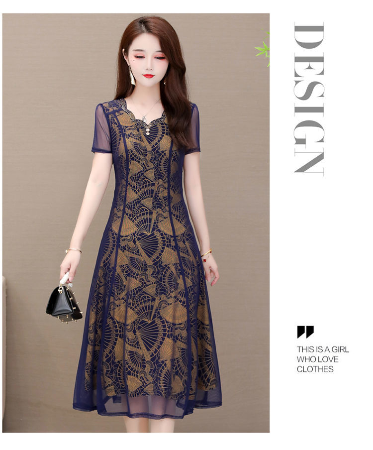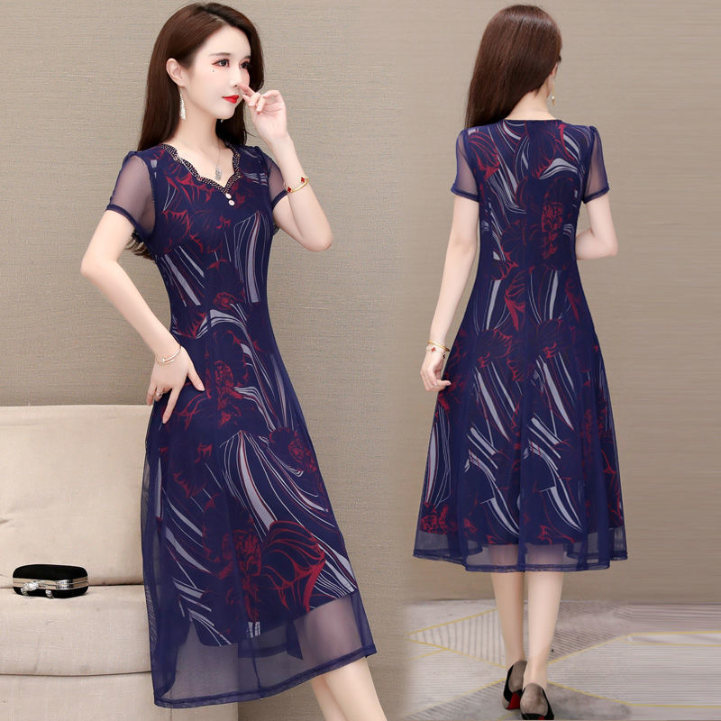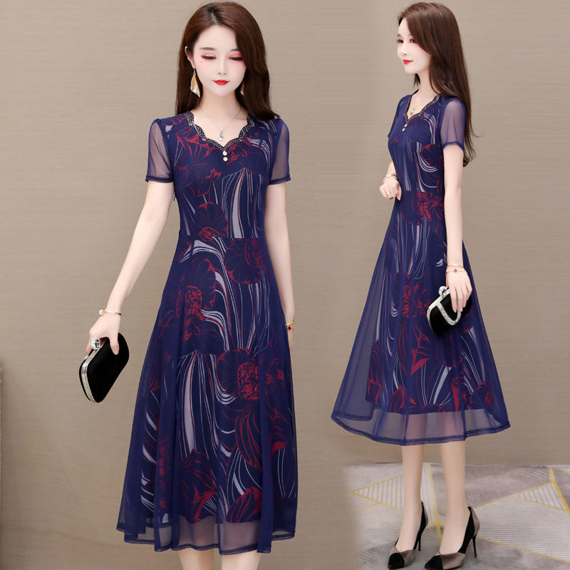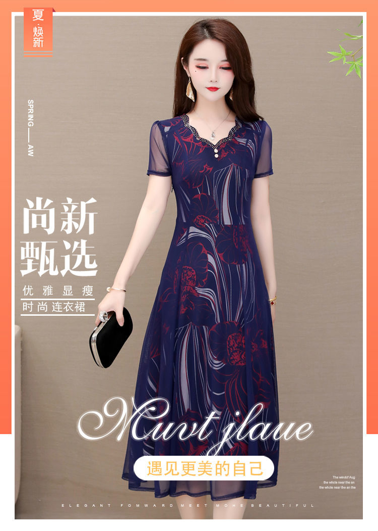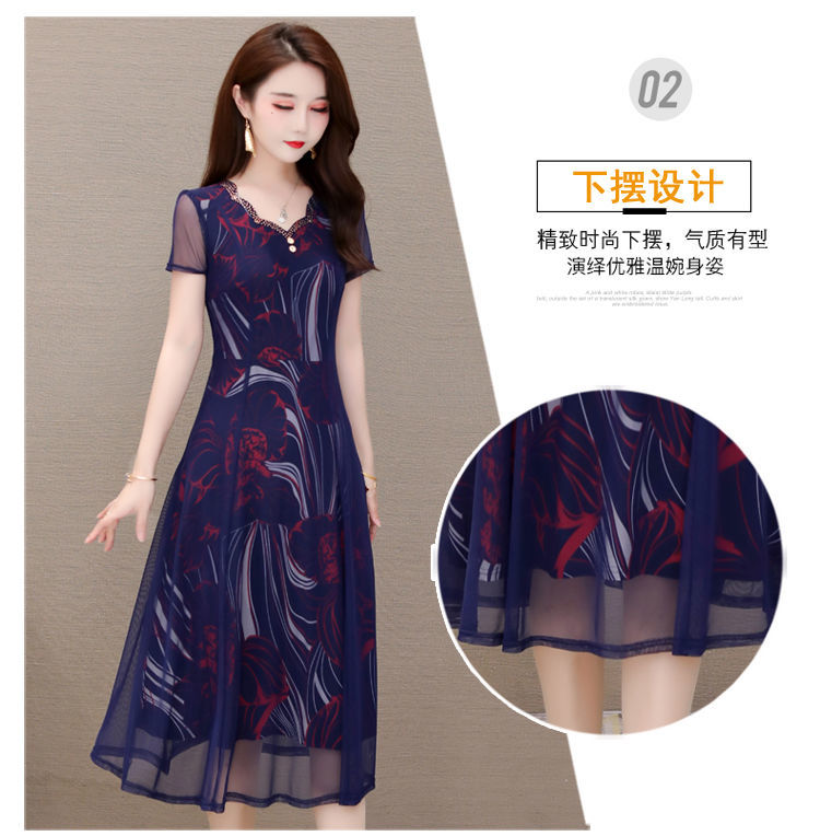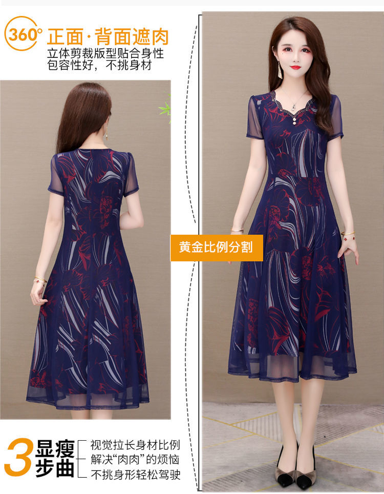 MY14368# 网纱碎花连衣裙女夏季新款洋气修身35岁时尚中长款短袖a字裙女裝貨源服裝批發