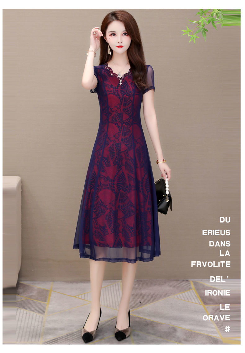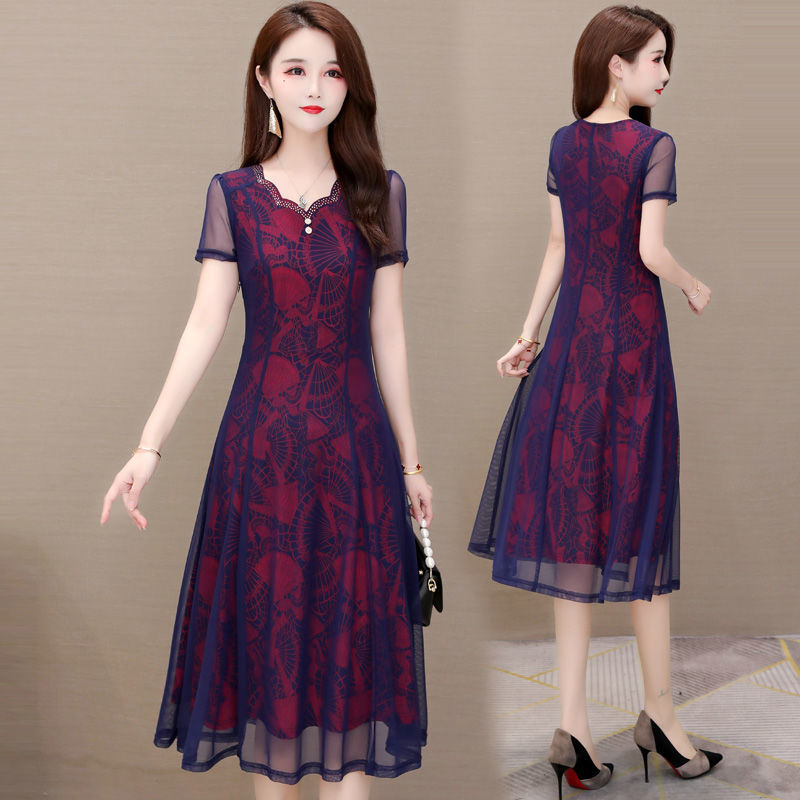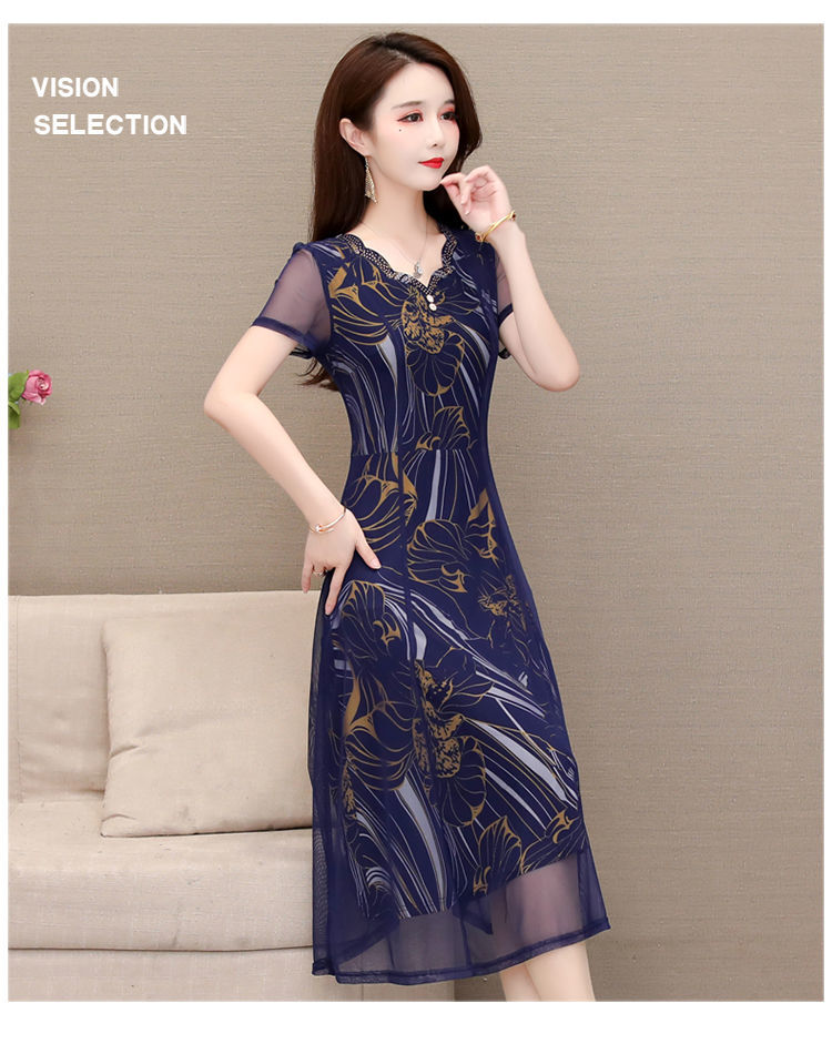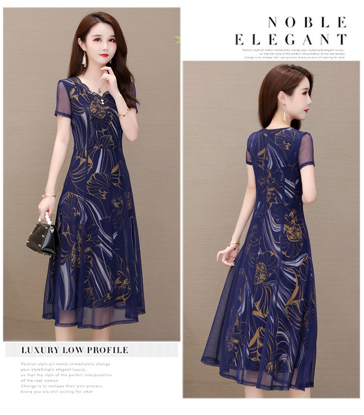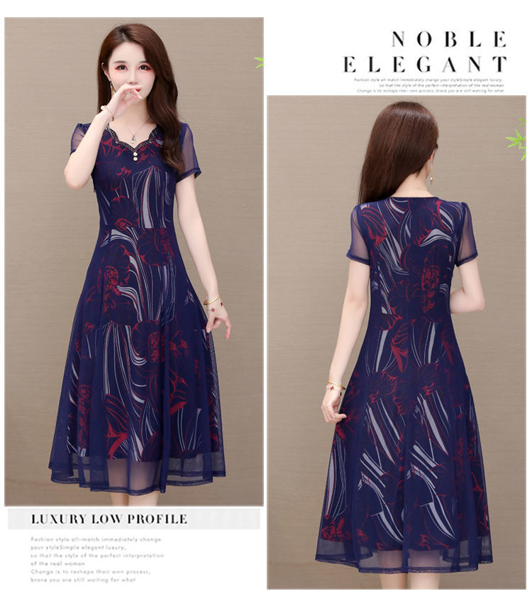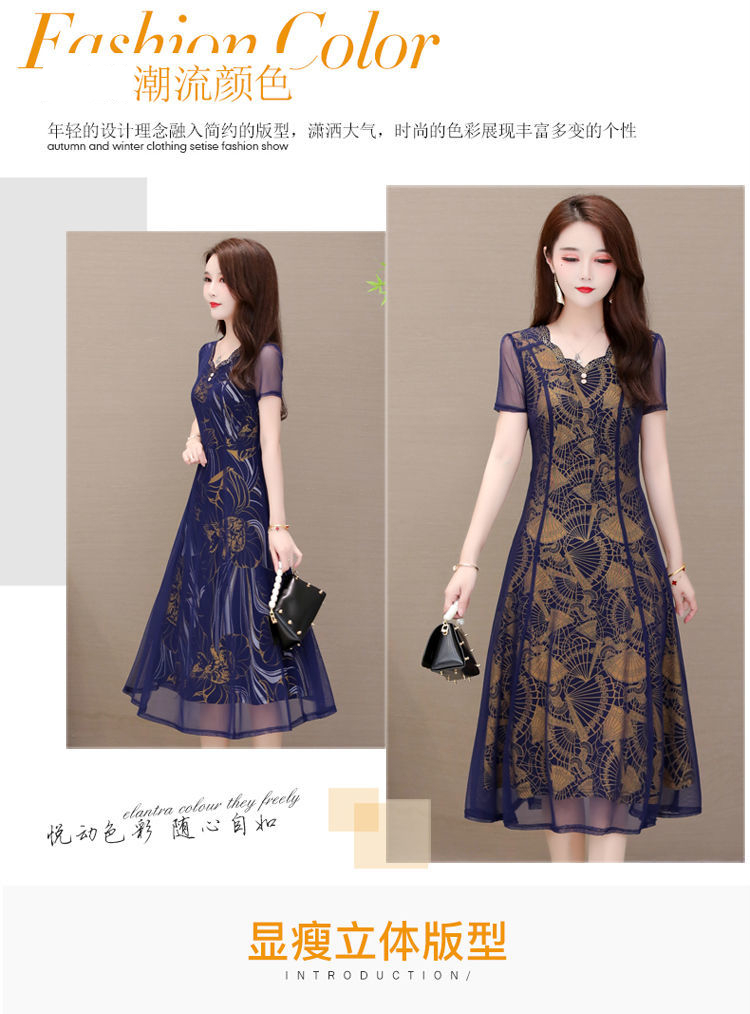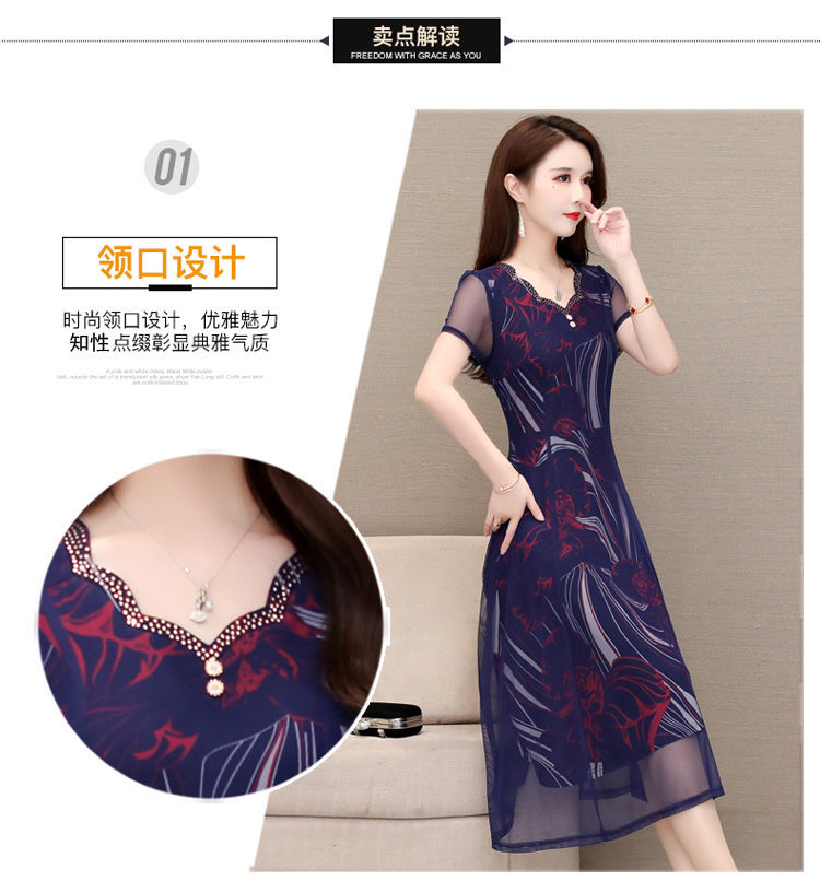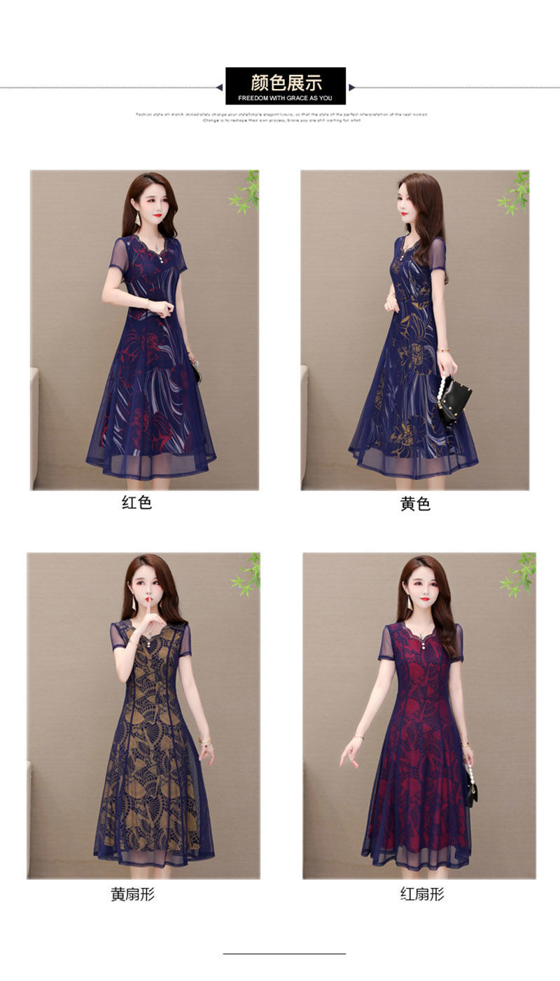 MY14368# 网纱碎花连衣裙女夏季新款洋气修身35岁时尚中长款短袖a字裙女裝貨源服裝批發