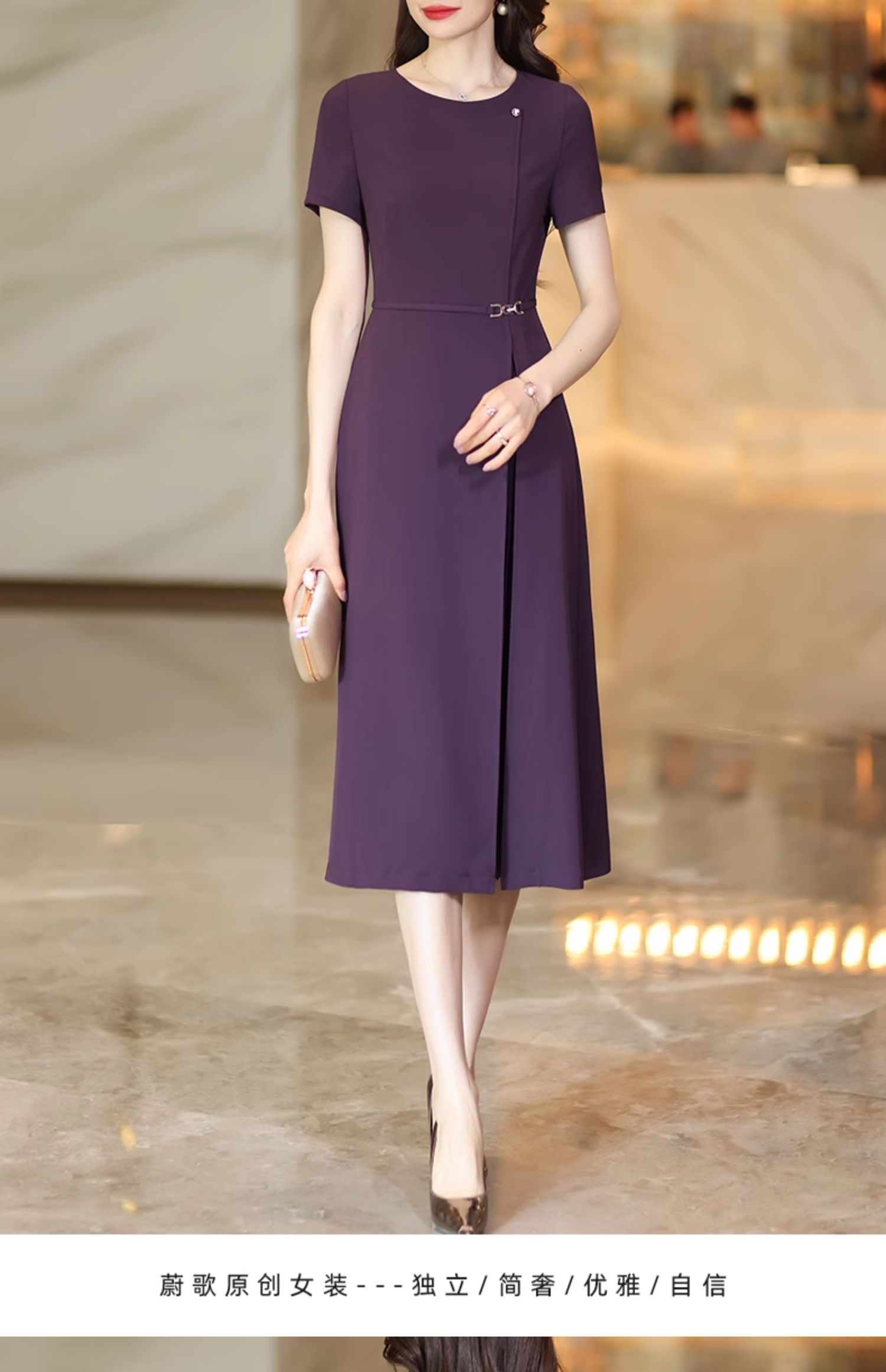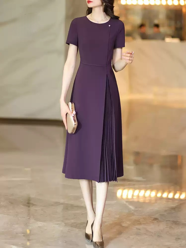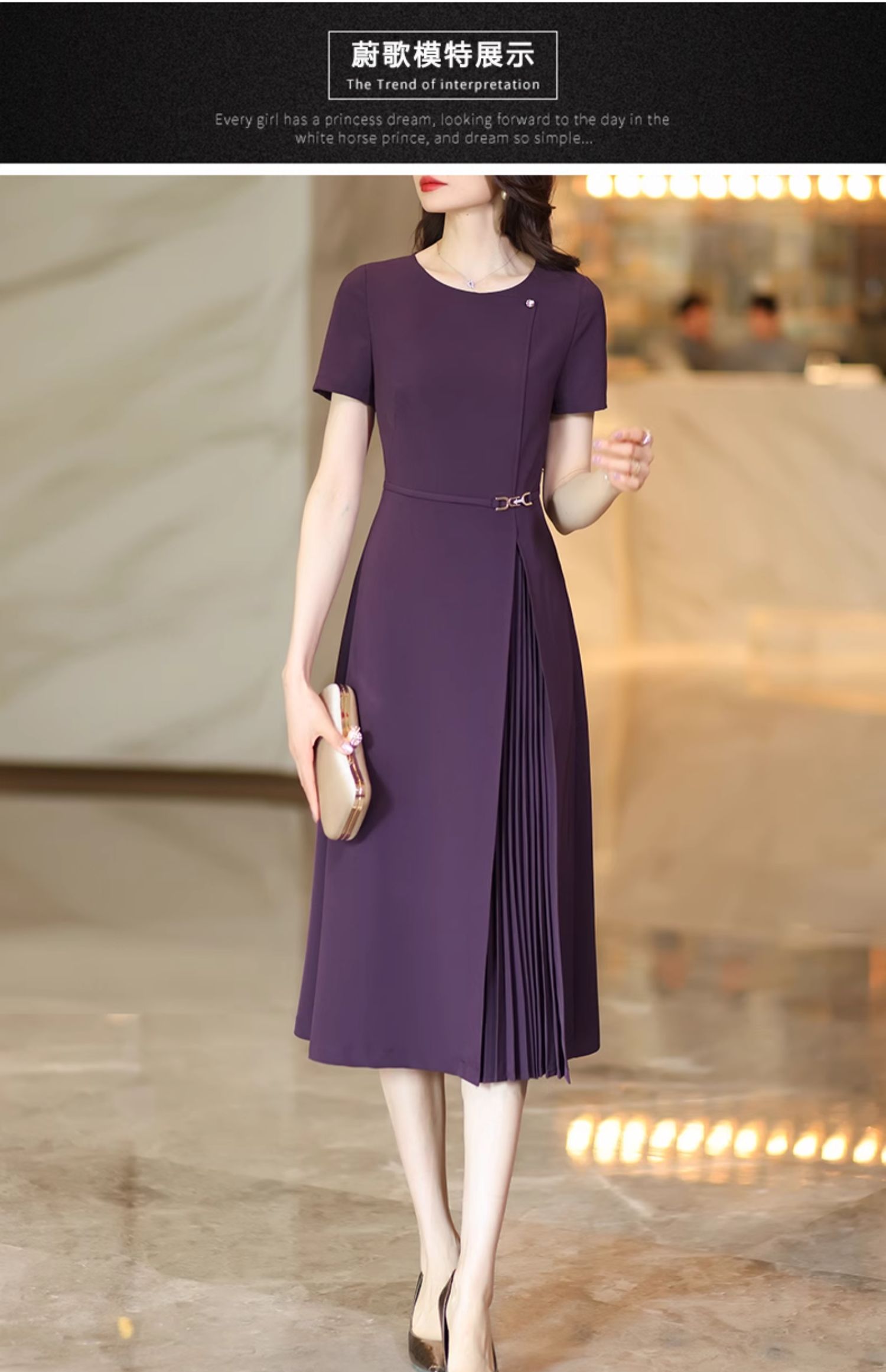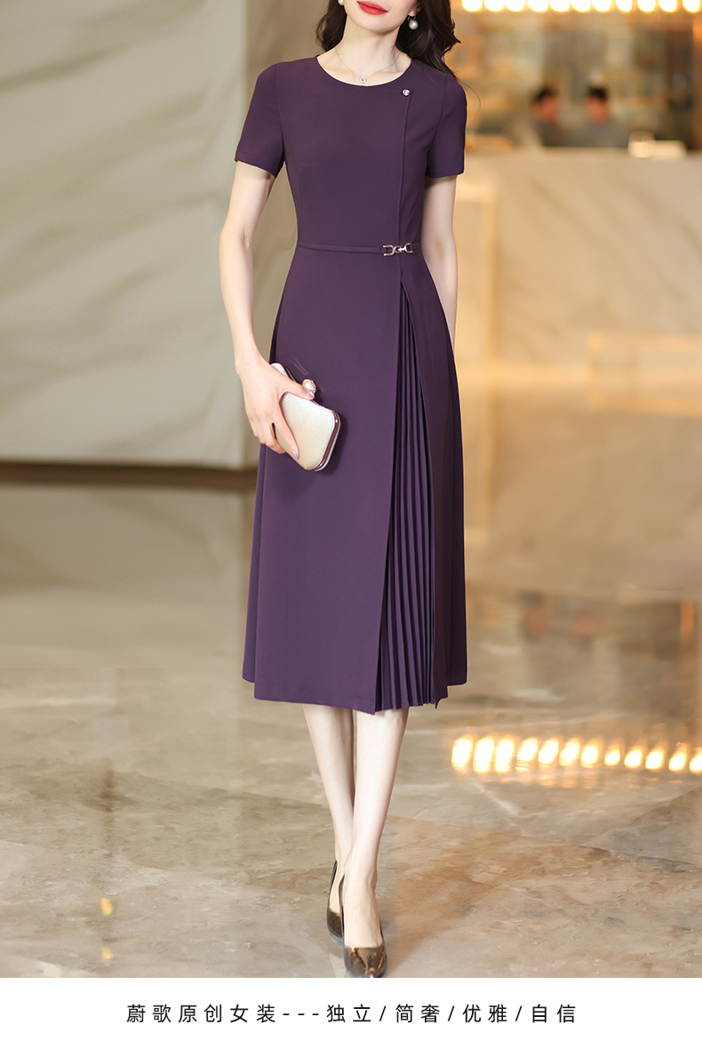 MY14372# 紫色百褶短袖连衣裙新款气质高级感通勤收腰显瘦中长裙女裝貨源服裝批發