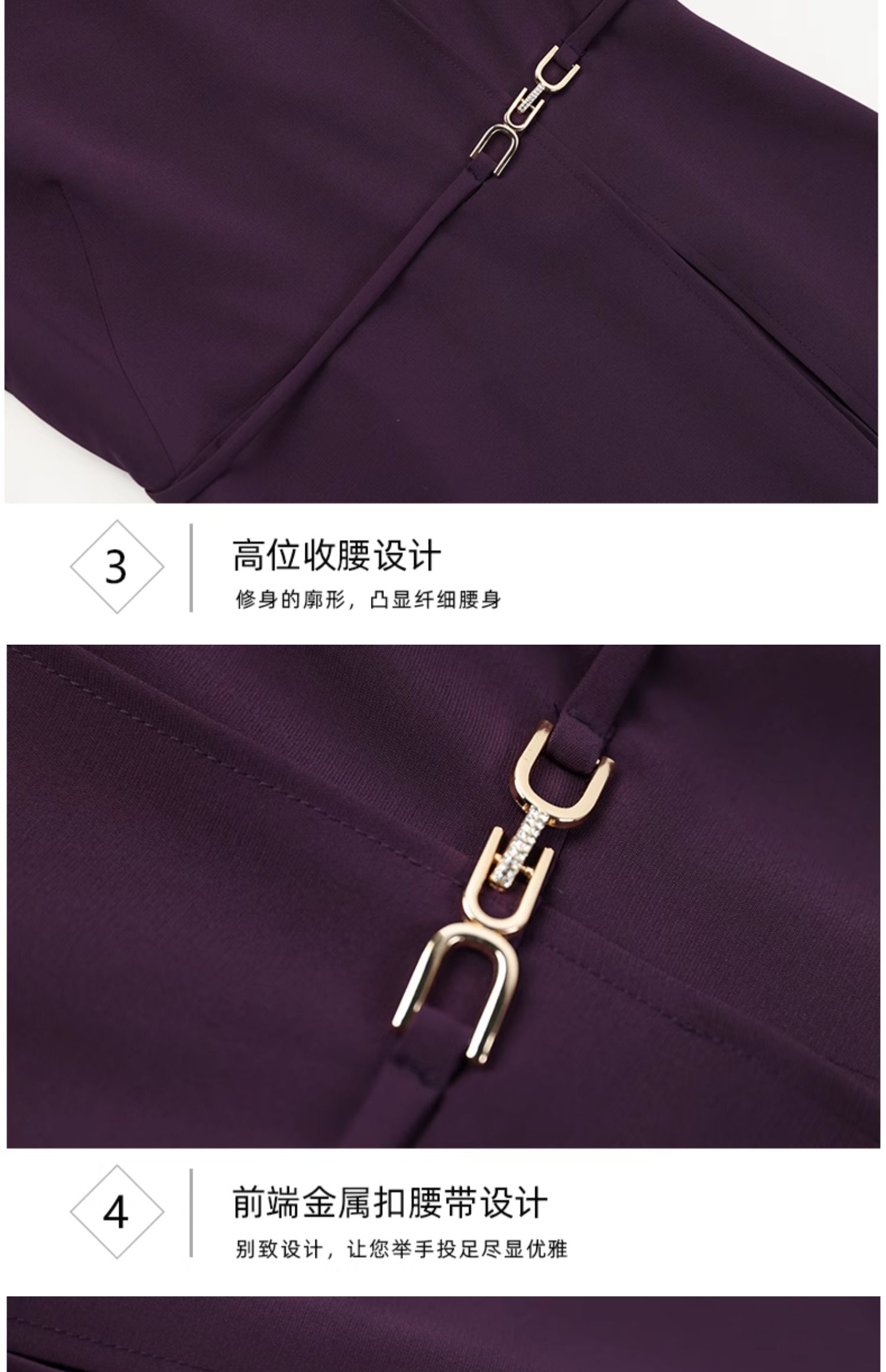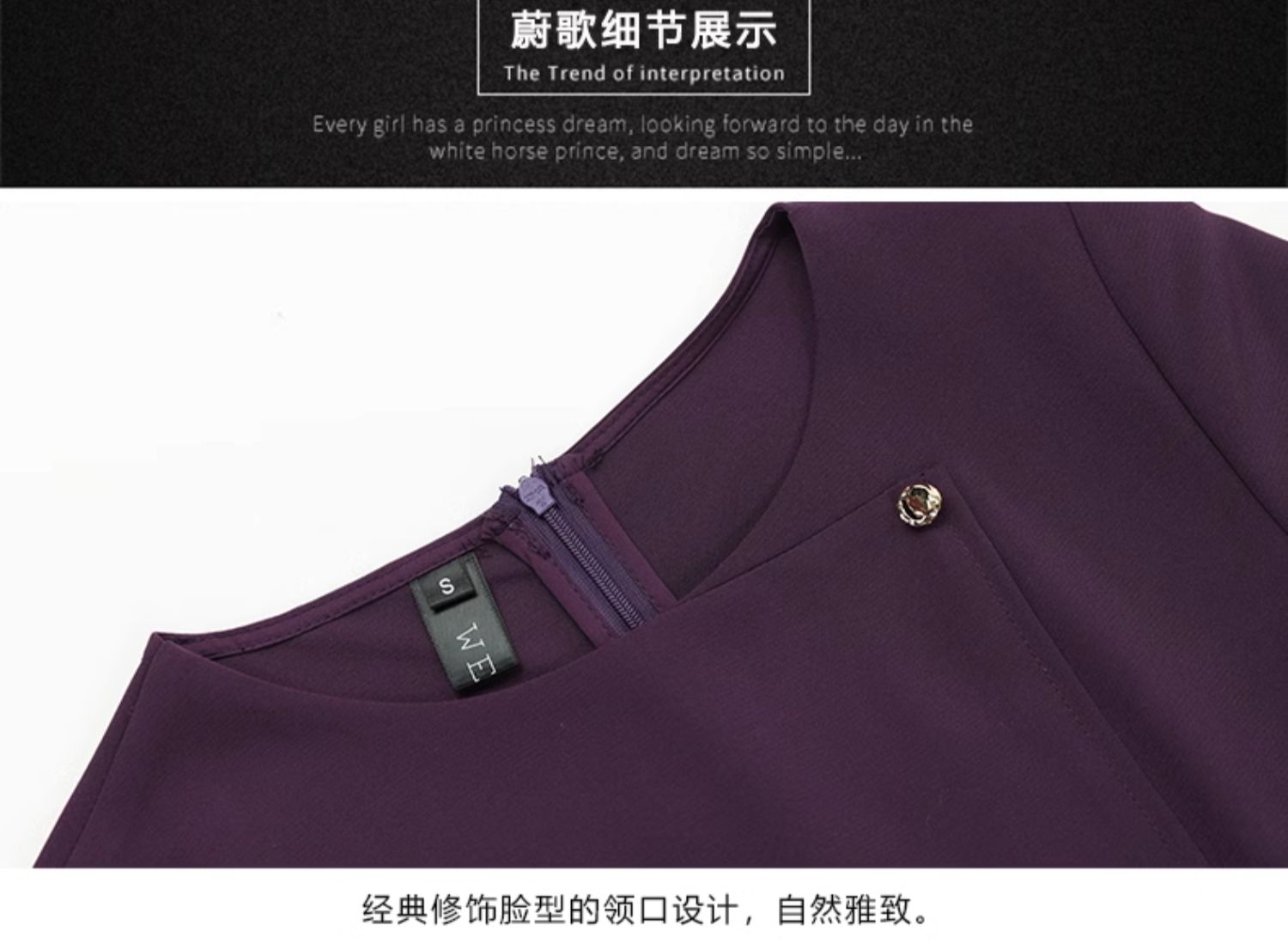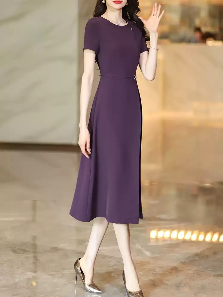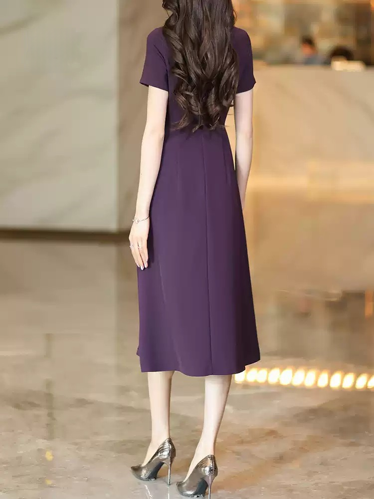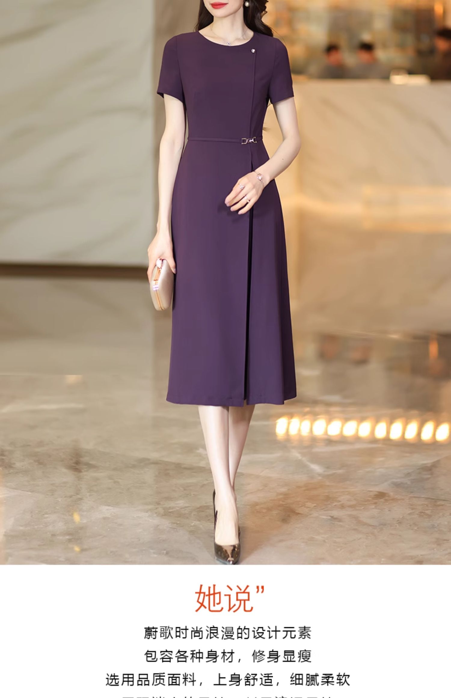 MY14372# 紫色百褶短袖连衣裙新款气质高级感通勤收腰显瘦中长裙女裝貨源服裝批發