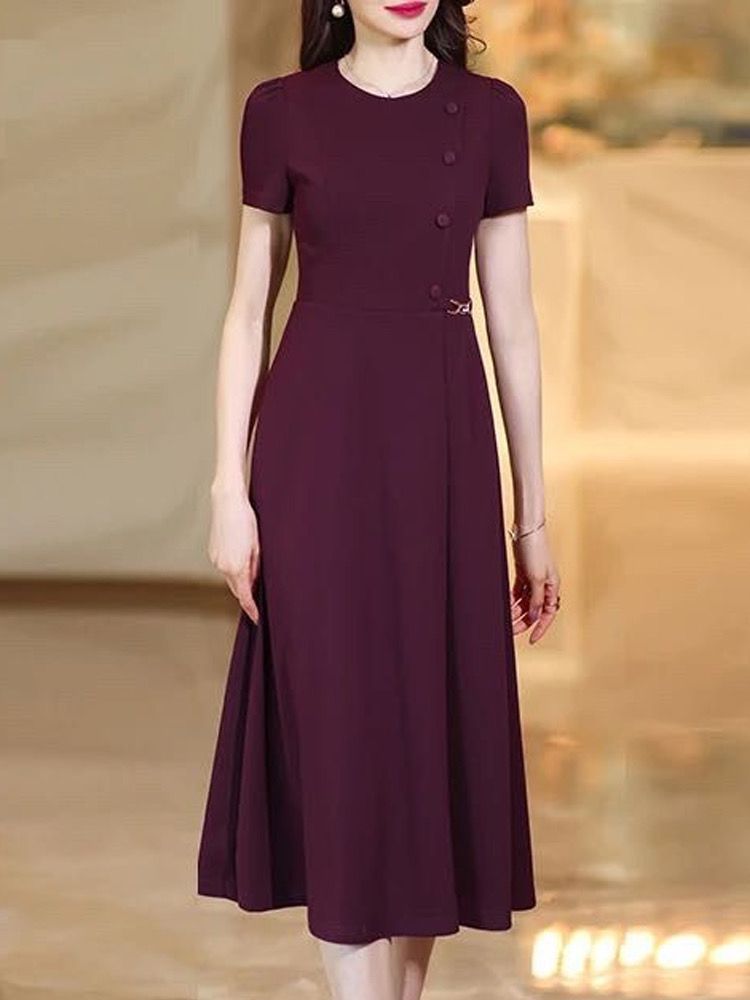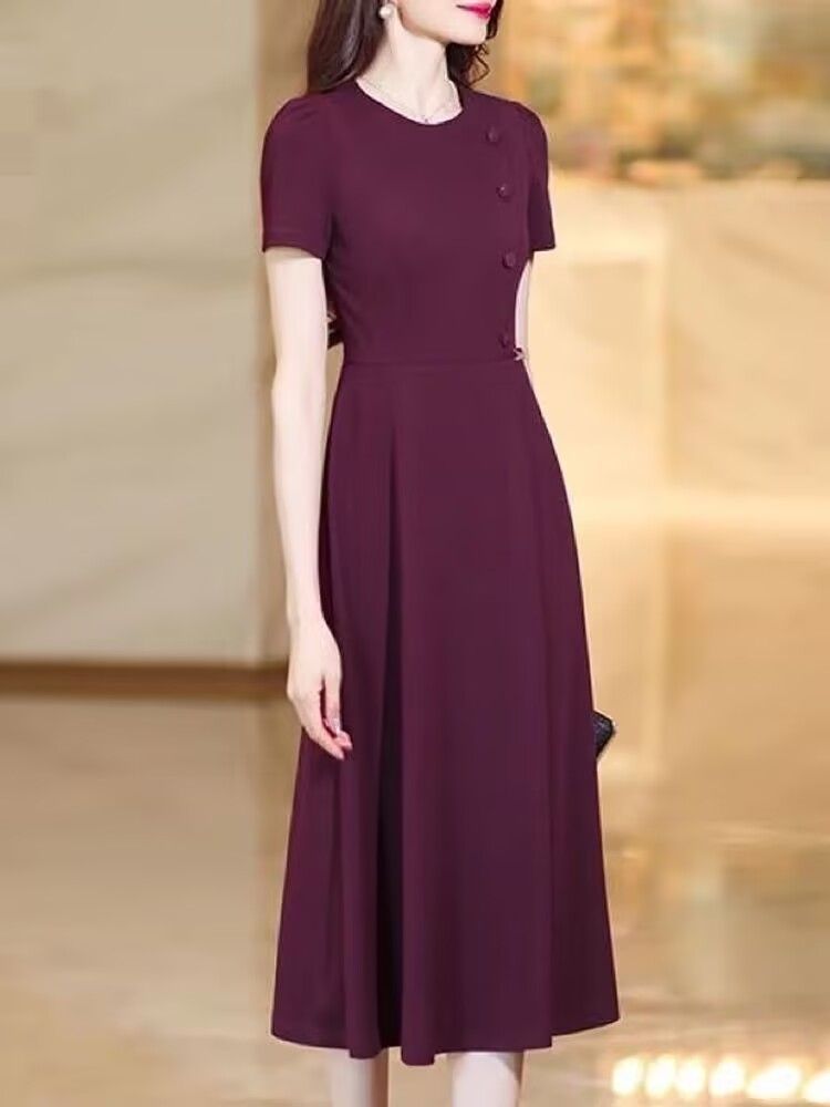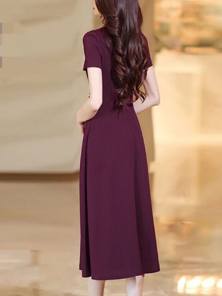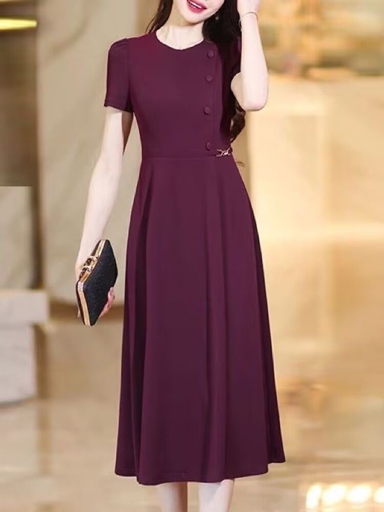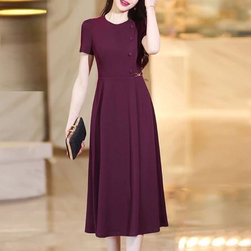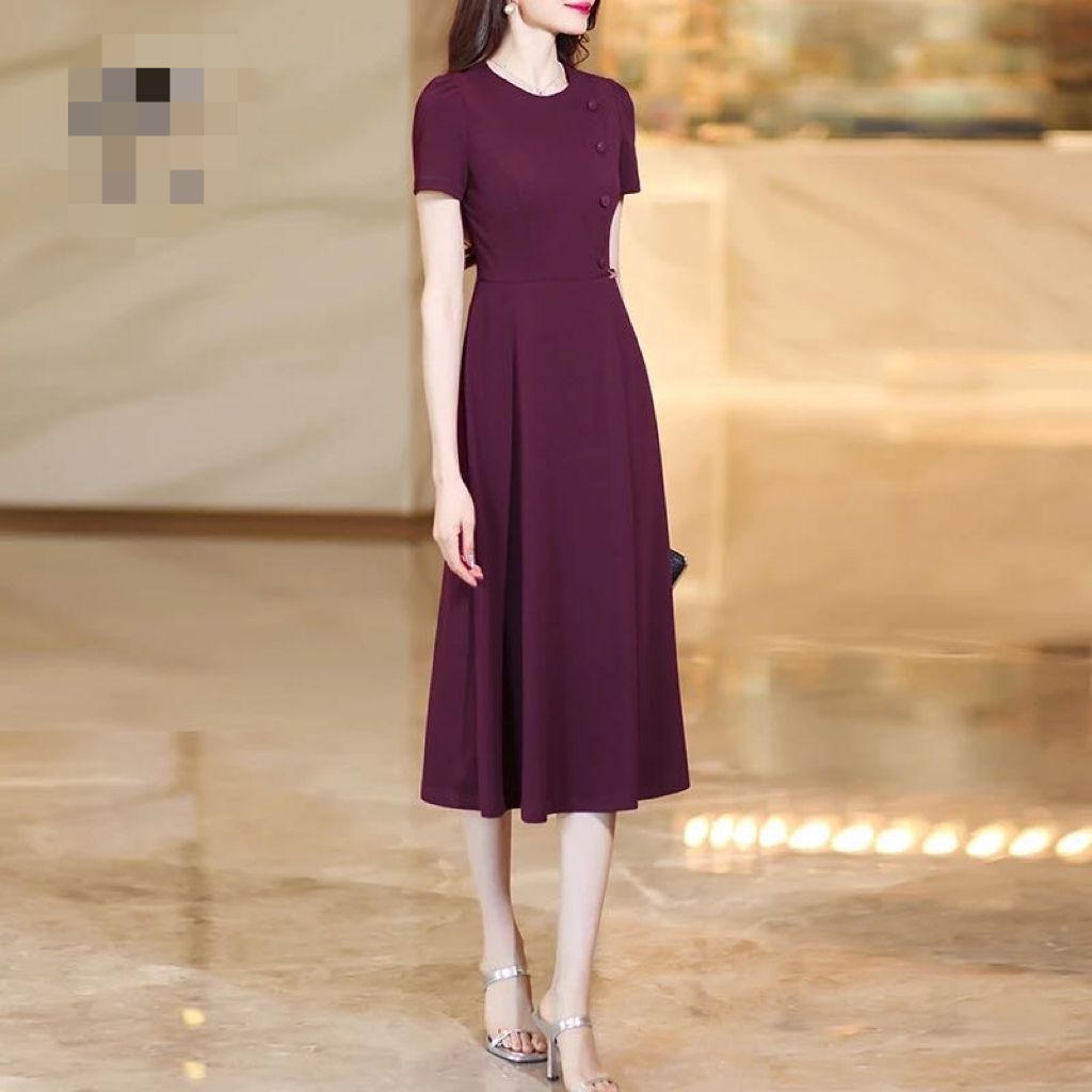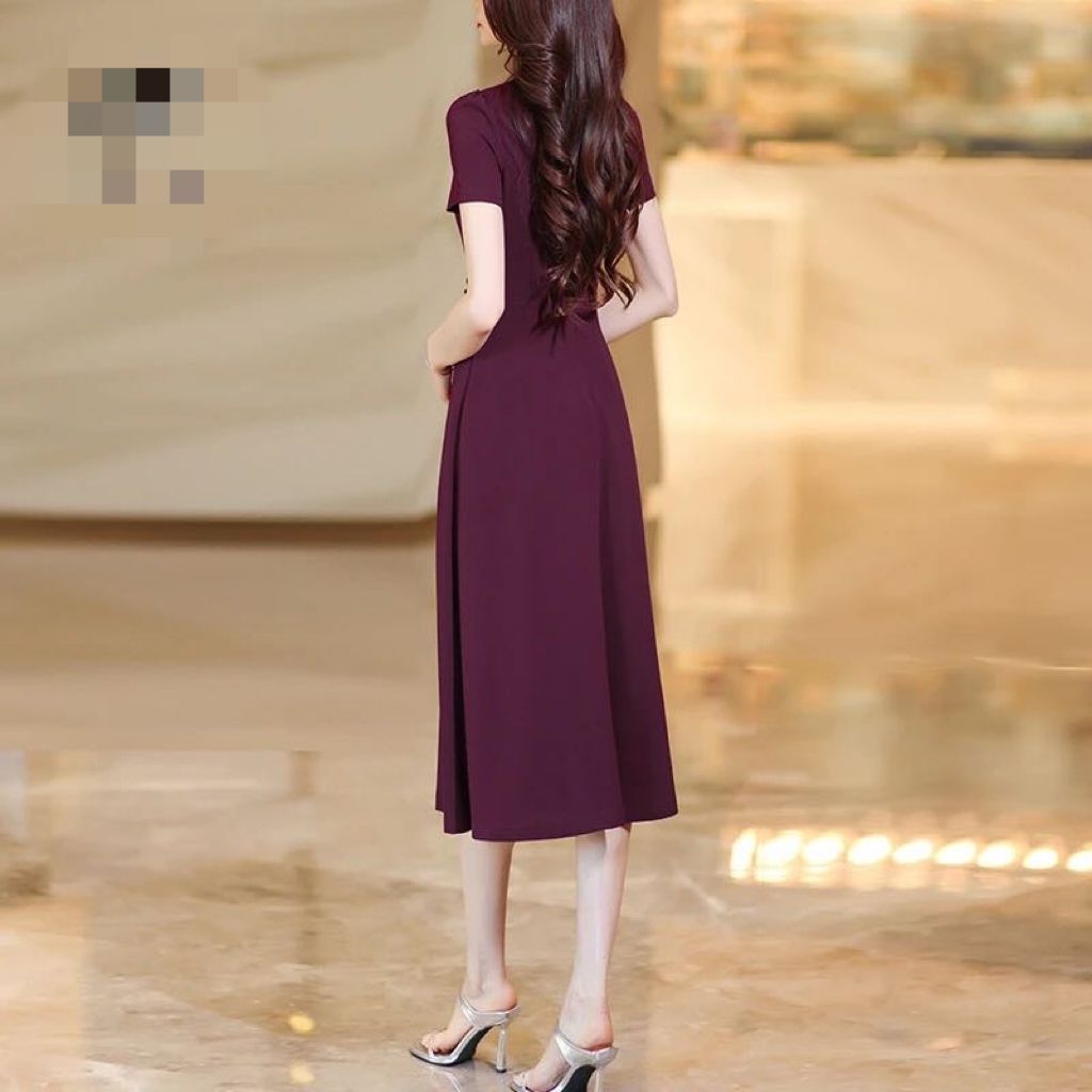 MY14373# 酒红色连衣裙夏季女新款短袖气质收腰显瘦减龄长连衣裙女裝貨源服裝批發