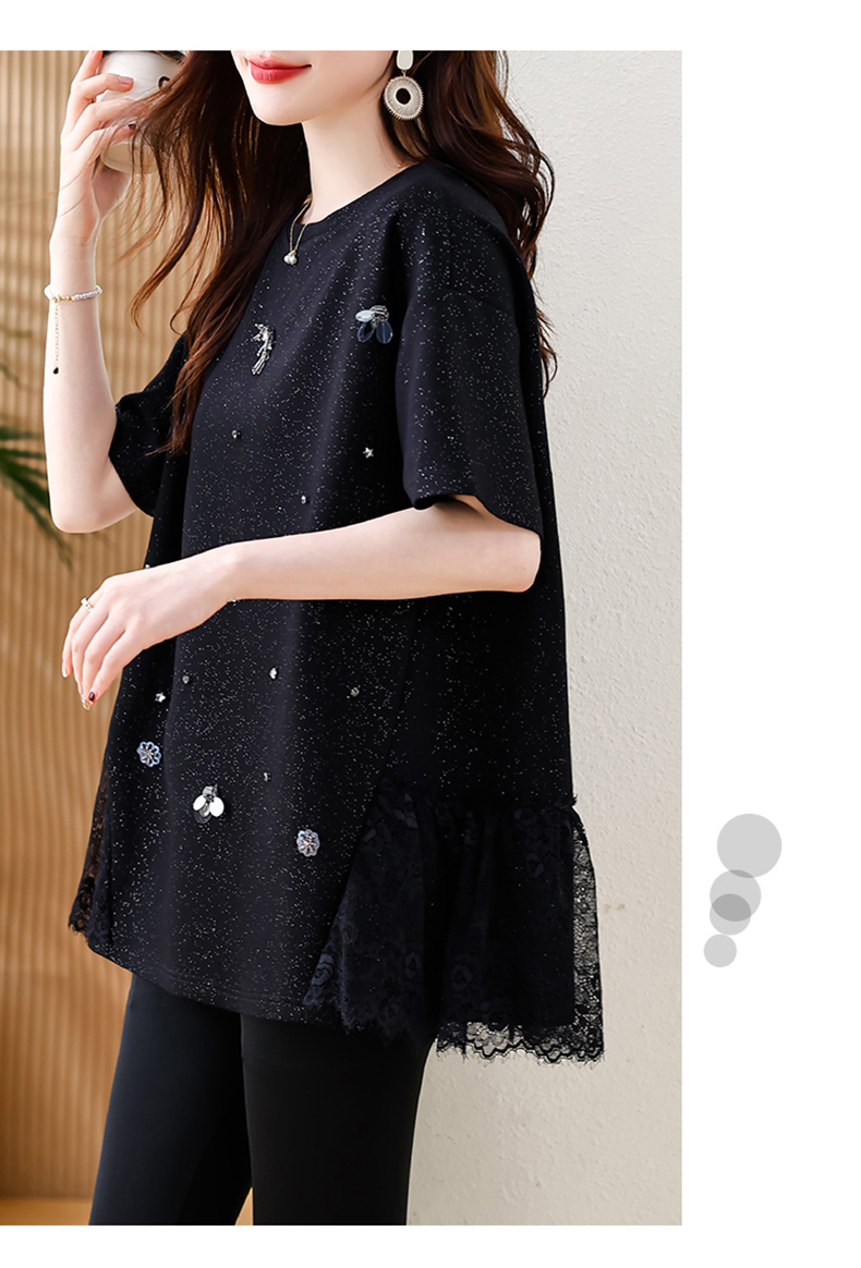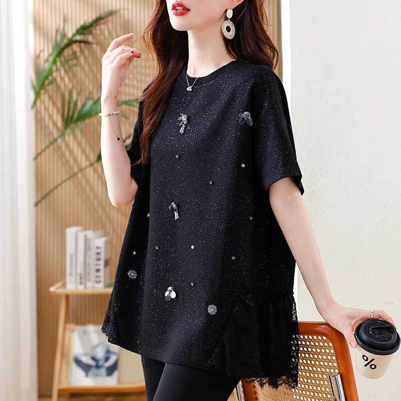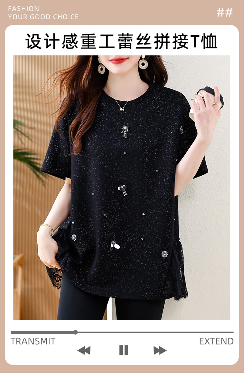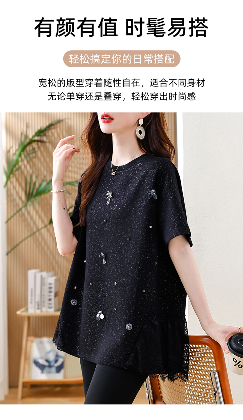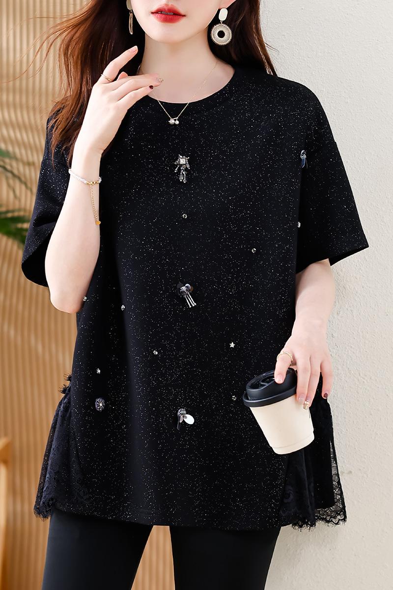 MY14859# 时尚钉珠拼接短袖T恤女夏季欧货 大码女装新款休闲上衣女裝貨源服裝批發