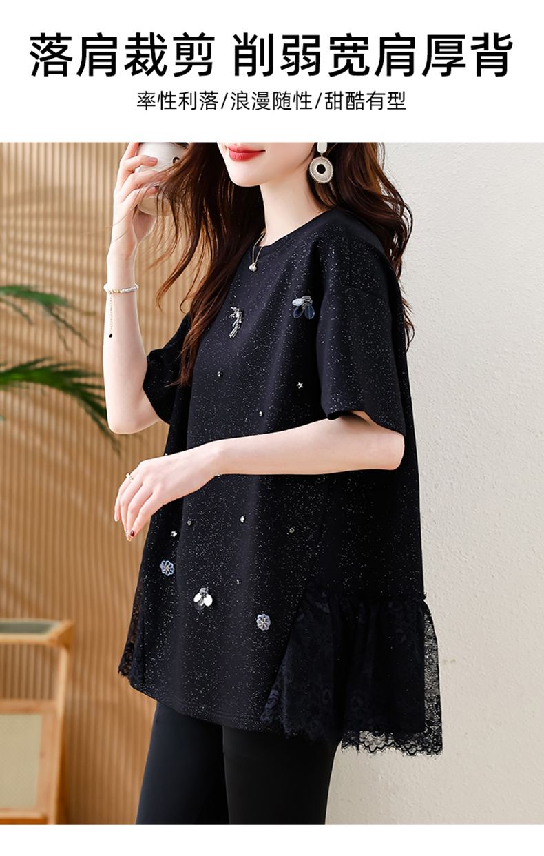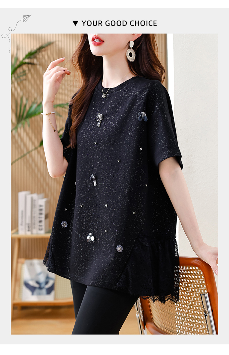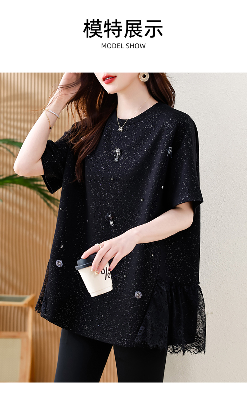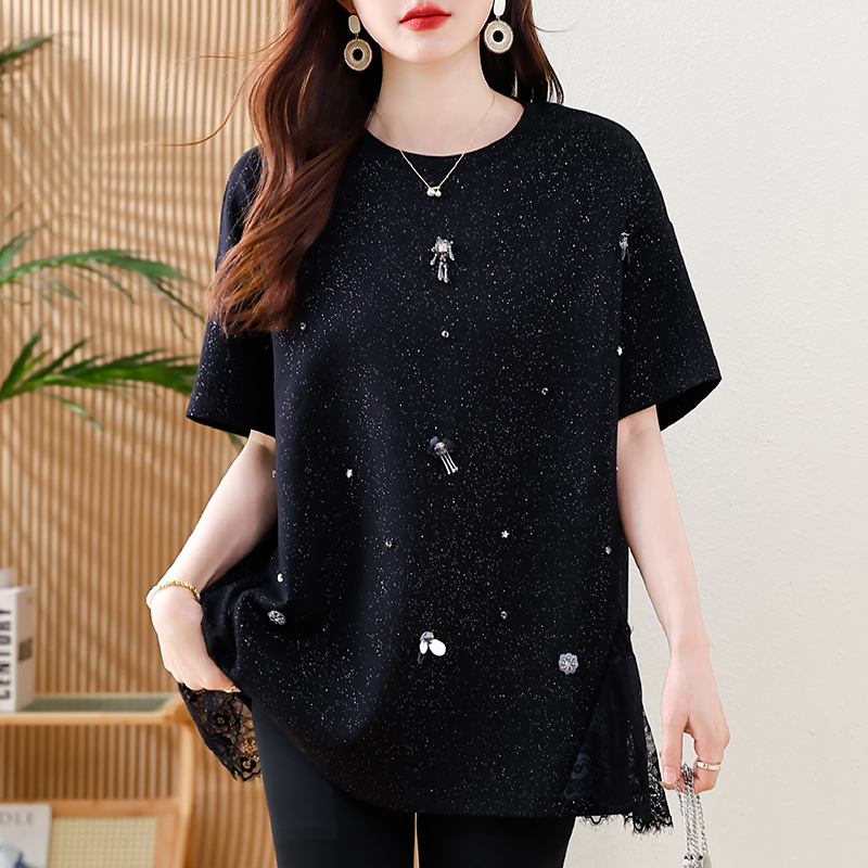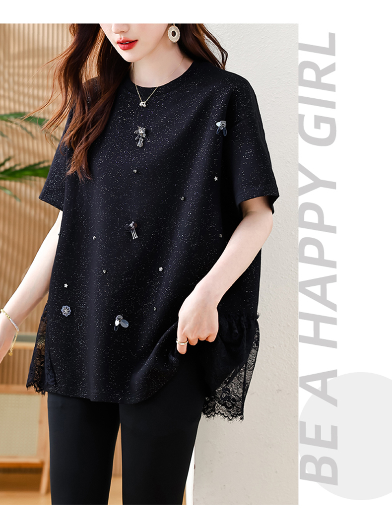 MY14859# 时尚钉珠拼接短袖T恤女夏季欧货 大码女装新款休闲上衣女裝貨源服裝批發