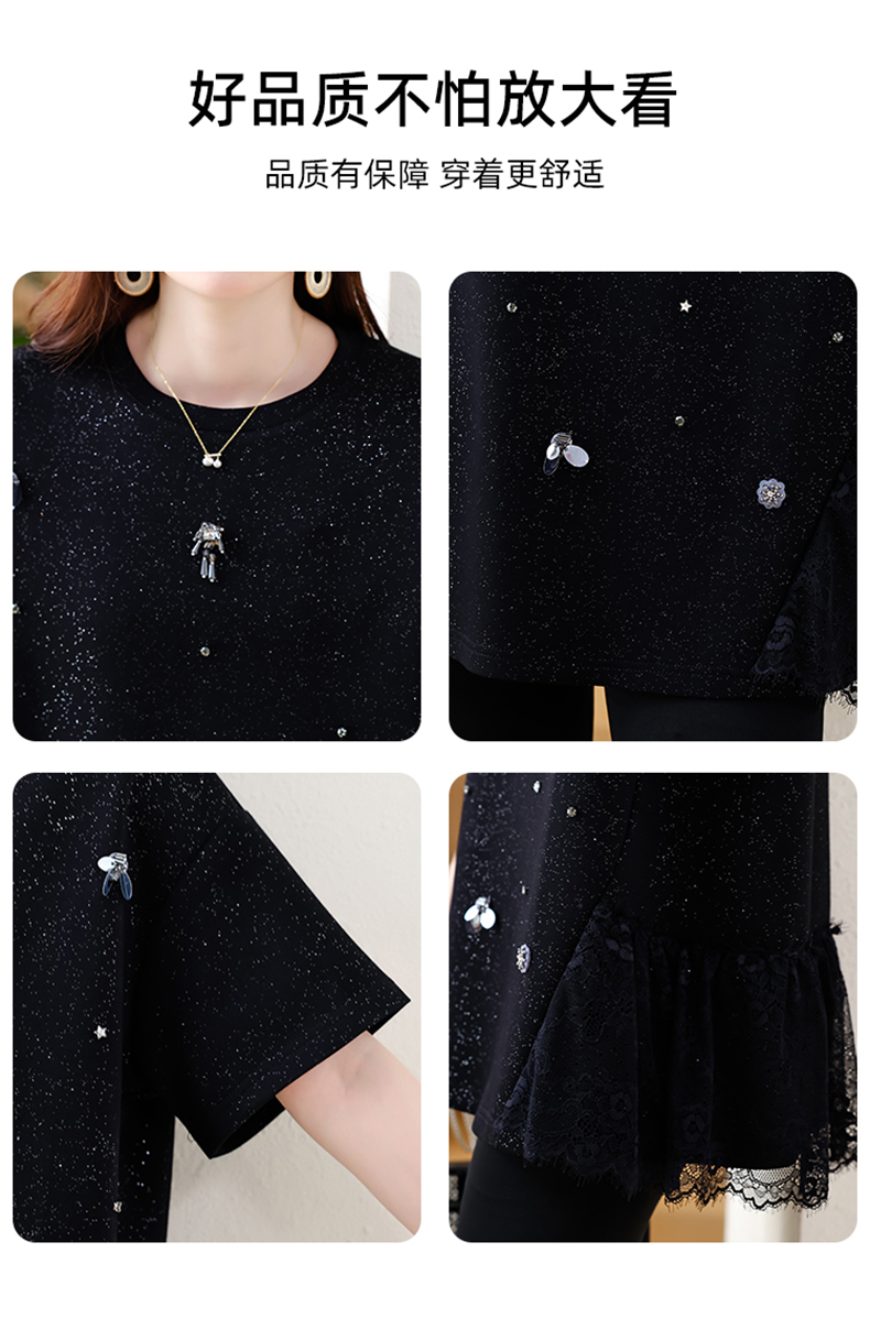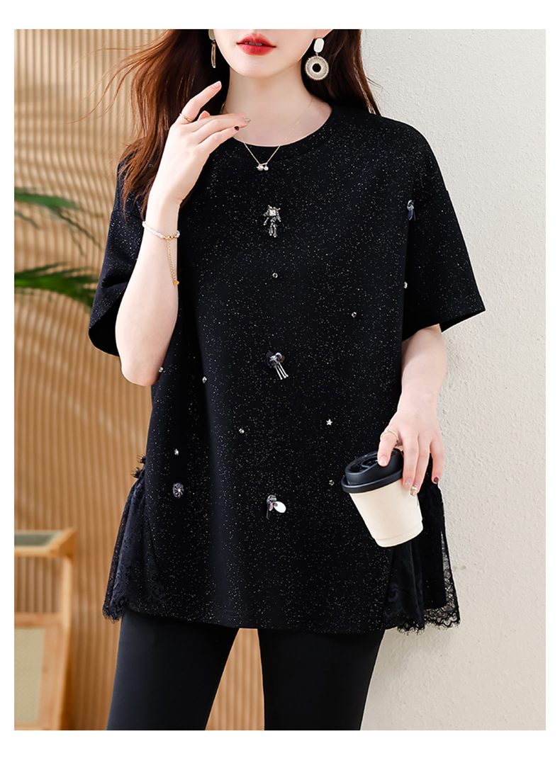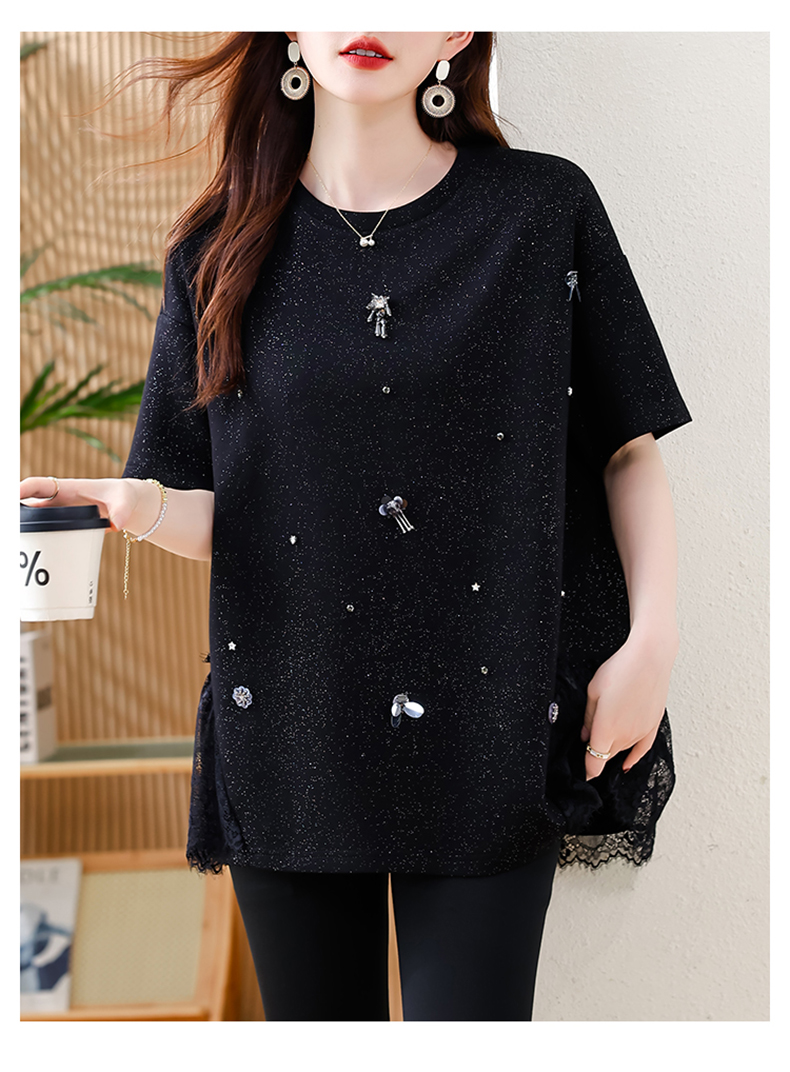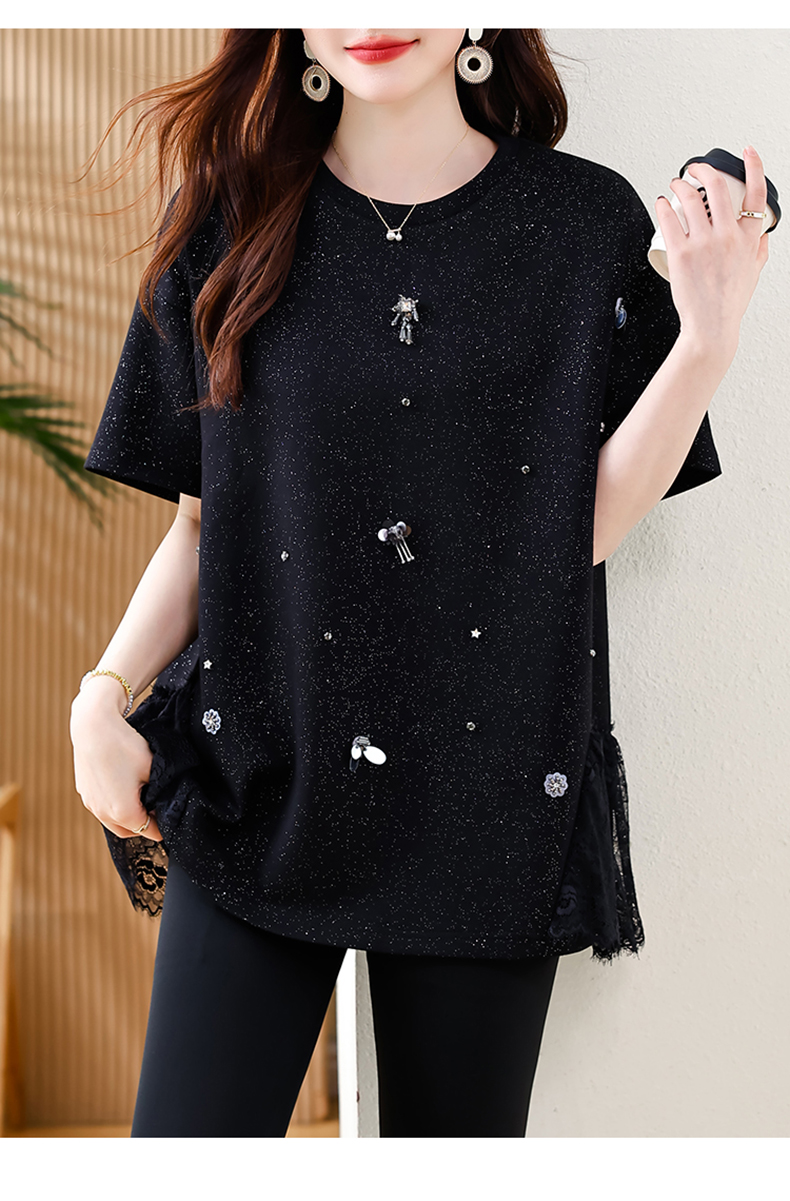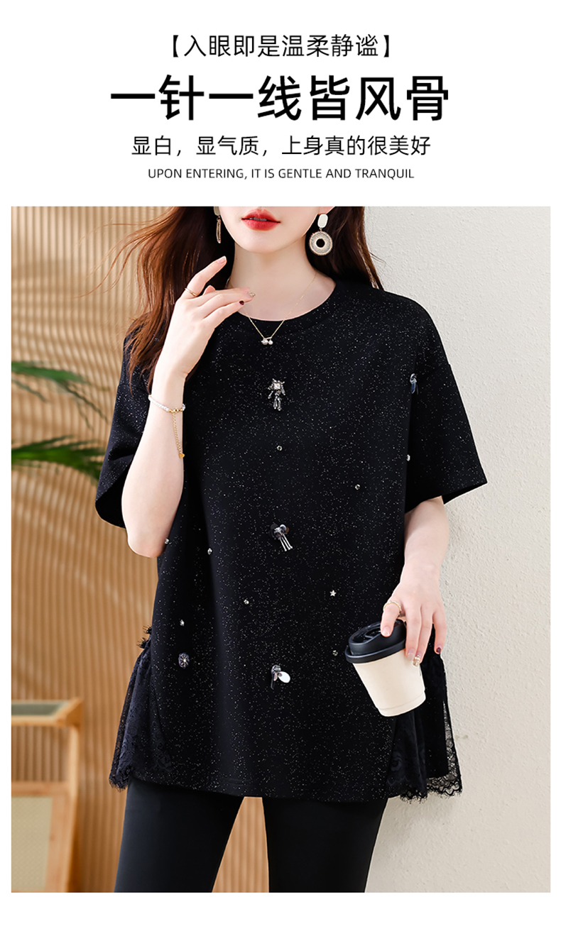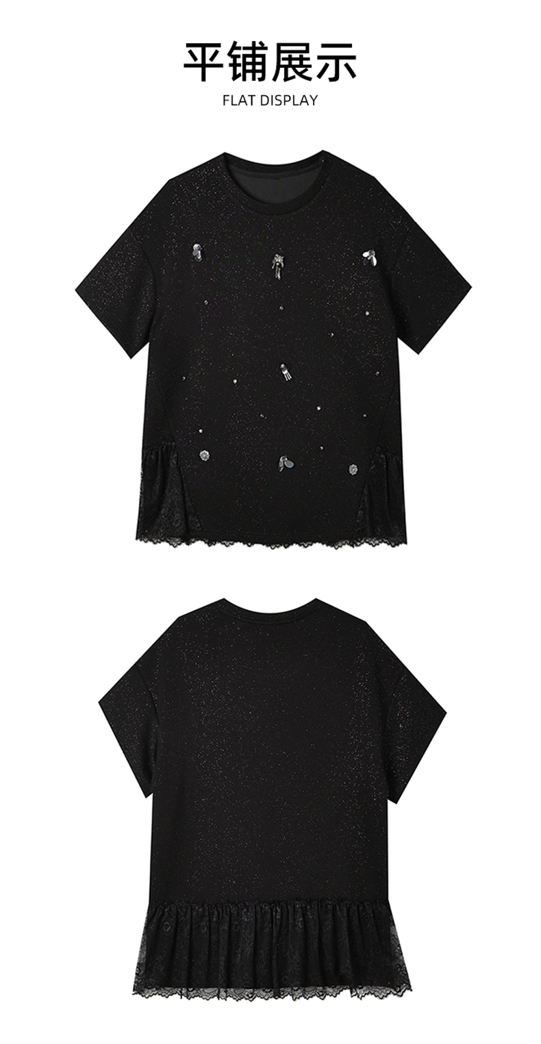 MY14859# 时尚钉珠拼接短袖T恤女夏季欧货 大码女装新款休闲上衣女裝貨源服裝批發