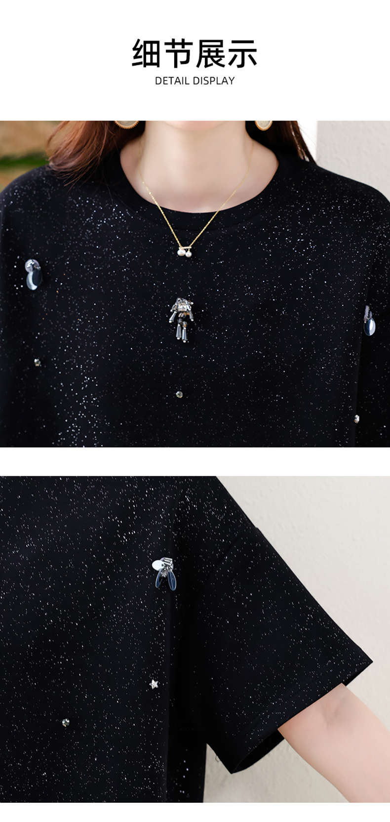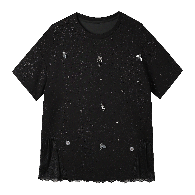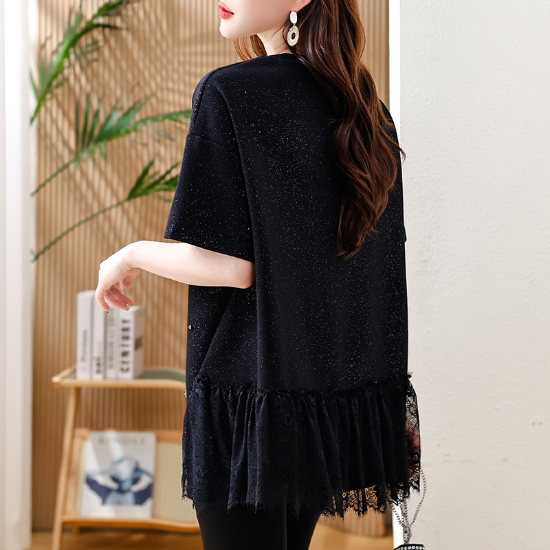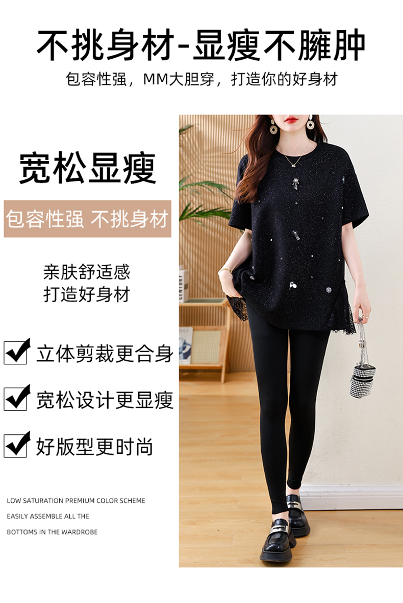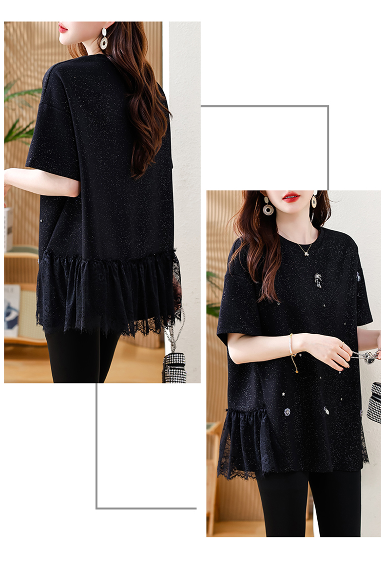 MY14859# 时尚钉珠拼接短袖T恤女夏季欧货 大码女装新款休闲上衣女裝貨源服裝批發