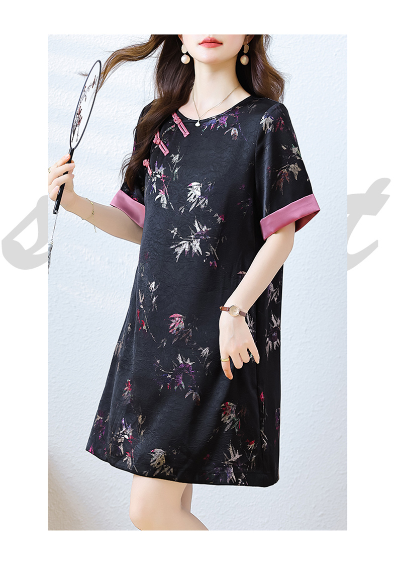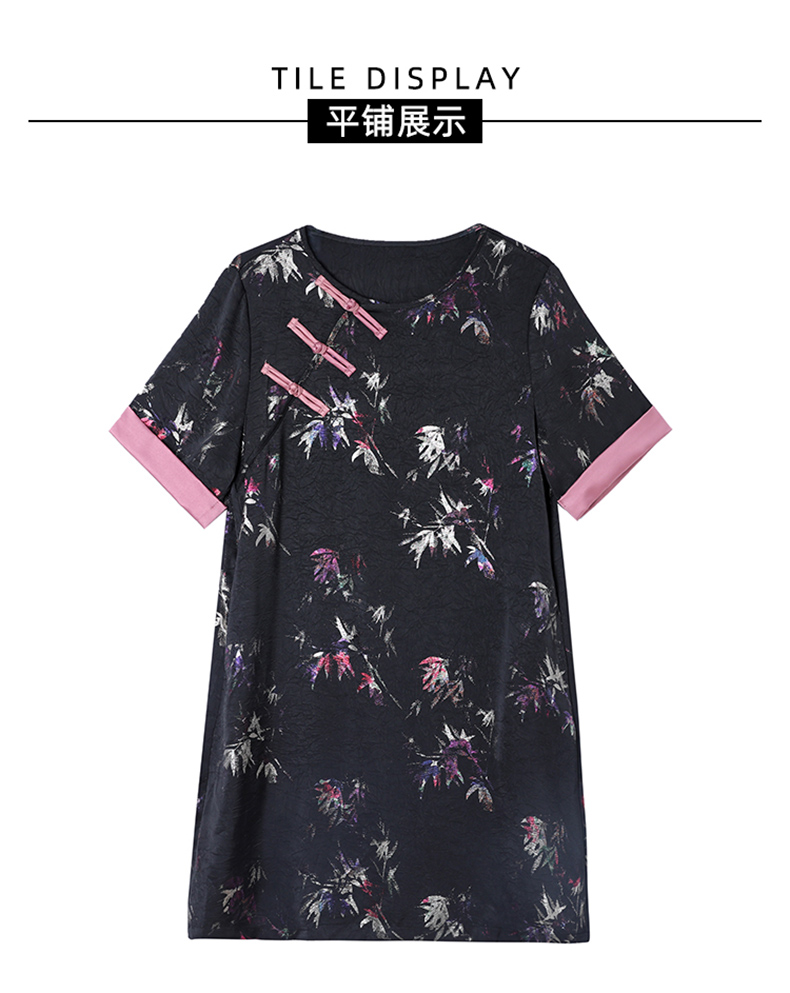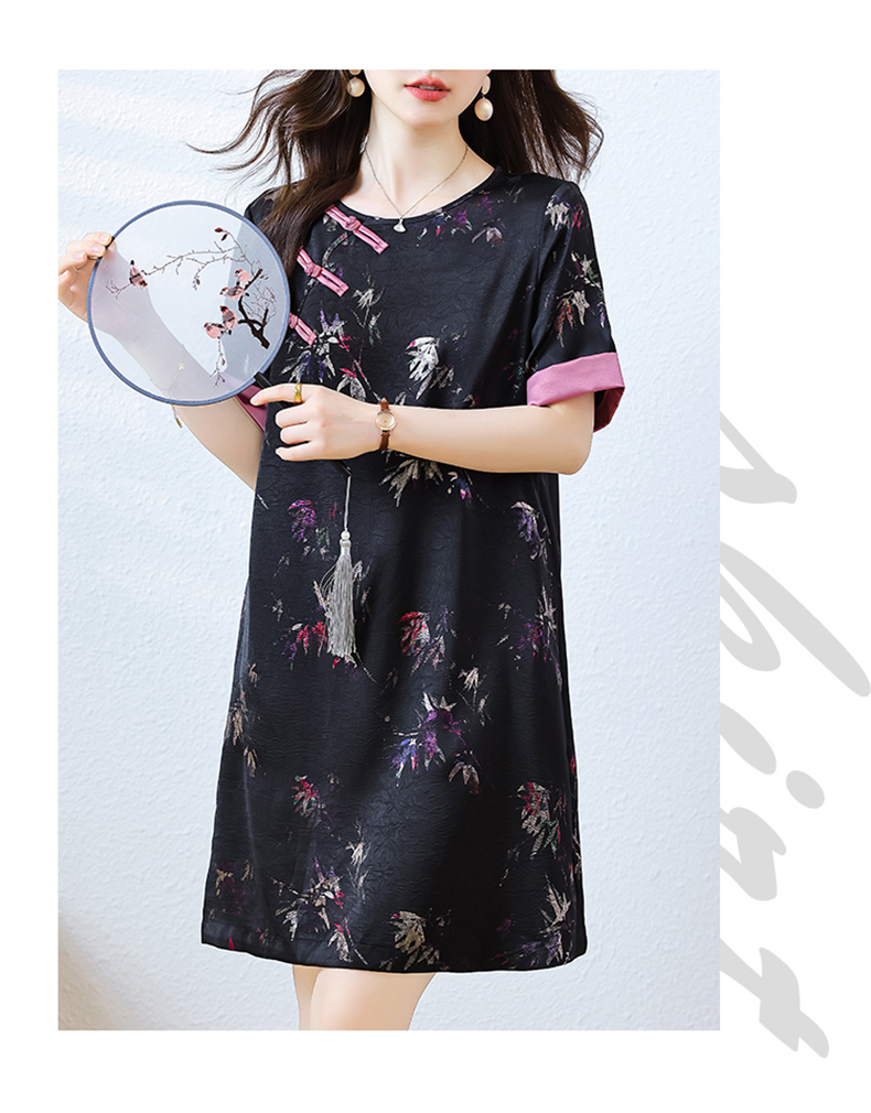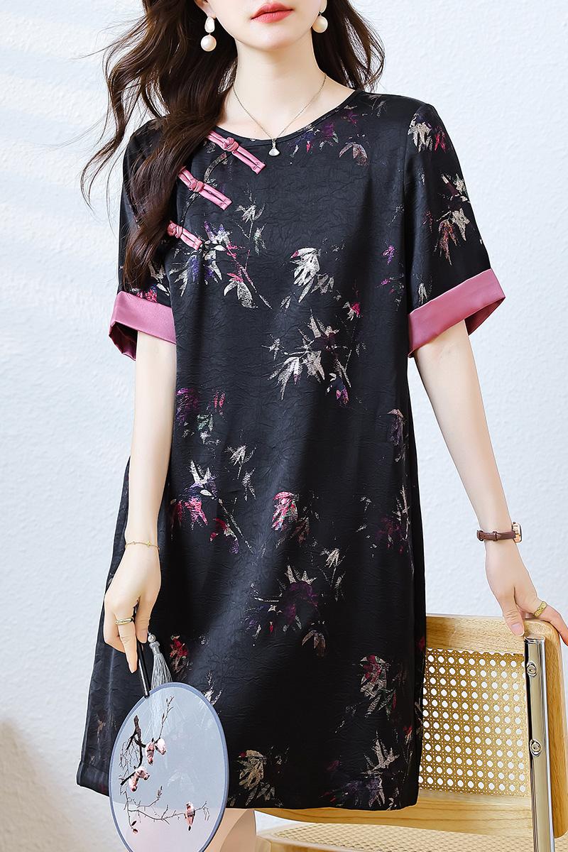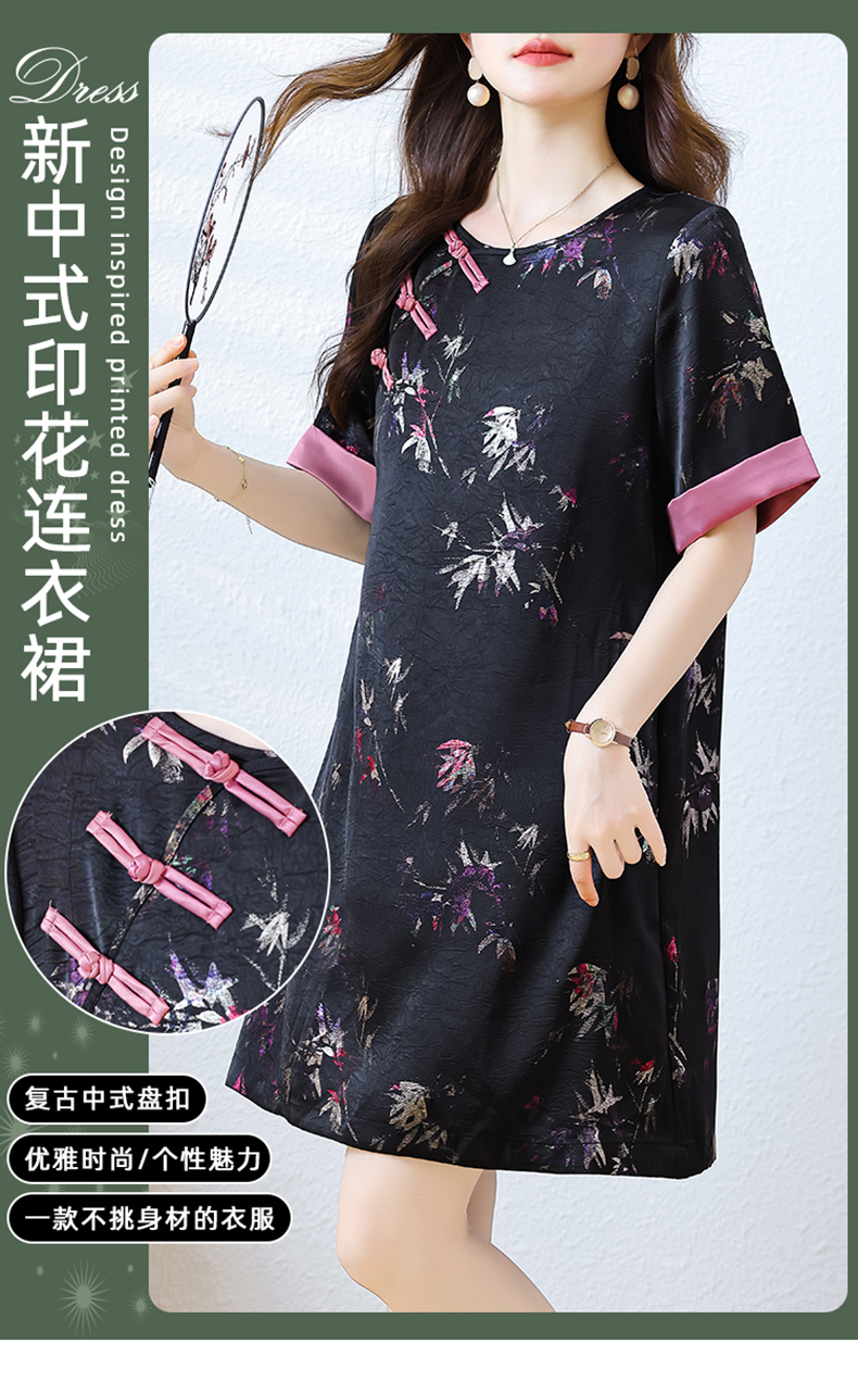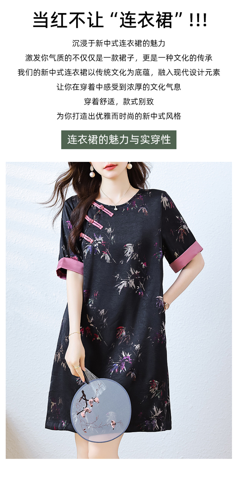 MY14860# 国风盘扣印花连衣裙气质时尚新中式高级感短袖直筒裙女女裝貨源服裝批發