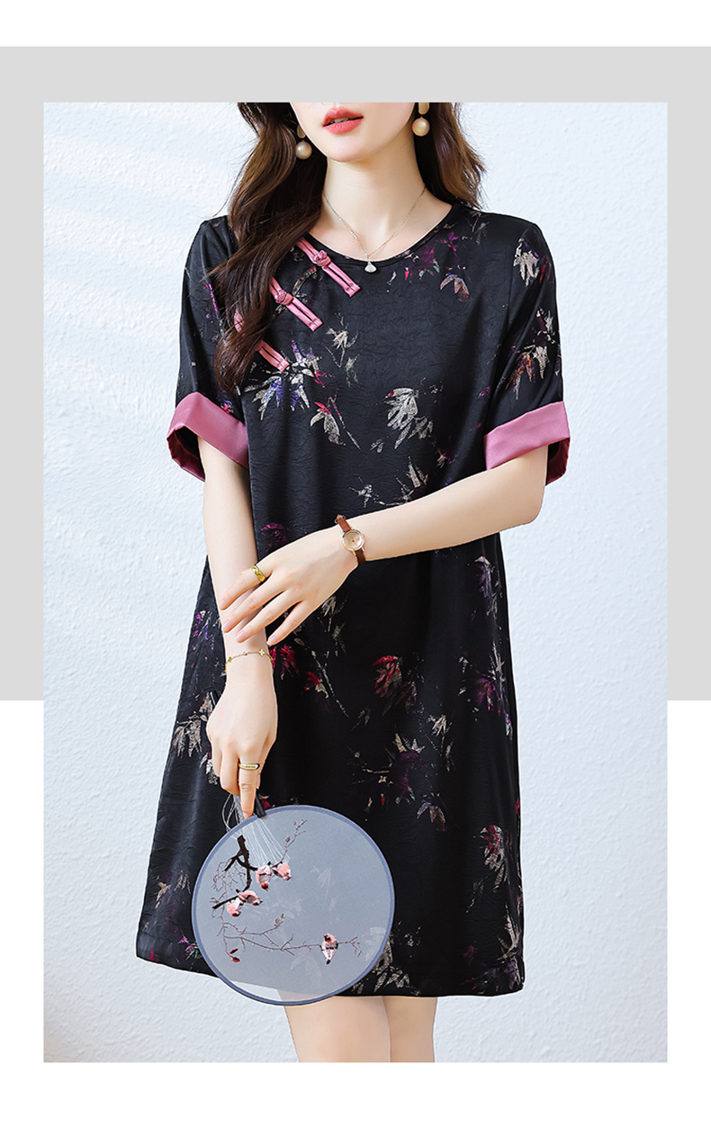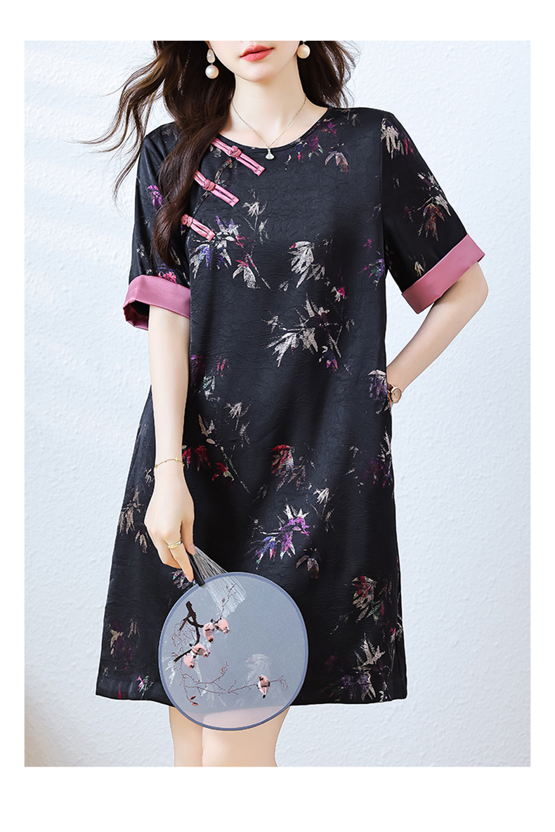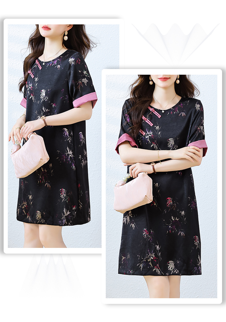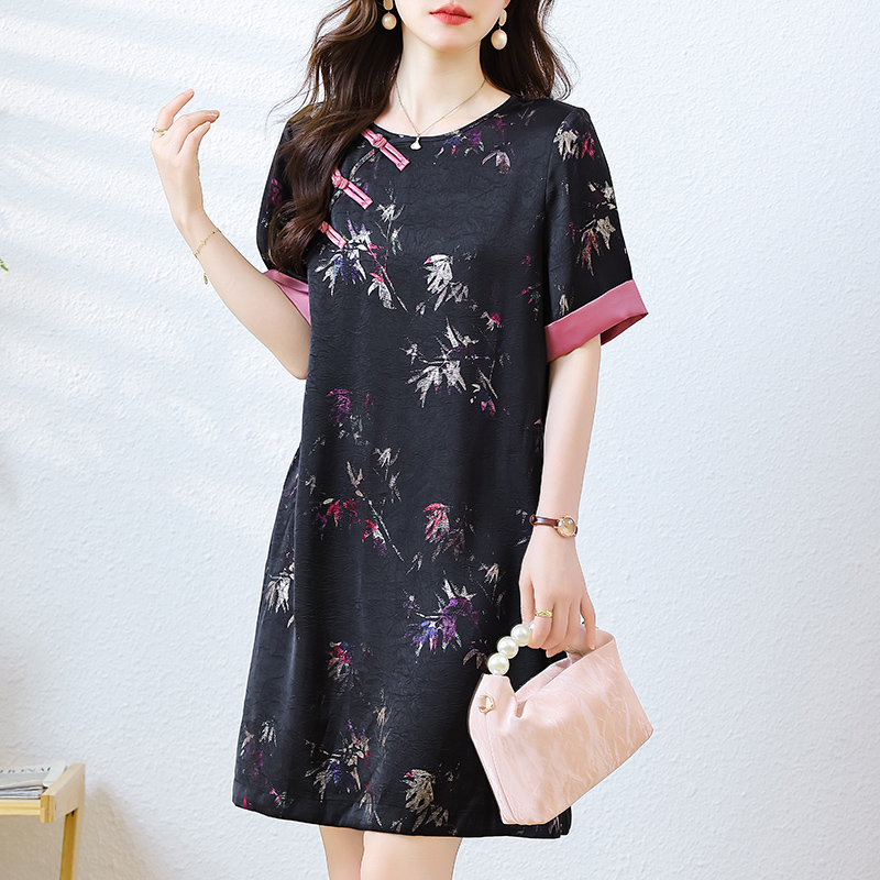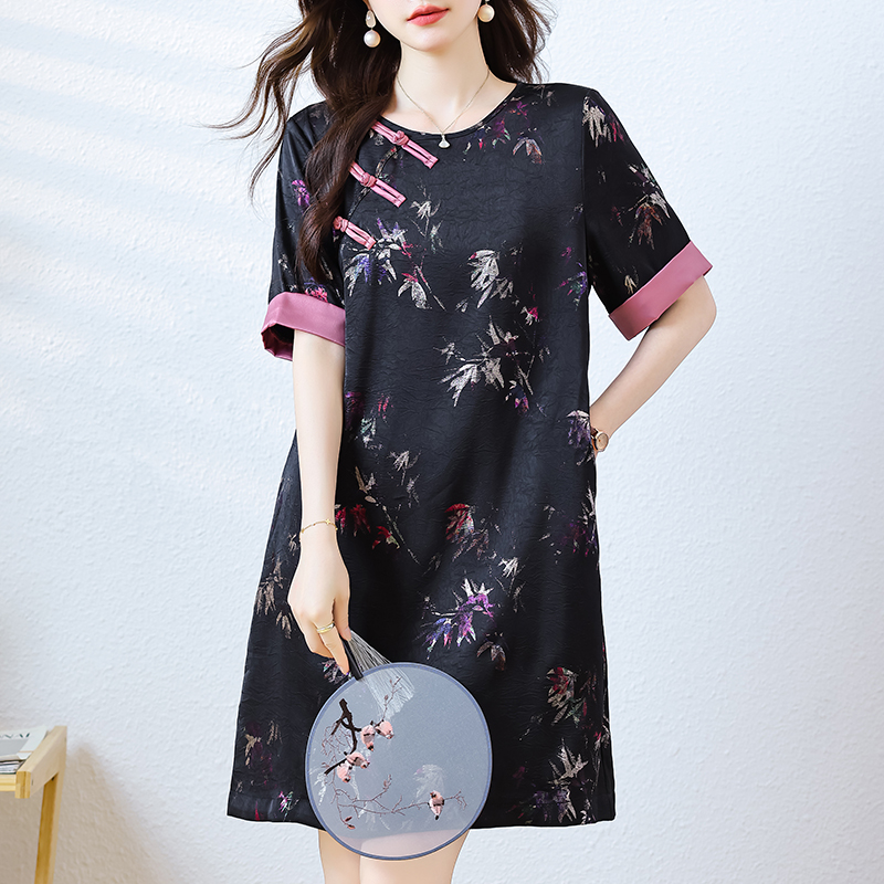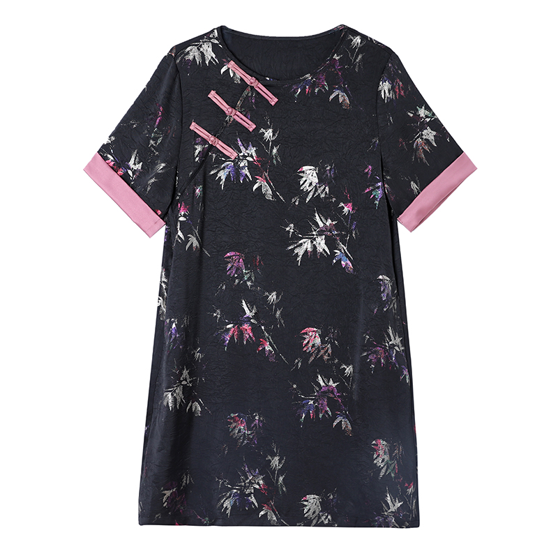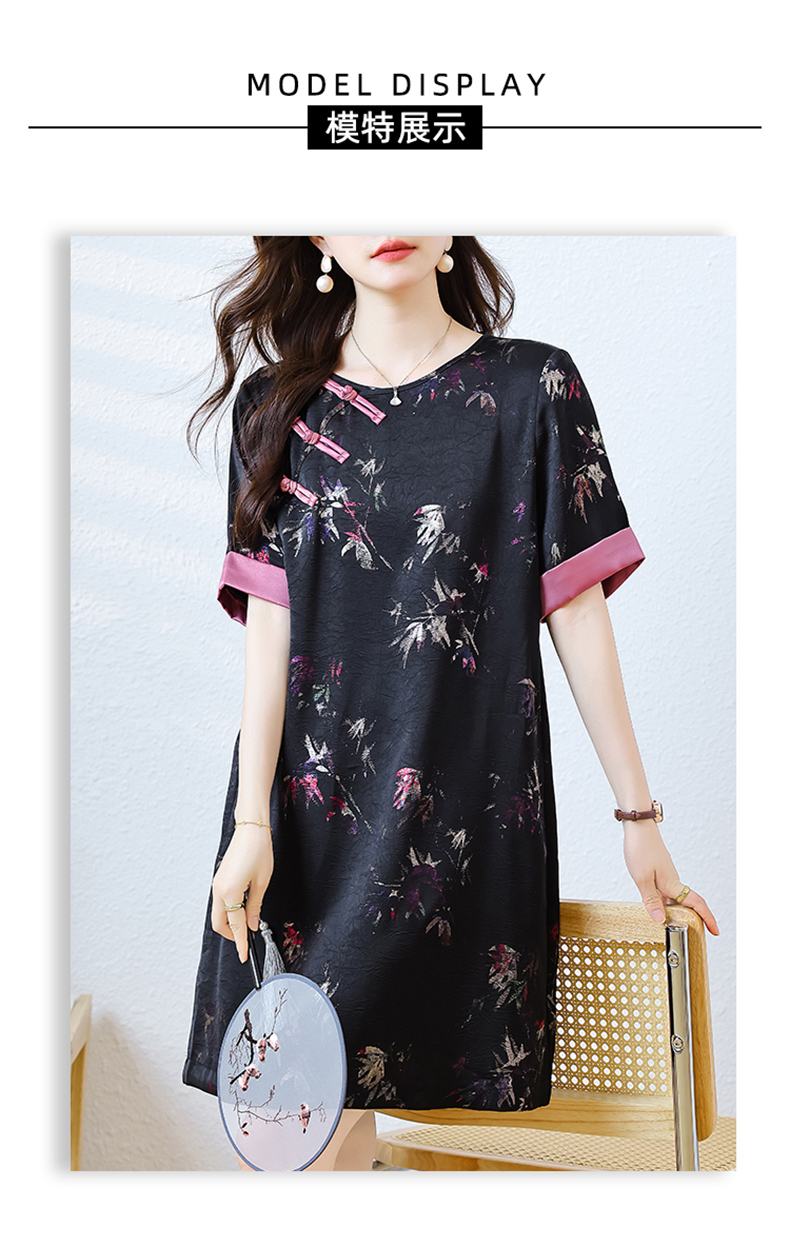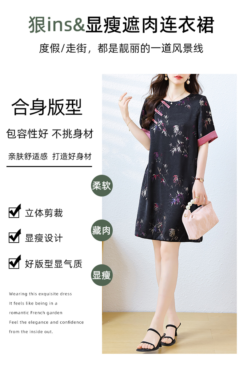 MY14860# 国风盘扣印花连衣裙气质时尚新中式高级感短袖直筒裙女女裝貨源服裝批發