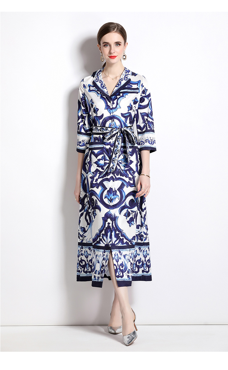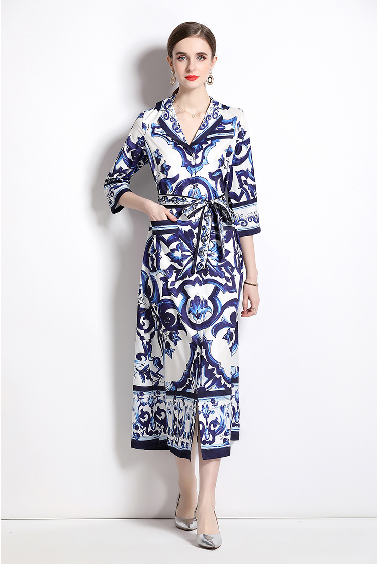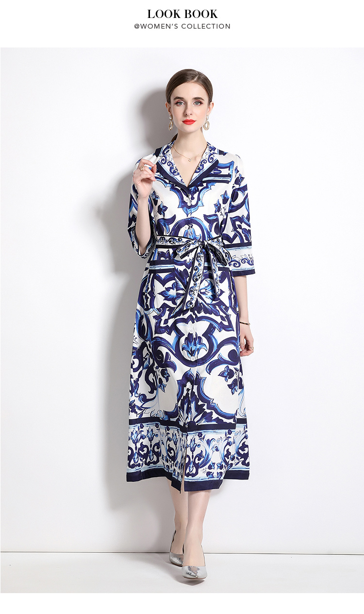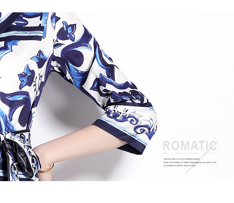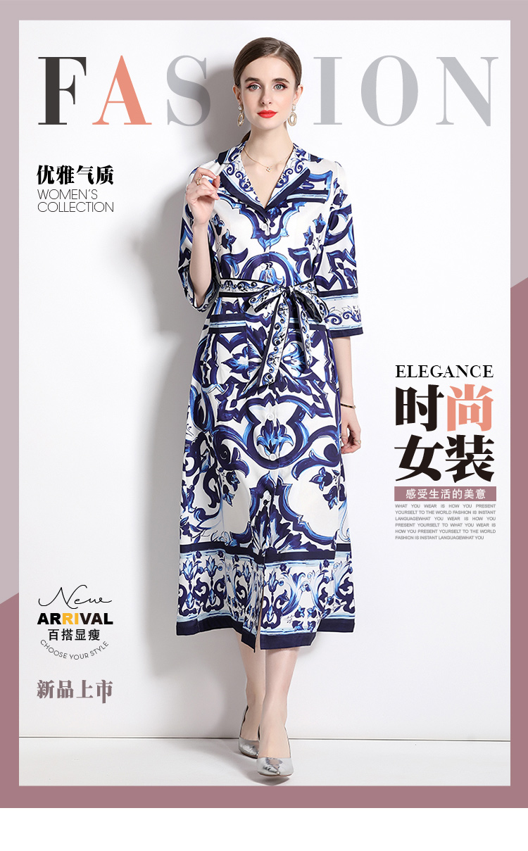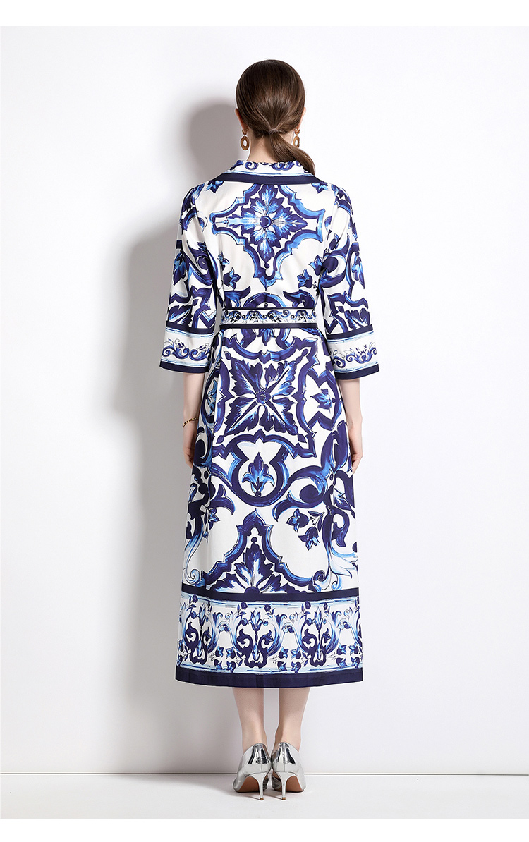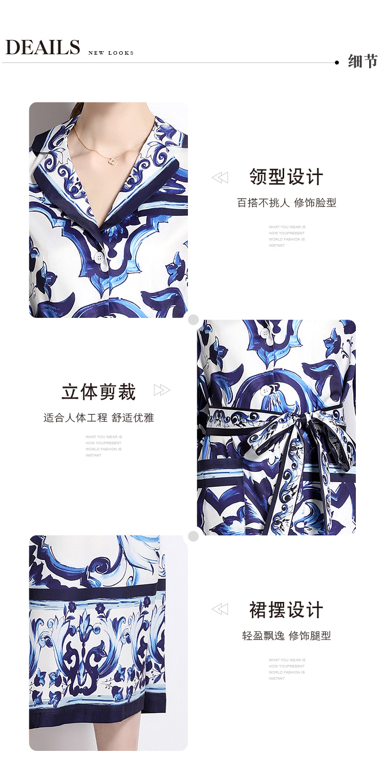 MY14903# 欧美时尚青花瓷印花宽松版口袋中袖西装领衬衣长裙女裝貨源服裝批發