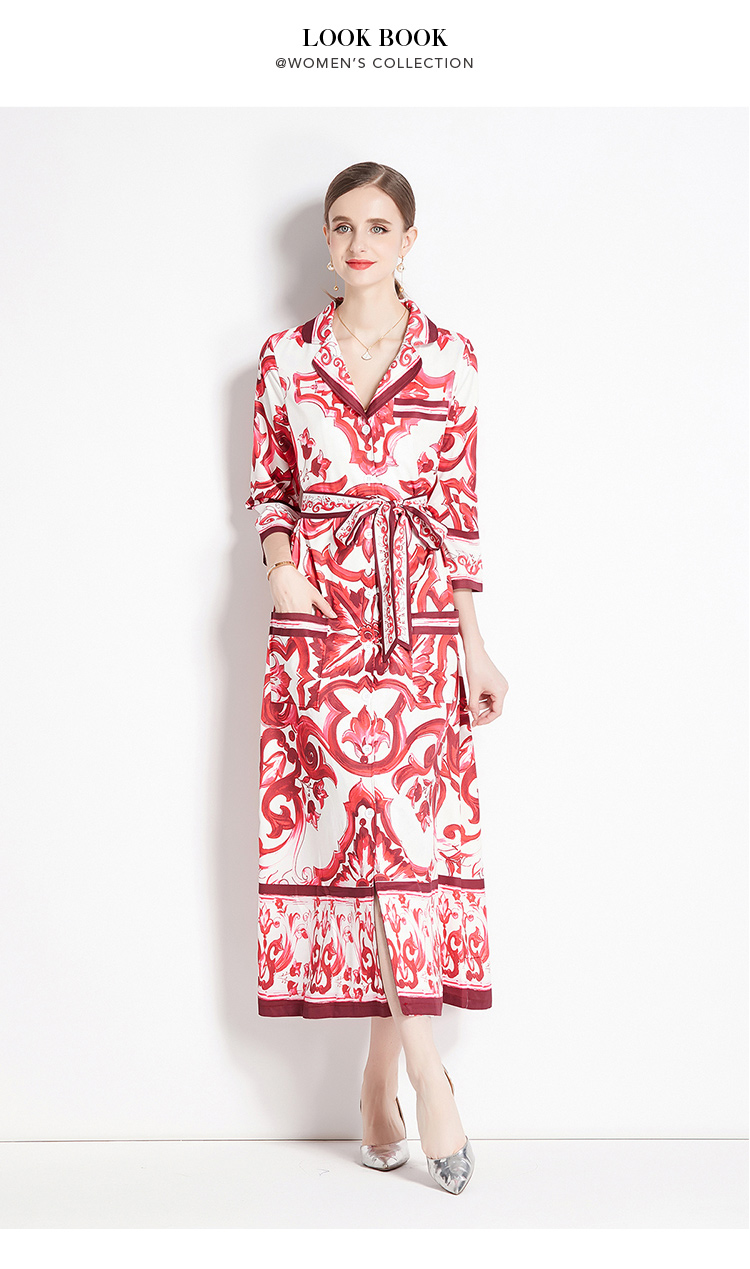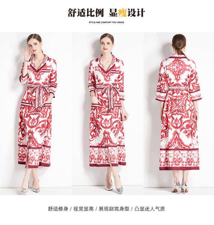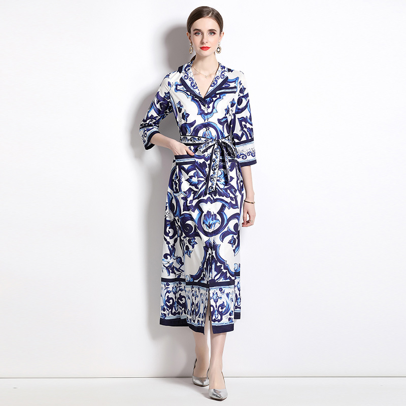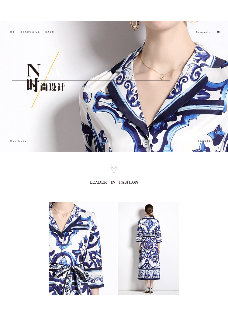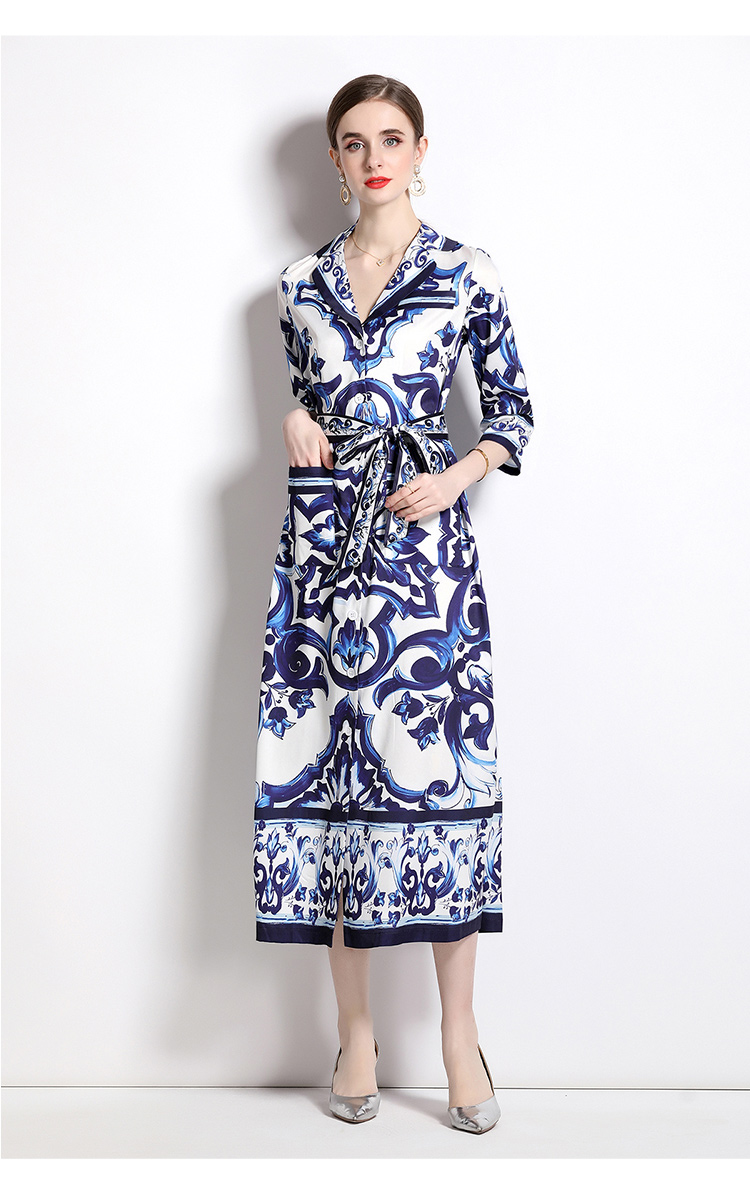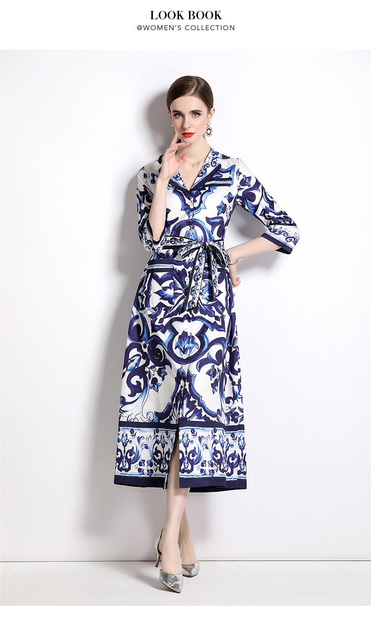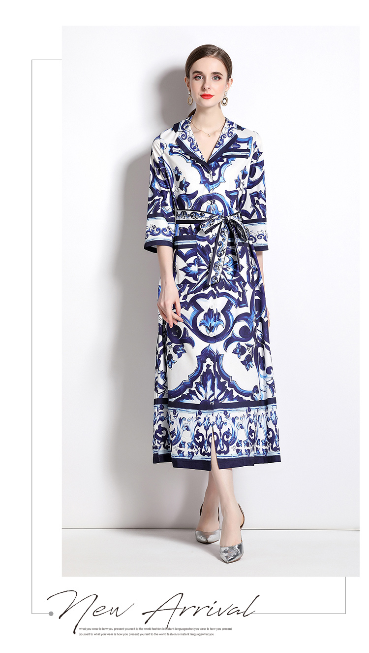 MY14903# 欧美时尚青花瓷印花宽松版口袋中袖西装领衬衣长裙女裝貨源服裝批發