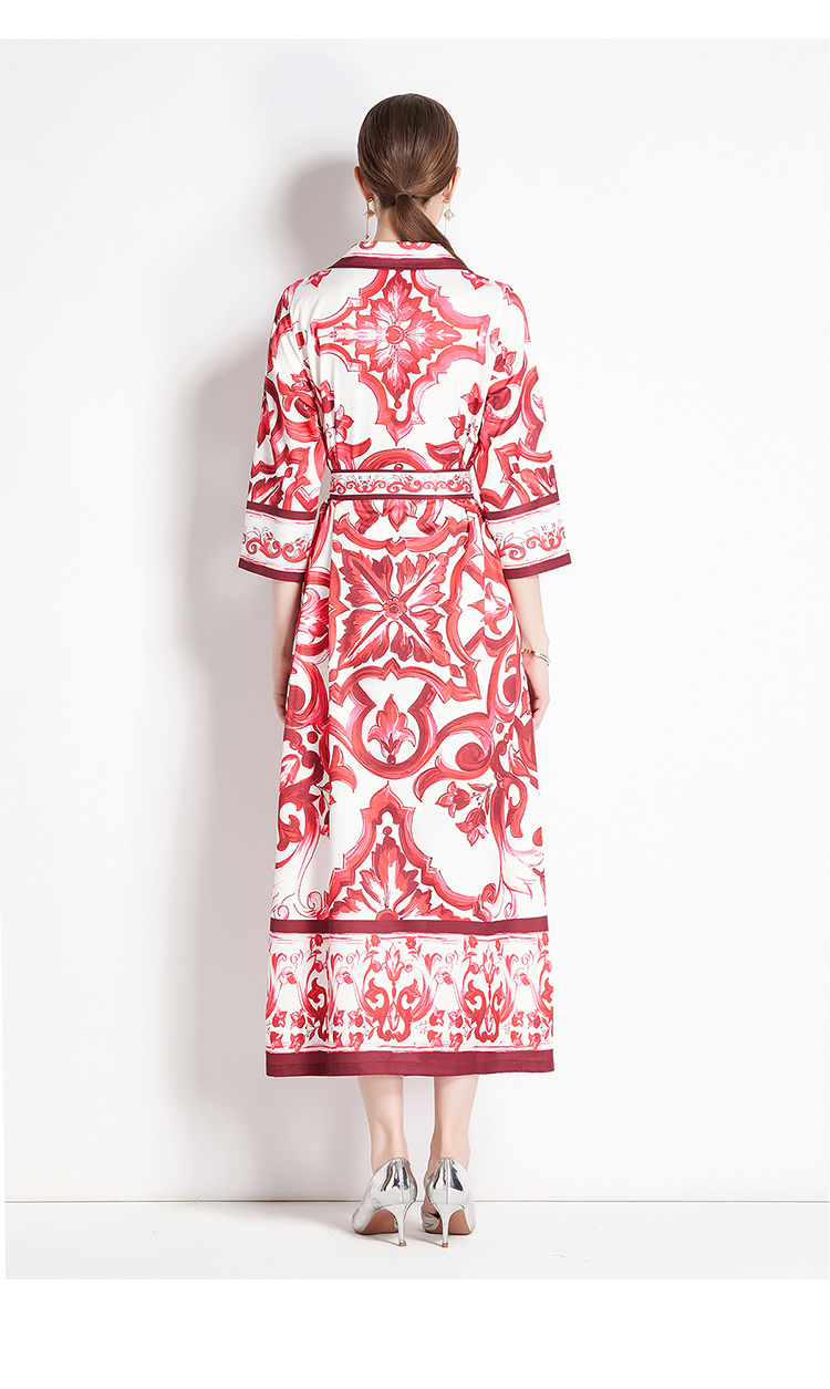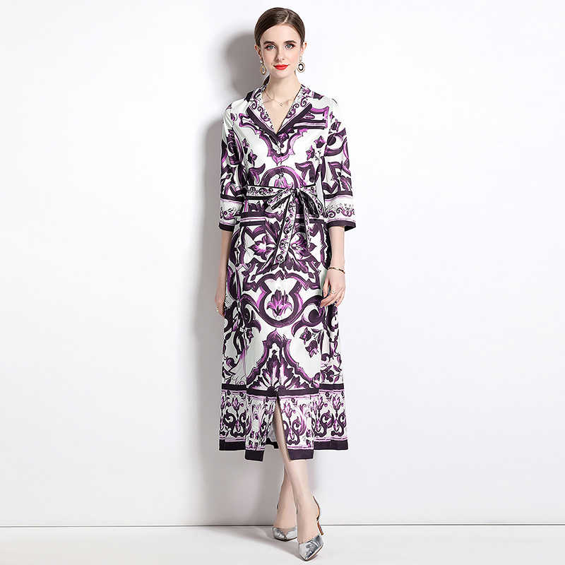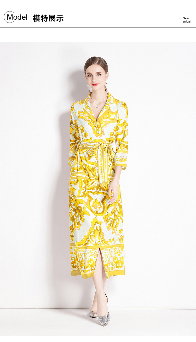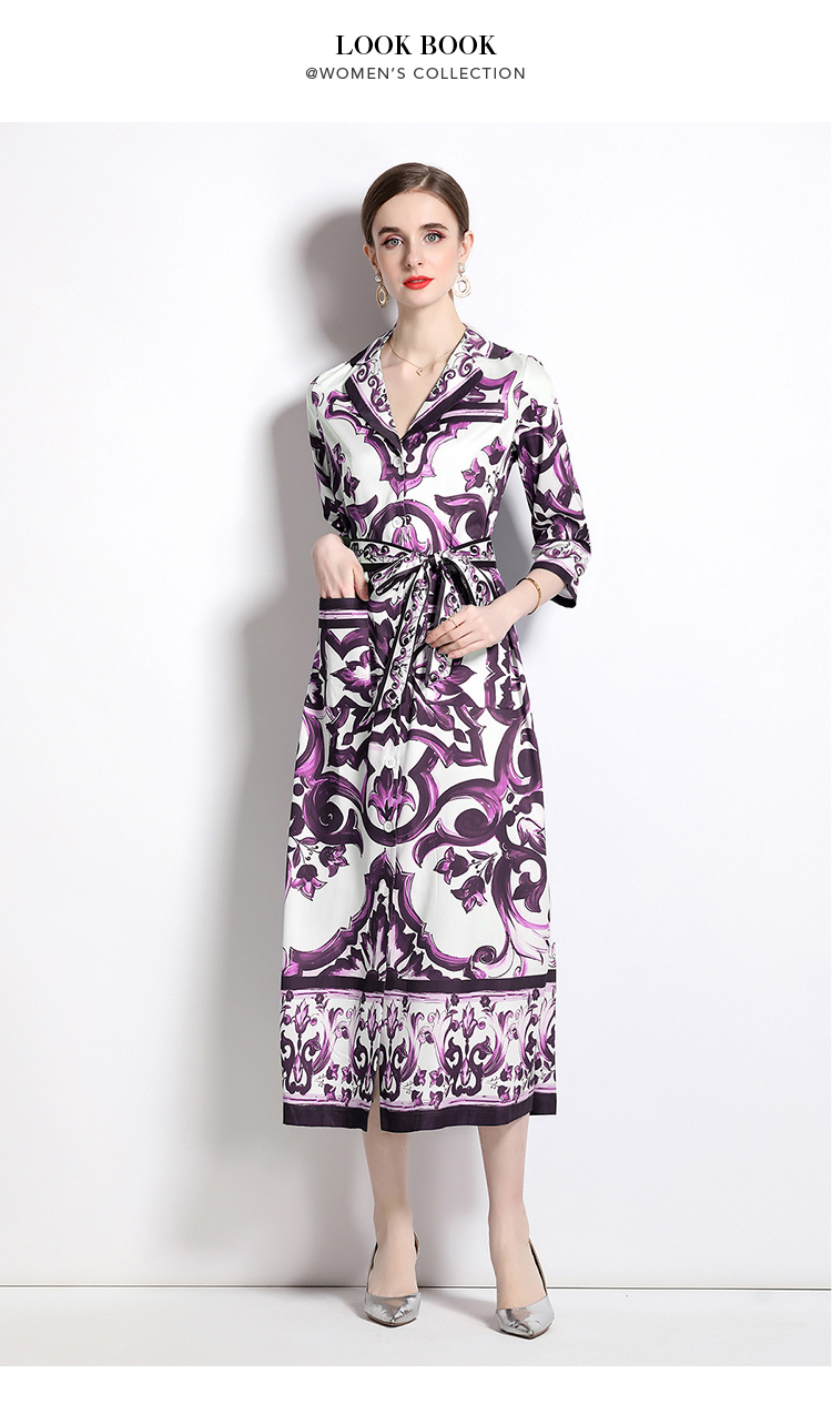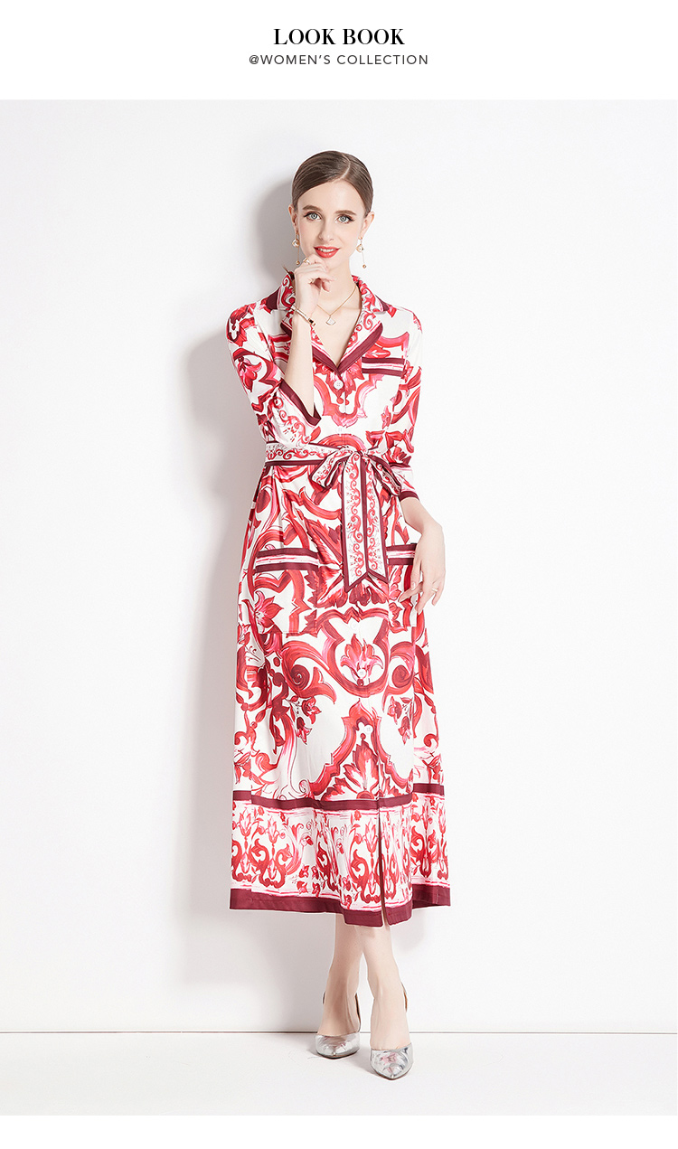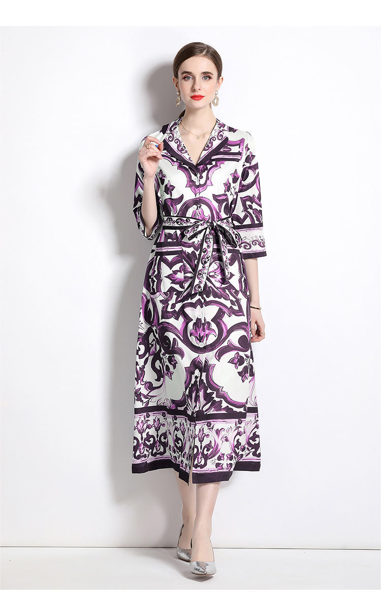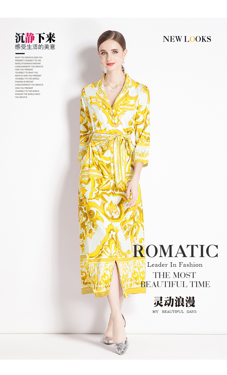 MY14900# 时尚复古V领喇叭短袖开衫多扣印花连衣裙女裝貨源服裝批發