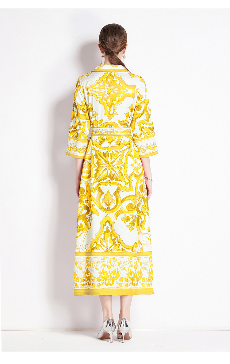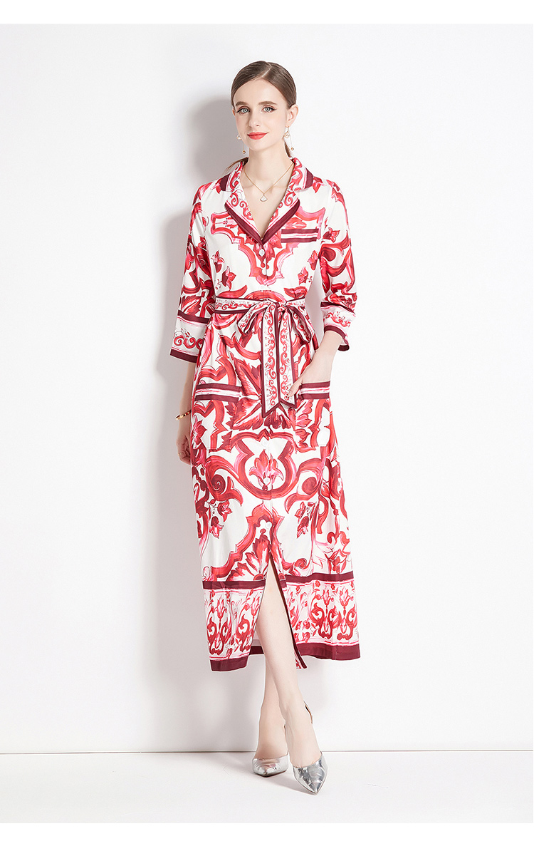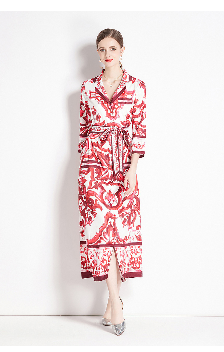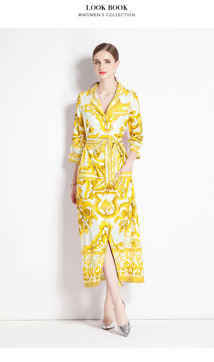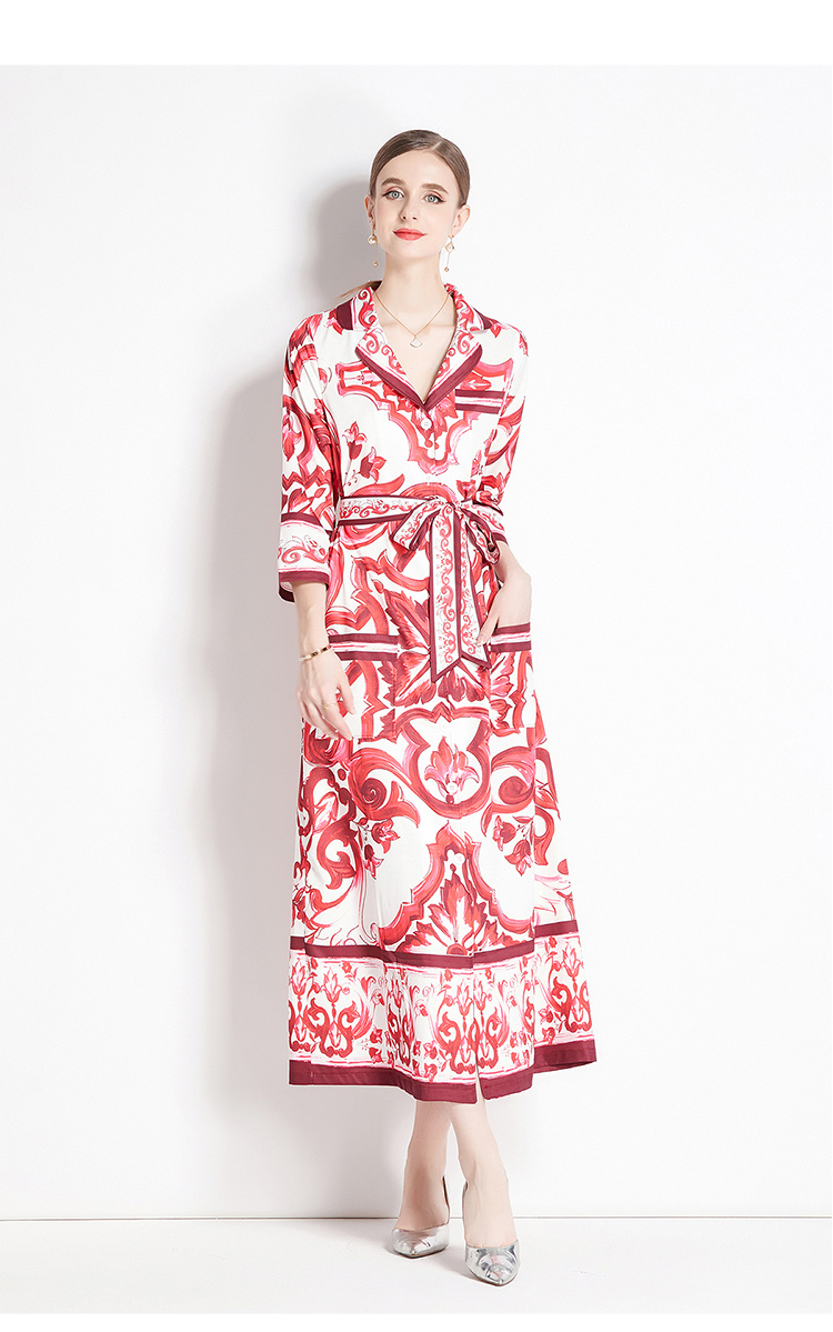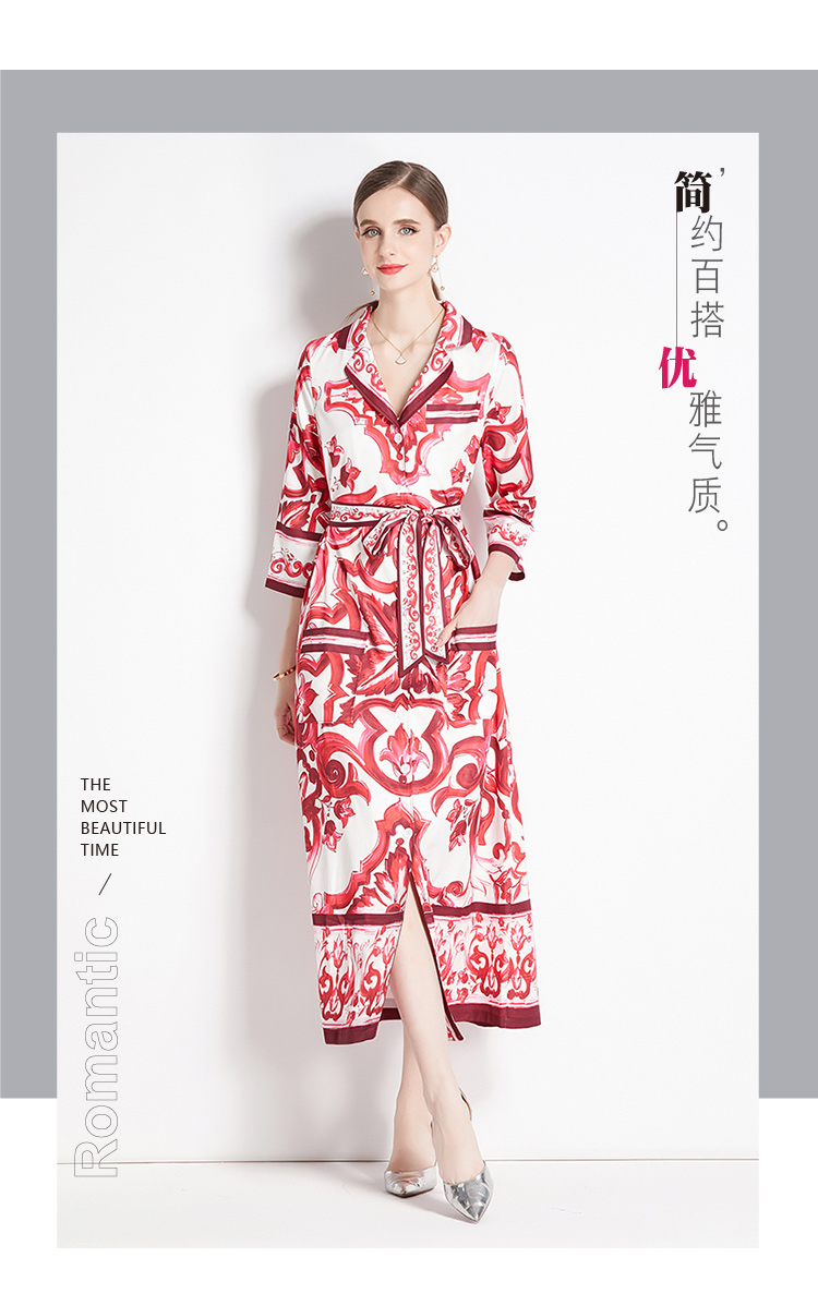 MY14900# 时尚复古V领喇叭短袖开衫多扣印花连衣裙女裝貨源服裝批發