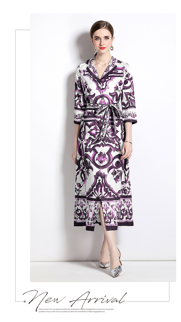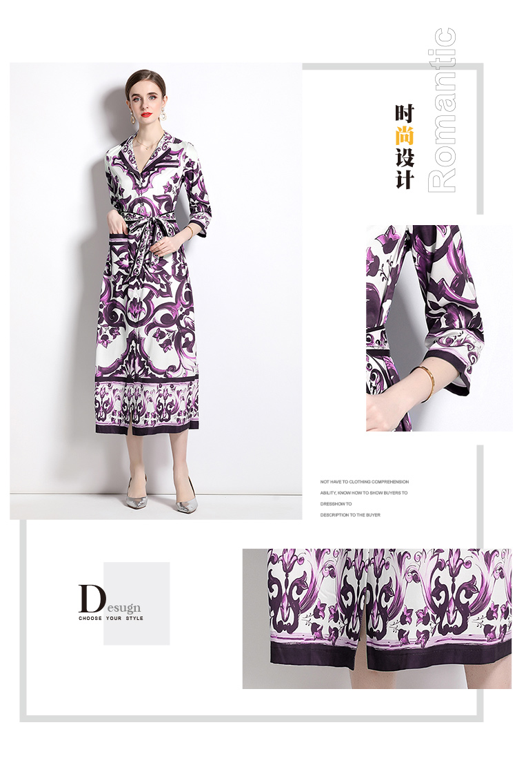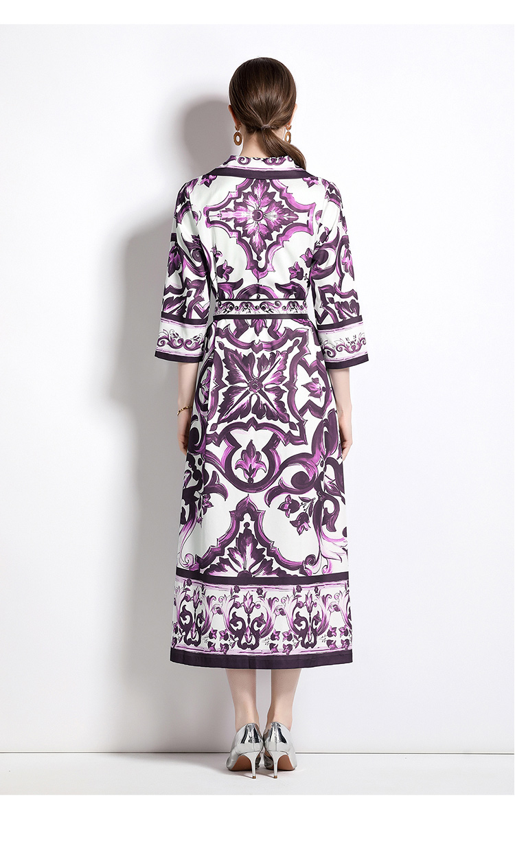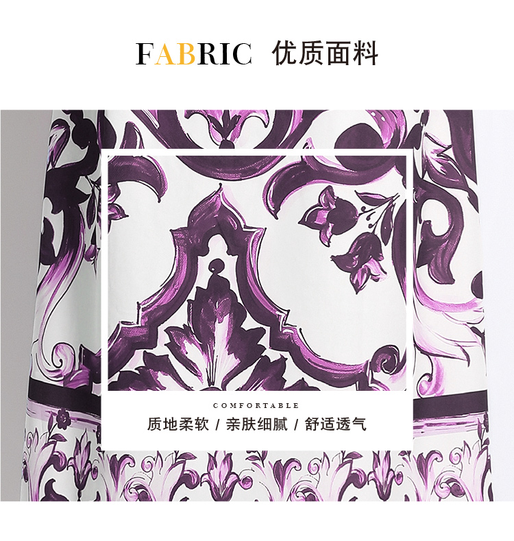 MY14902# 新增色时尚百搭收腰紫花瓷印花短袖单排扣开衫连衣裙女裝貨源...