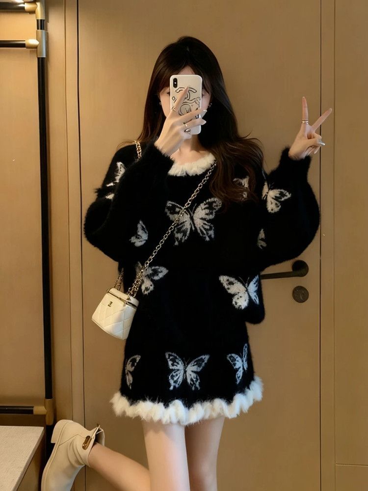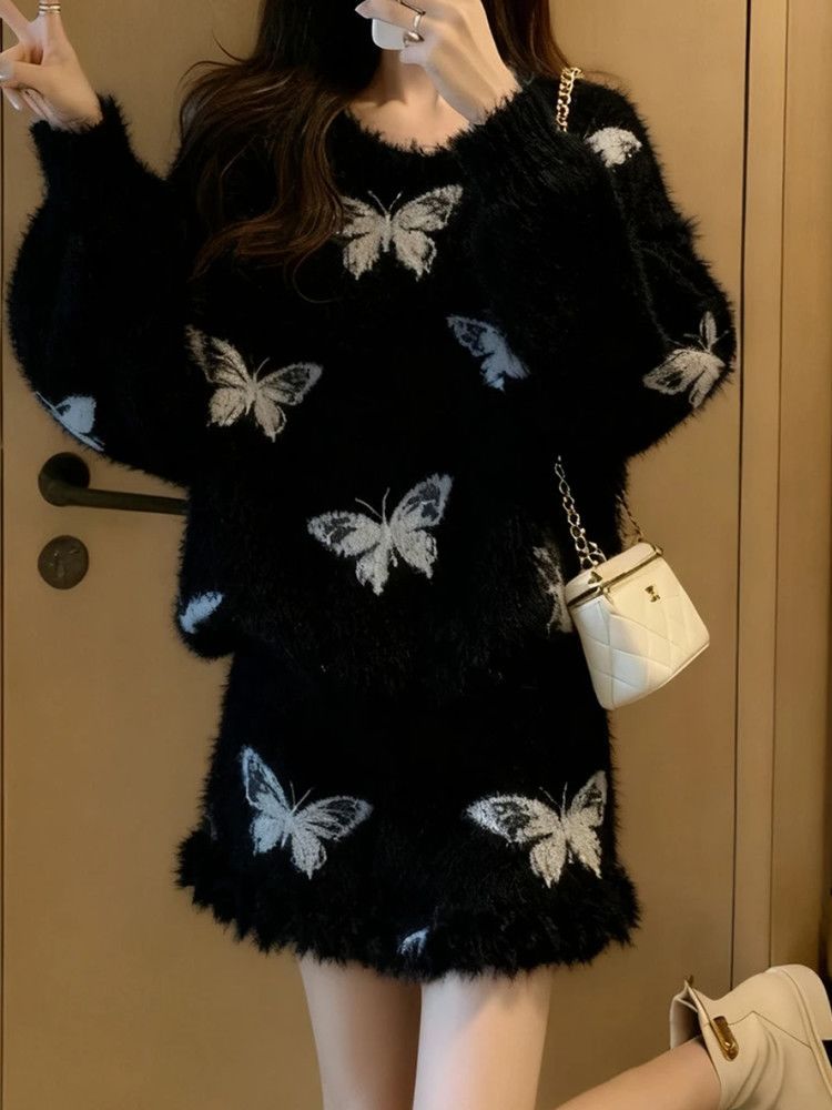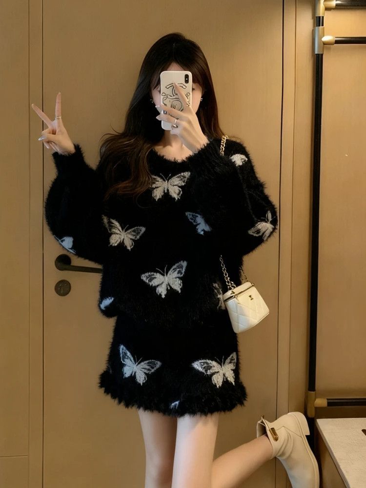 MY16450# 有黑边 和白边 两款 蝴蝶印花拼接毛边设计感针织套装女裝貨源服裝批發