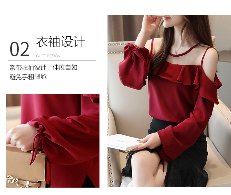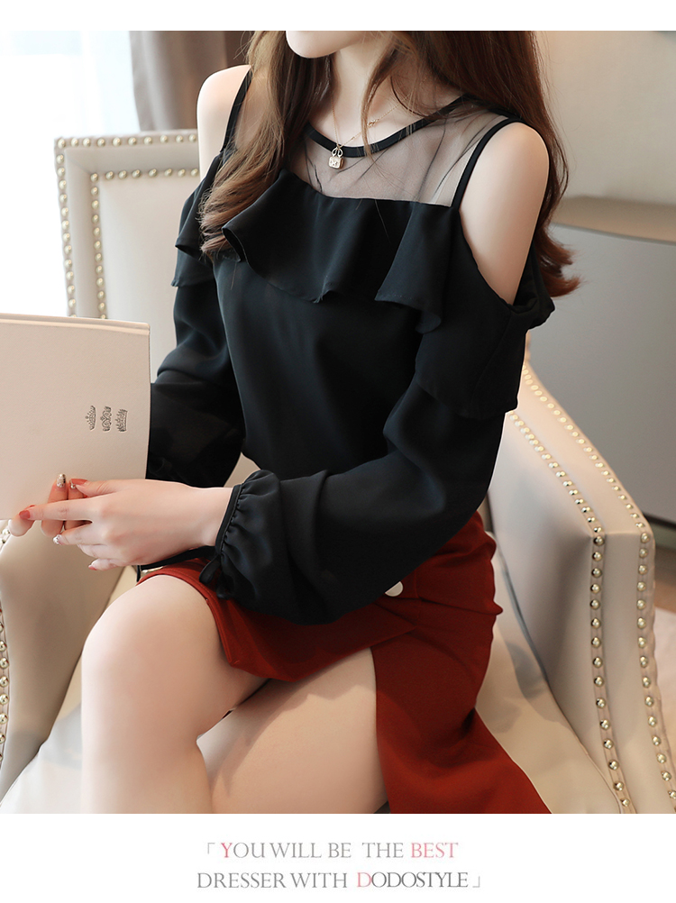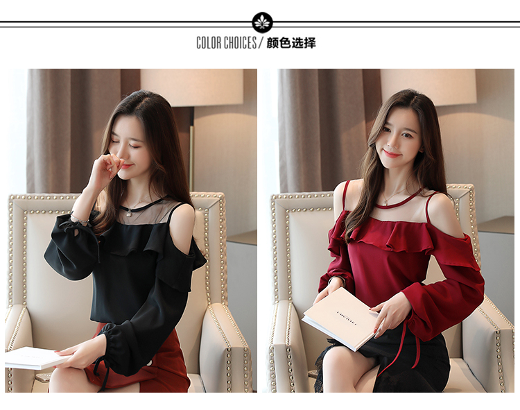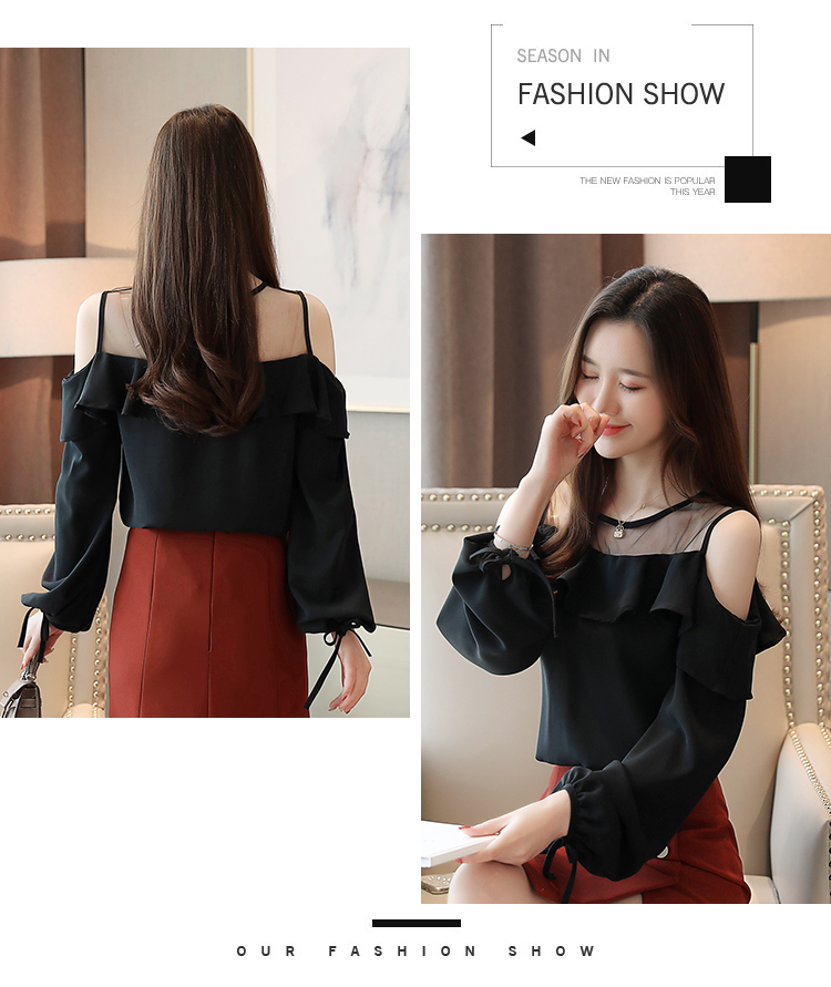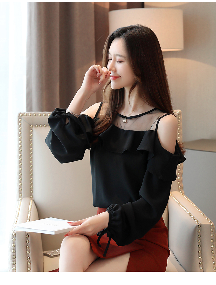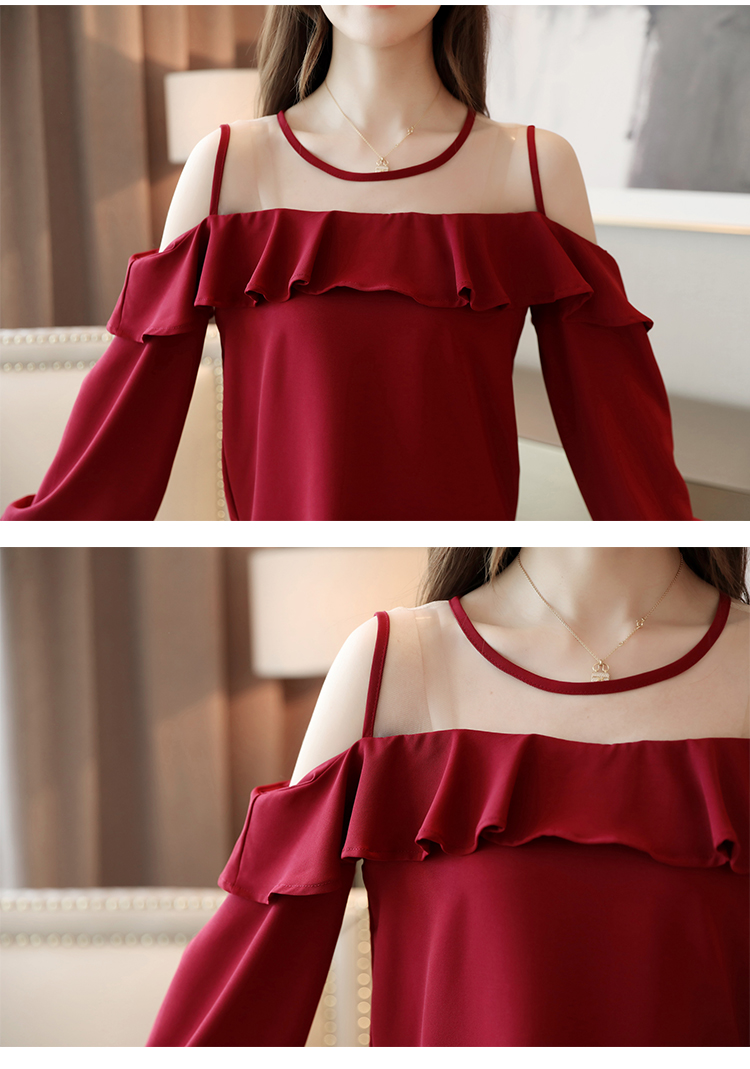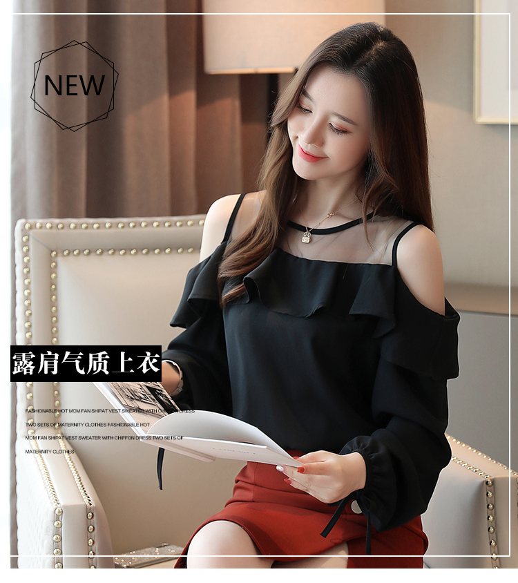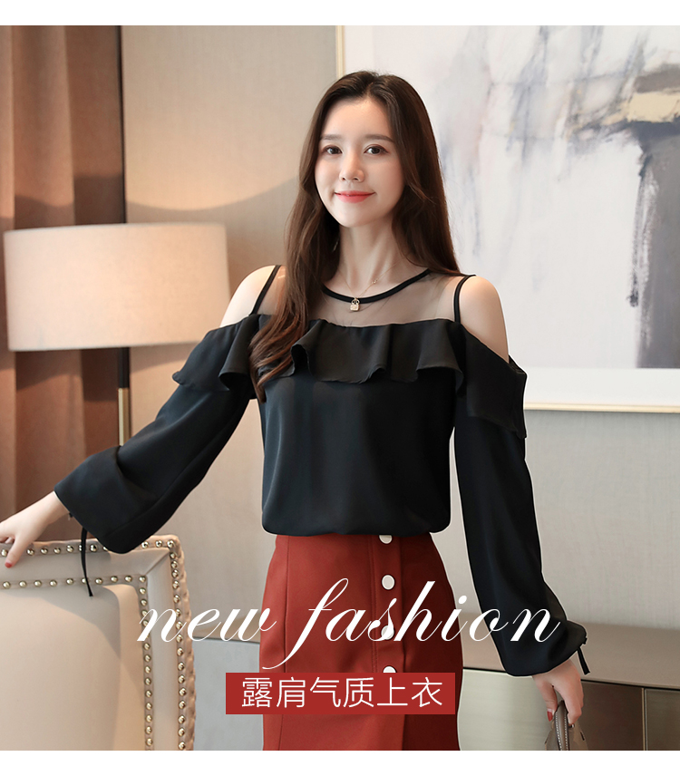 MY16746# 露肩纯色网纱一字领雪纺衫长袖袖宽松上衣女超仙洋气小衫女裝貨源服裝批發