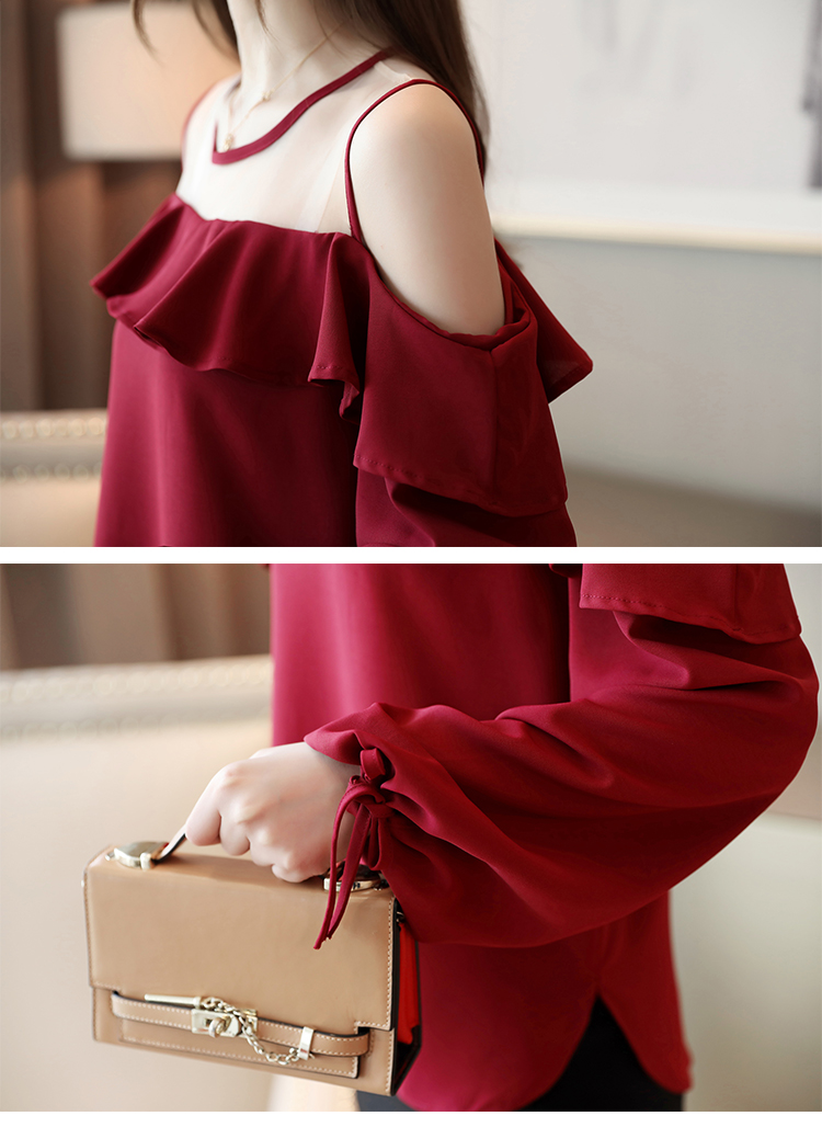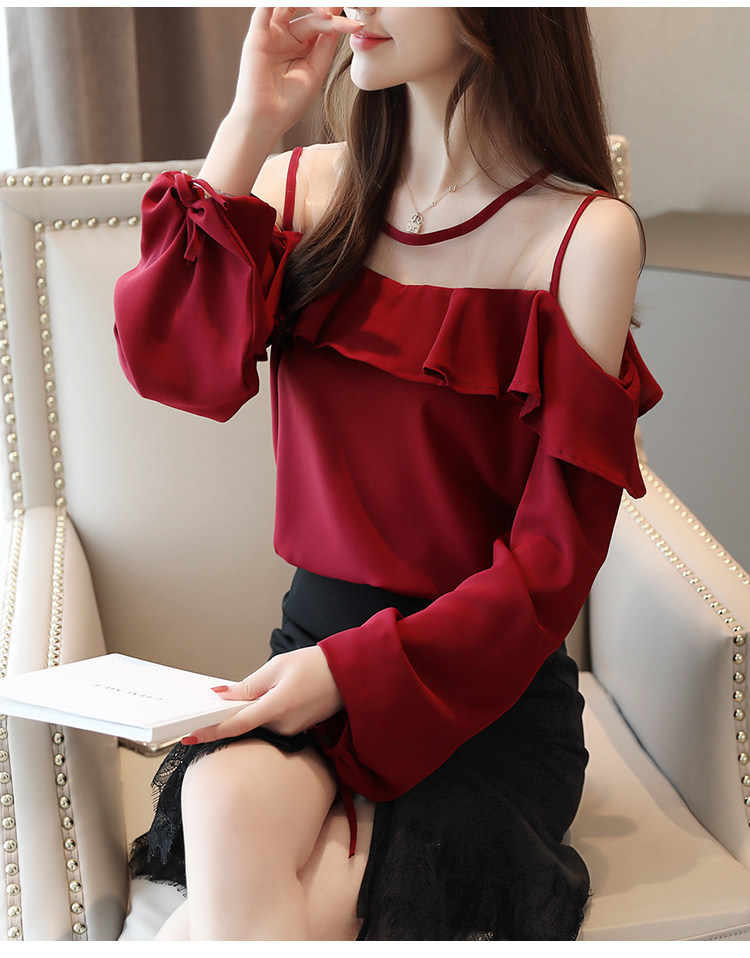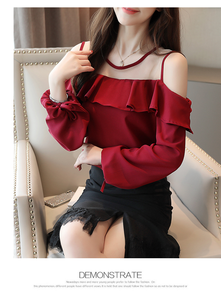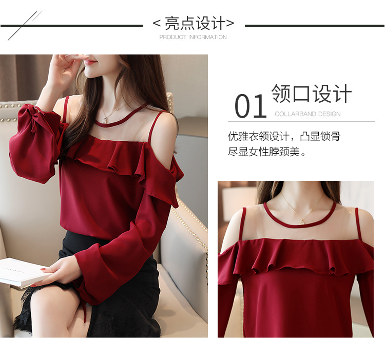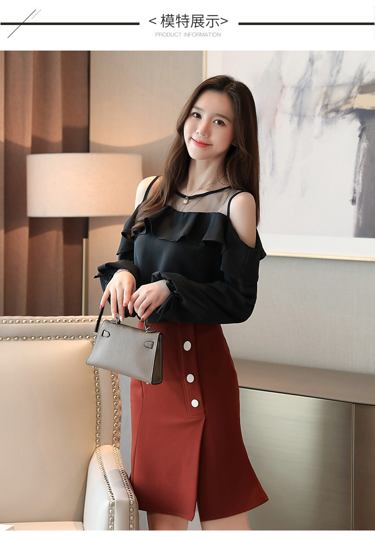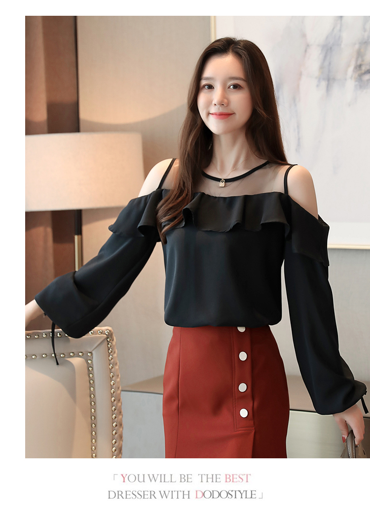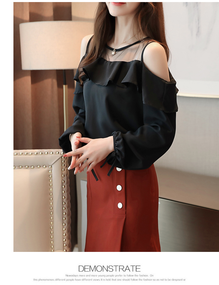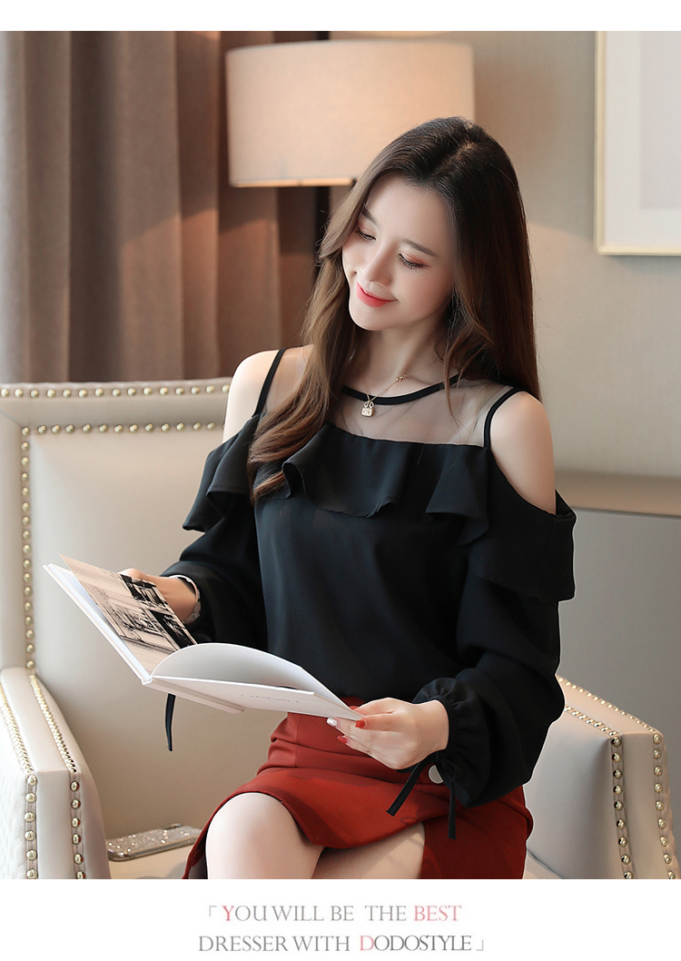 MY16746# 露肩纯色网纱一字领雪纺衫长袖袖宽松上衣女超仙洋气小衫女裝貨源服裝批發