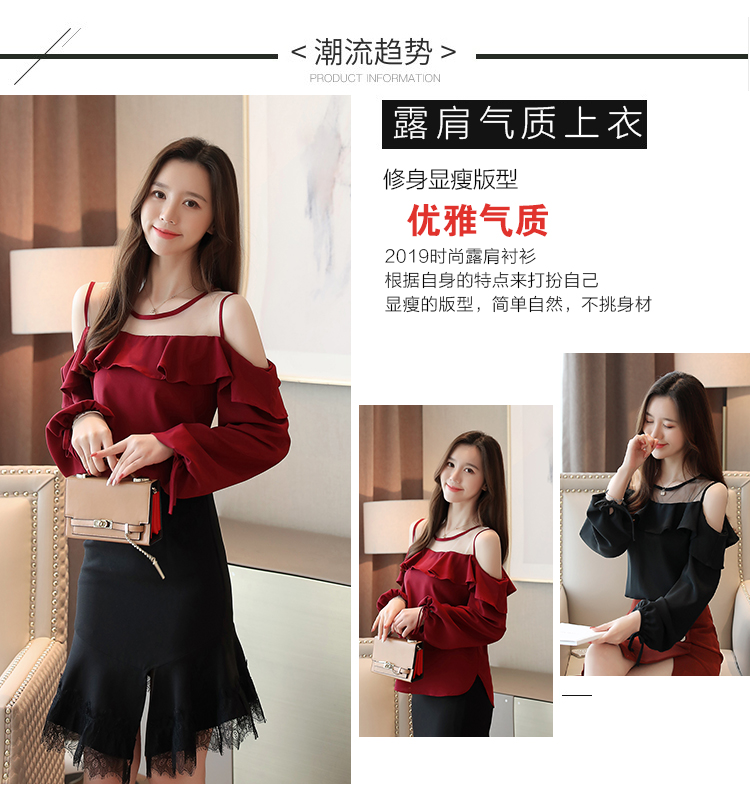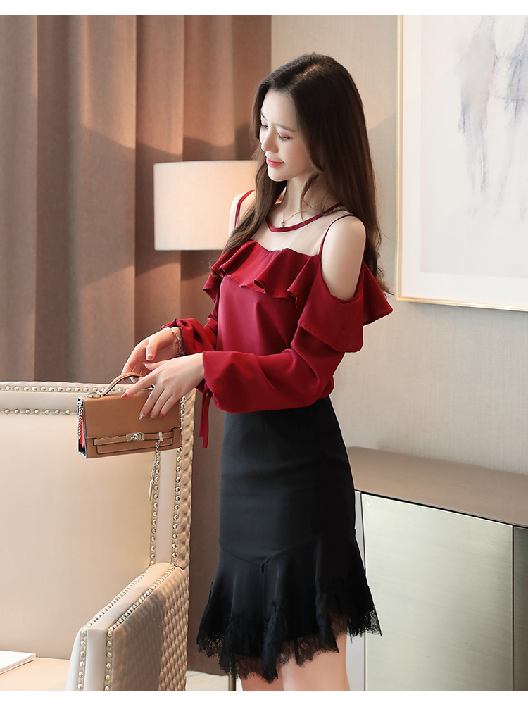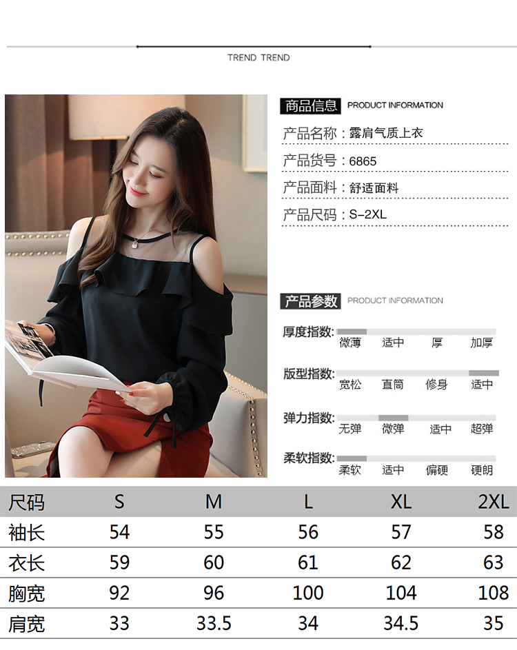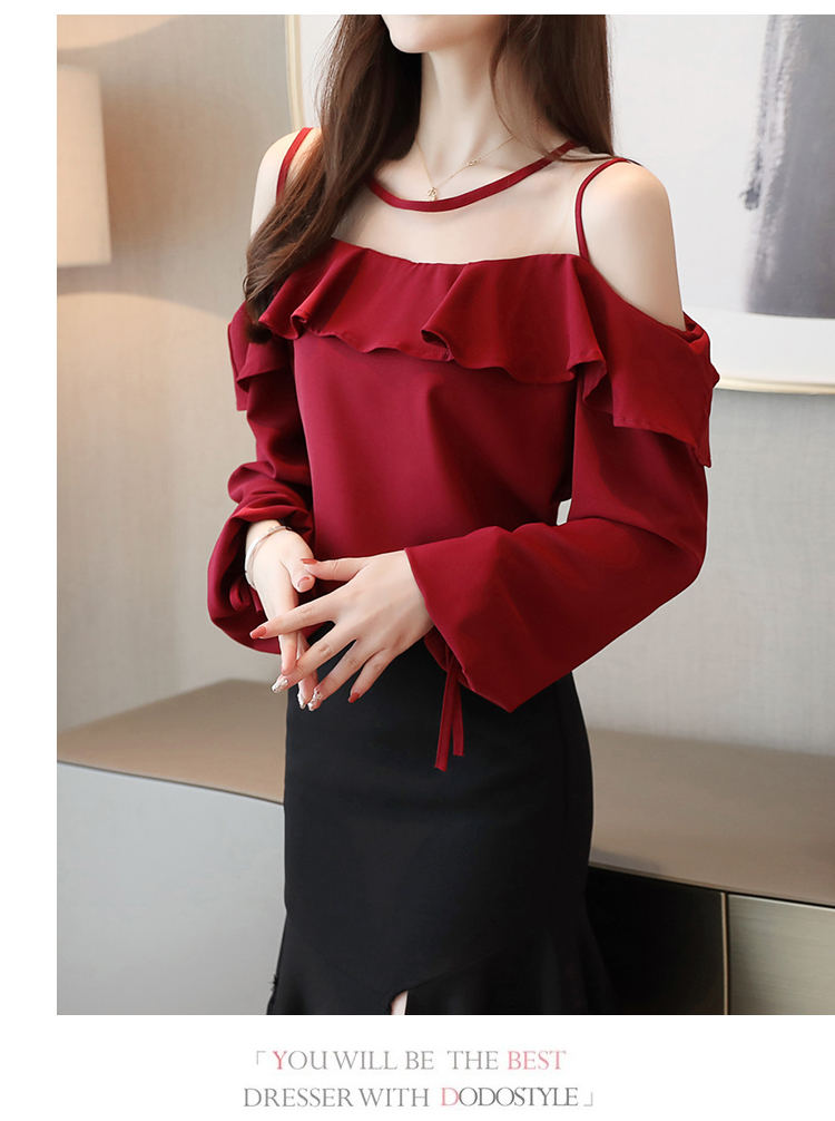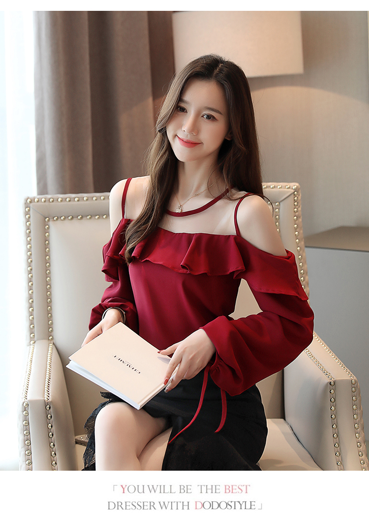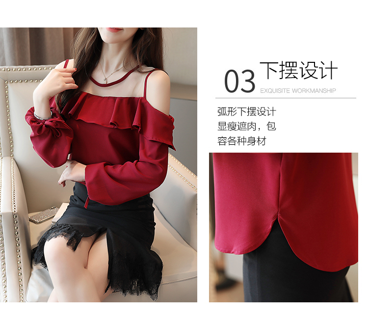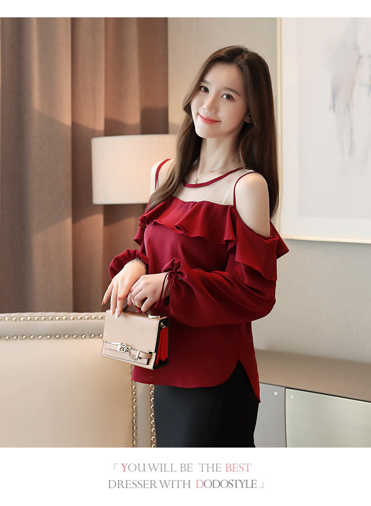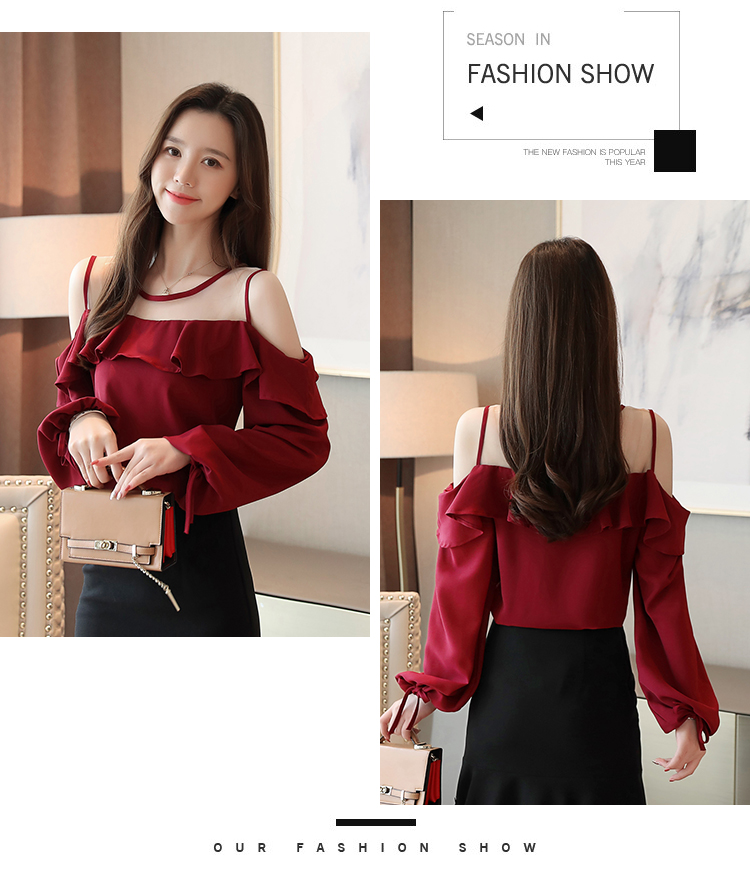 MY16746# 露肩纯色网纱一字领雪纺衫长袖袖宽松上衣女超仙洋气小衫女裝貨源服裝批發
