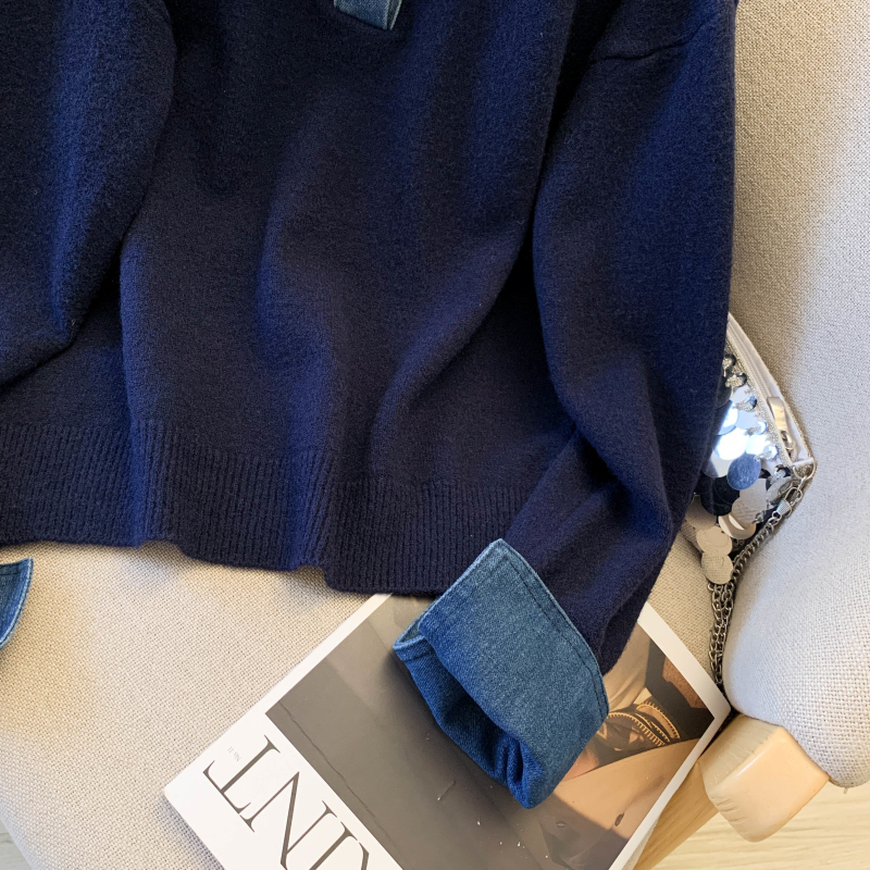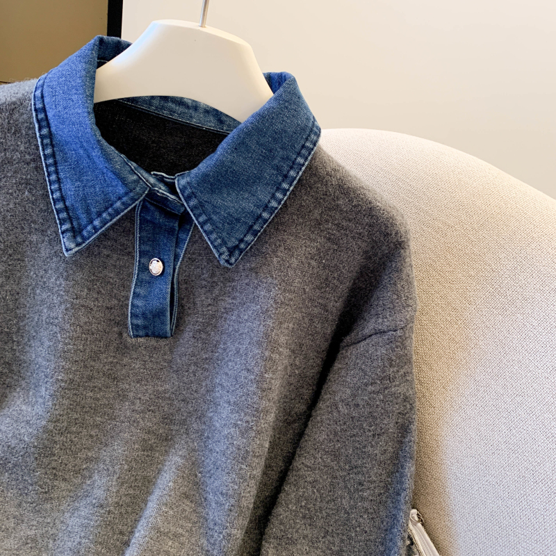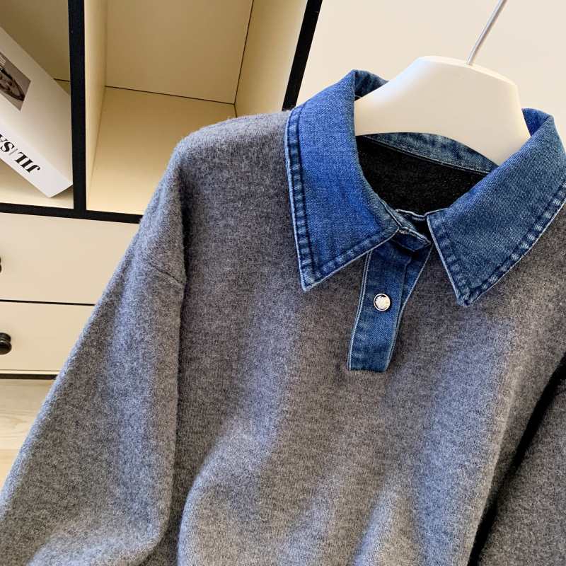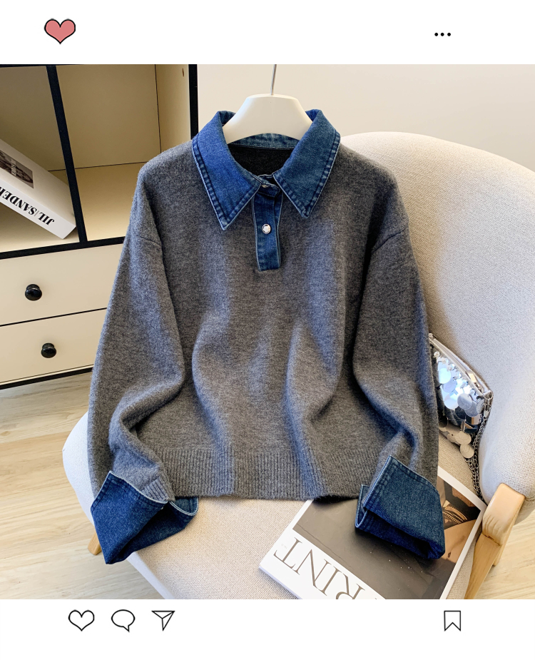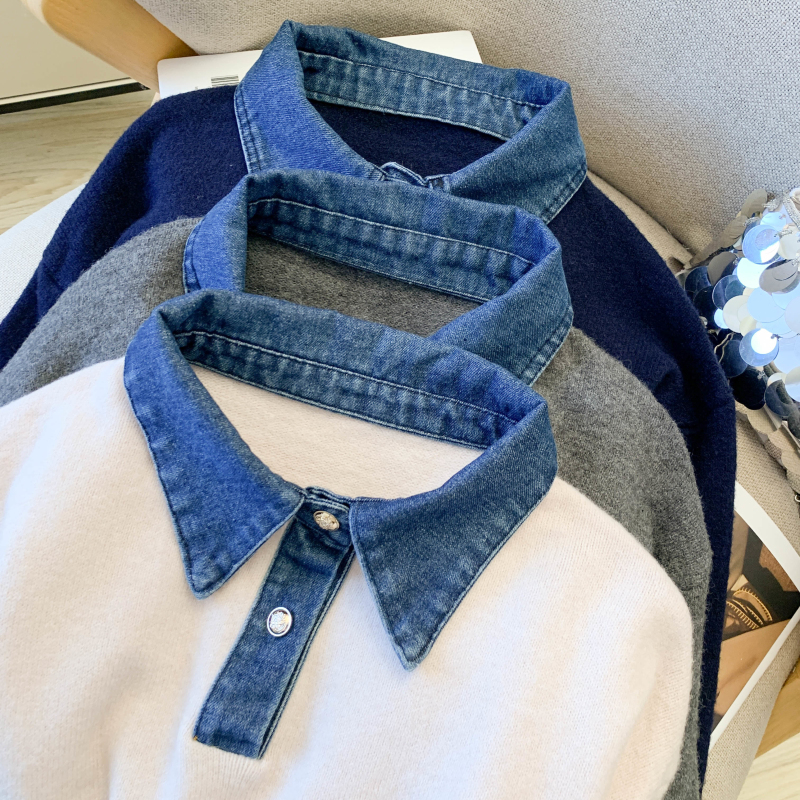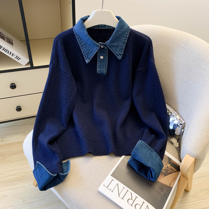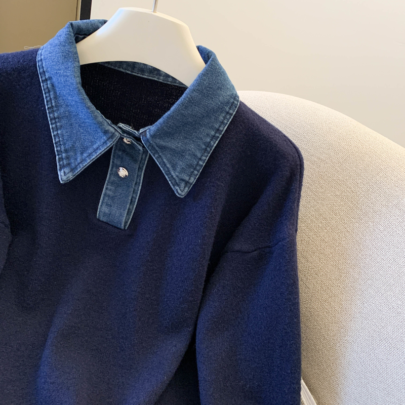 MY16757# 假两件设计感小众加厚牛仔领polo撞色毛衣女针织衫宽松上衣女裝貨源服裝批發