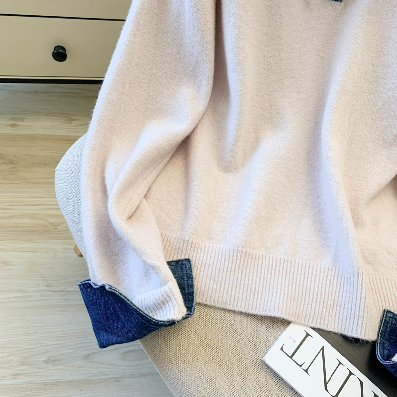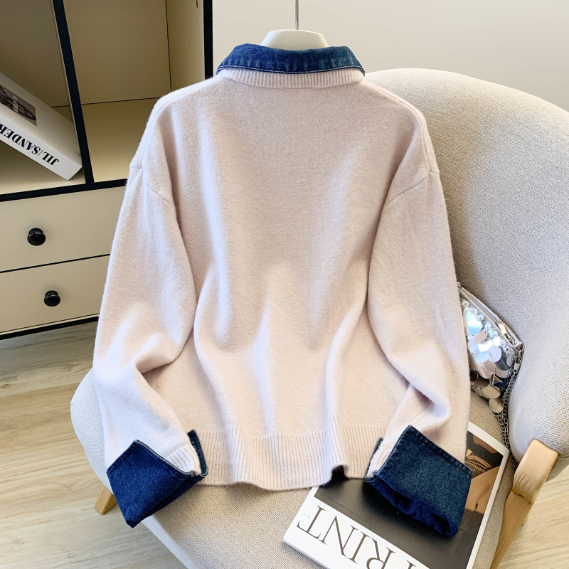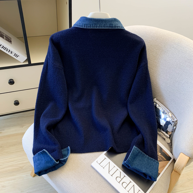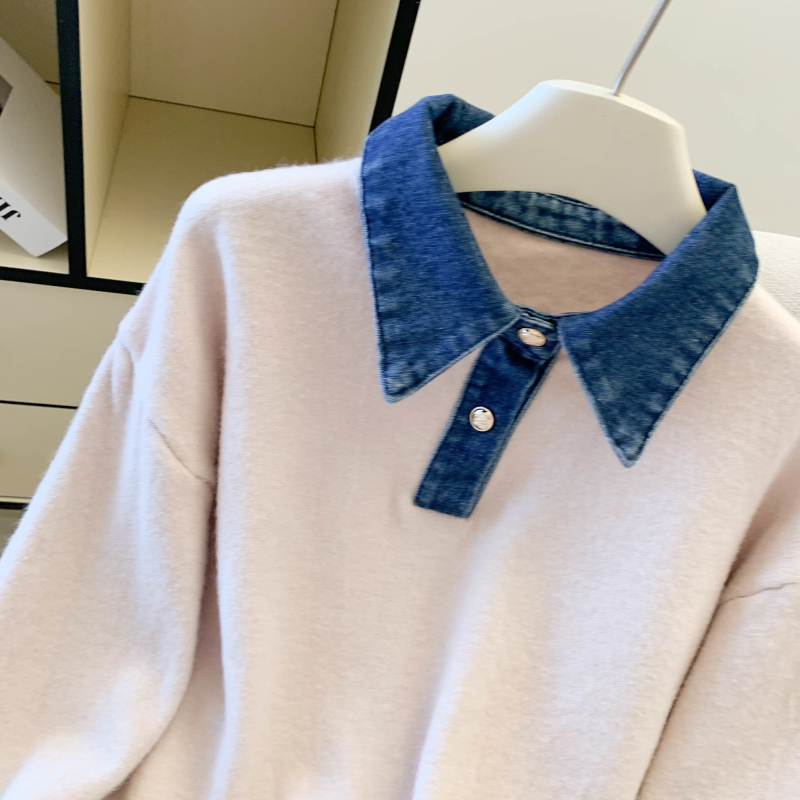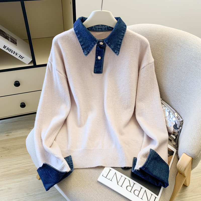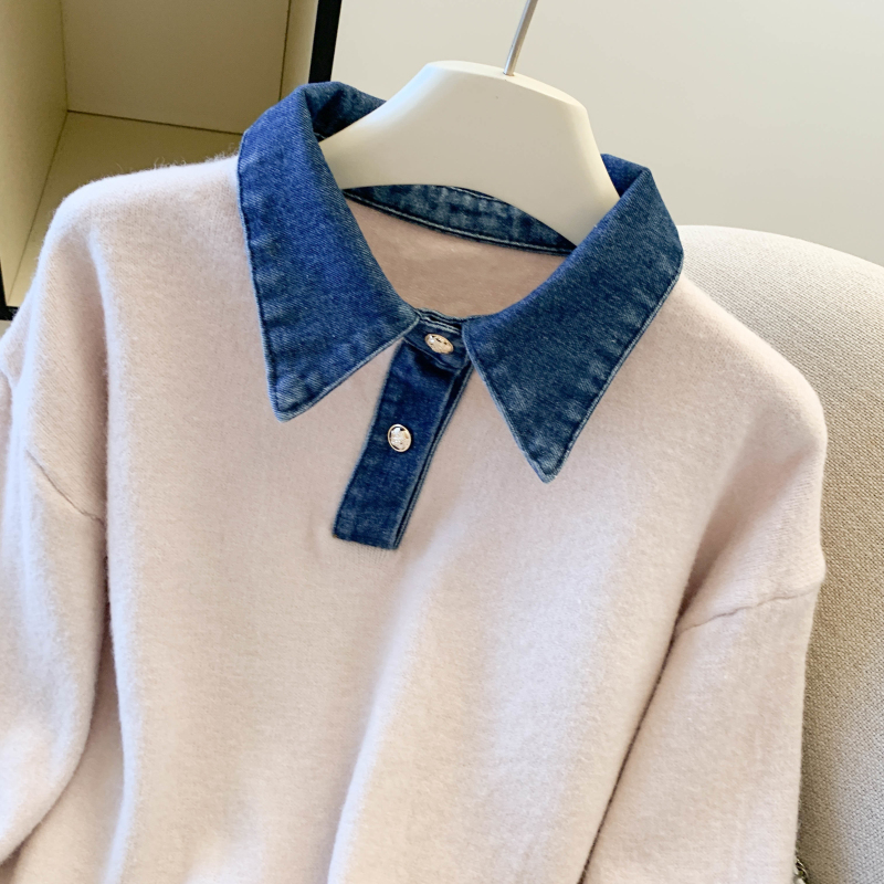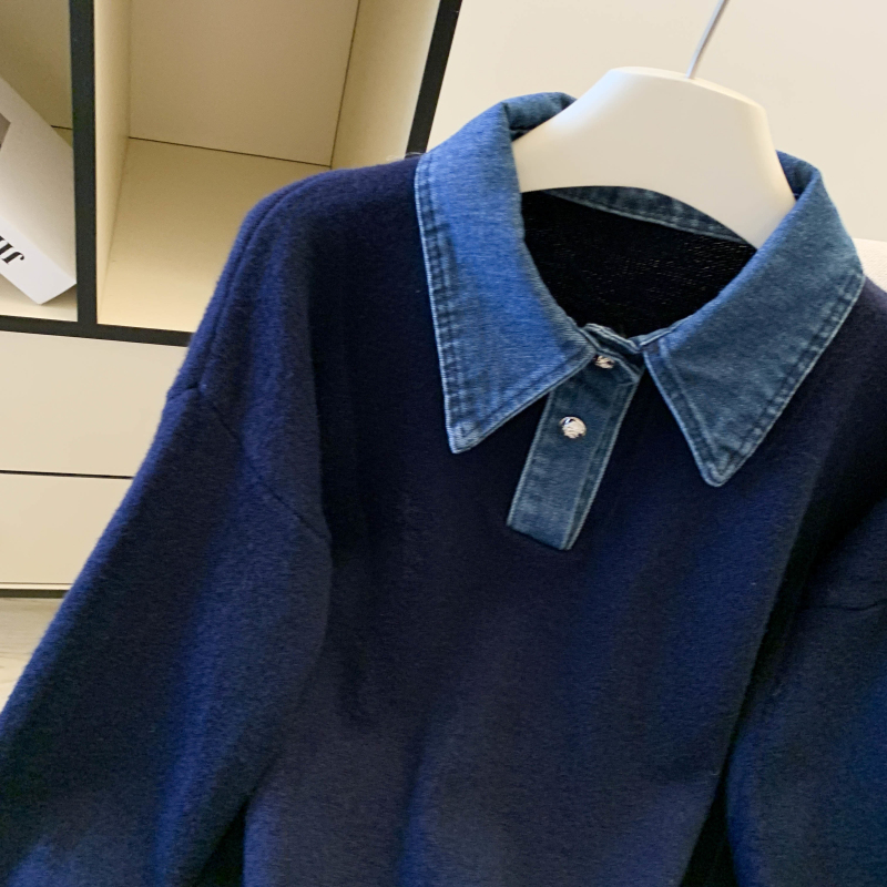MY16757# 假两件设计感小众加厚牛仔领polo撞色毛衣女针织衫宽松上衣女裝貨源服裝批發