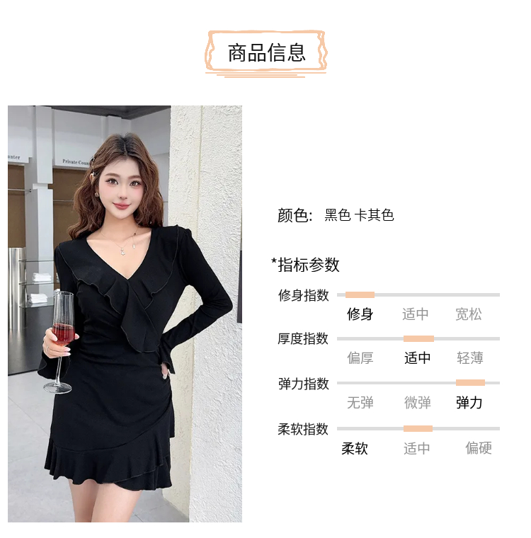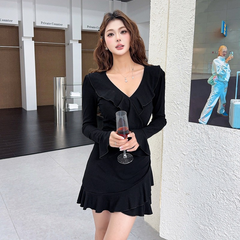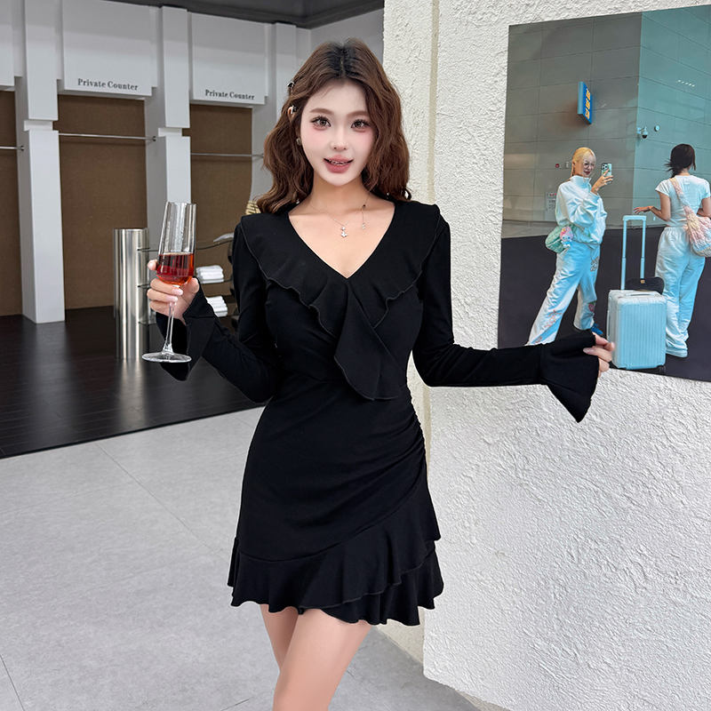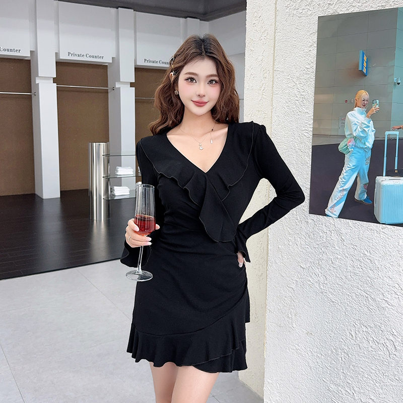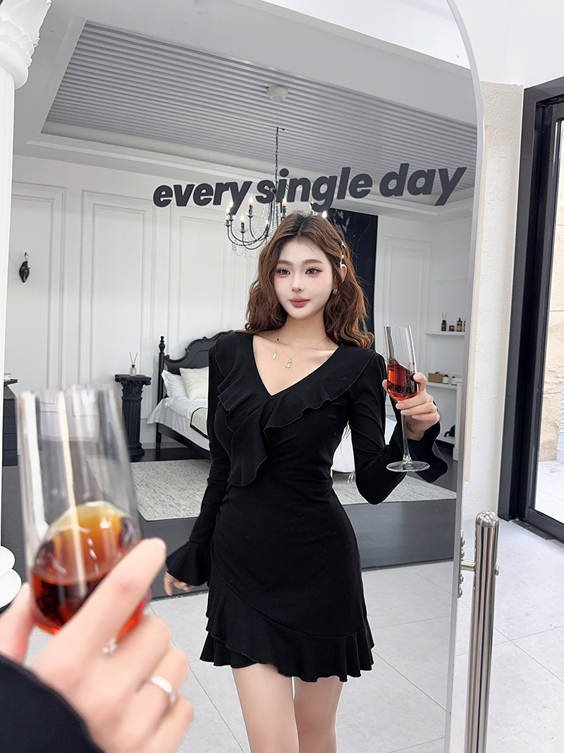 MY16782# 纯欲风性感V领长袖连衣裙新款显瘦荷叶边包臀短裙女裝貨源服裝批發