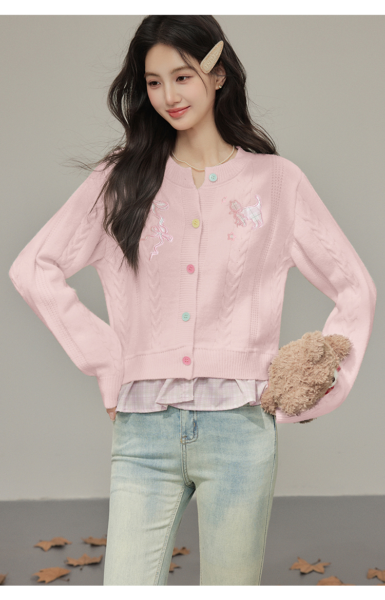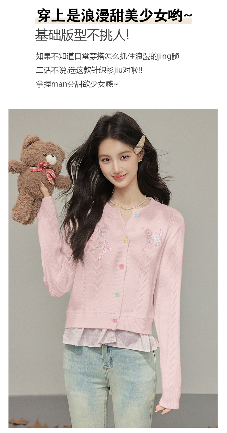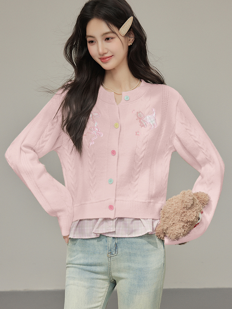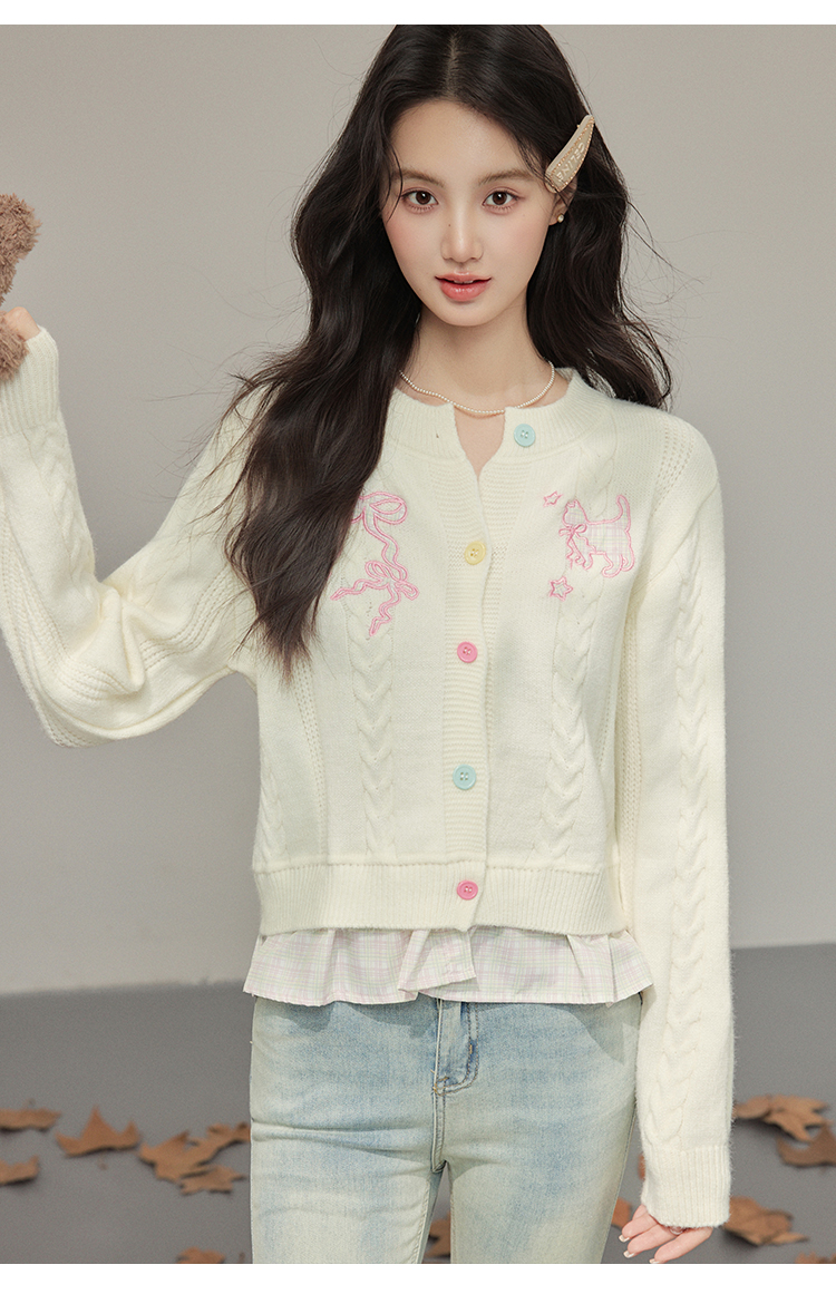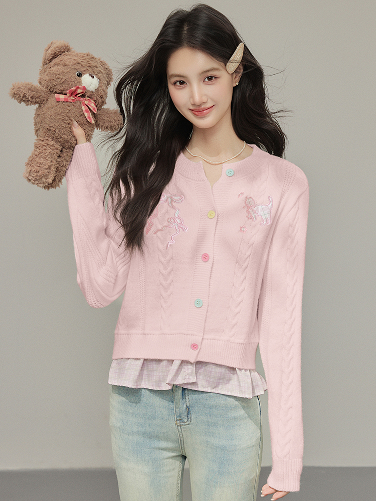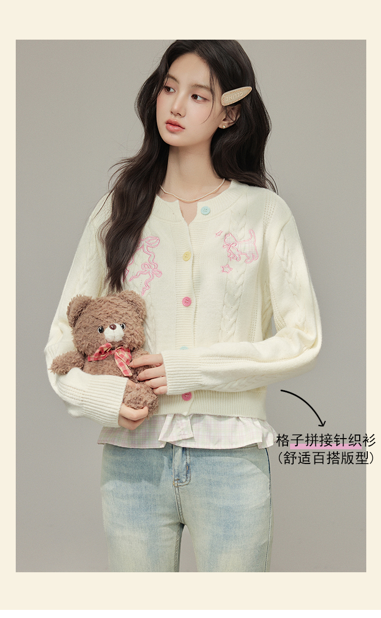 MY16792# 软糯毛衣外套绞花针织开衫糖果色纽扣猫咪下摆格子拼接毛衣女裝貨源服裝批發
