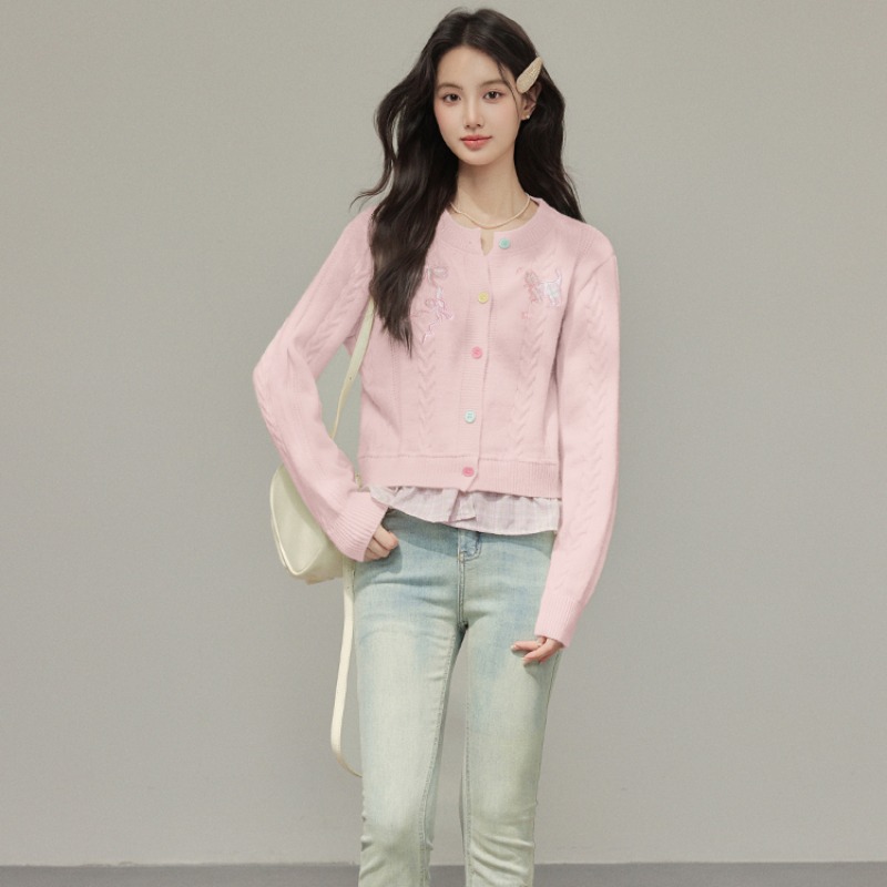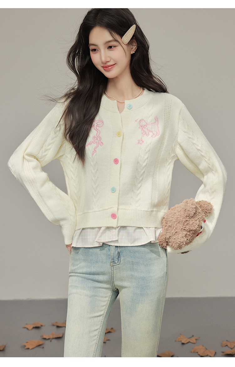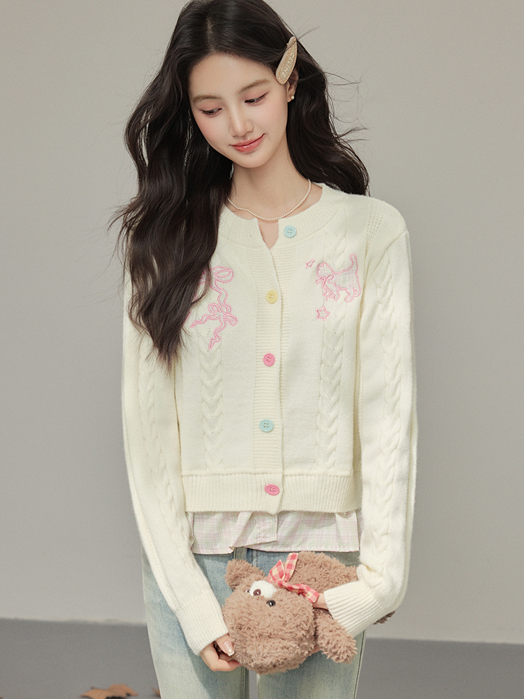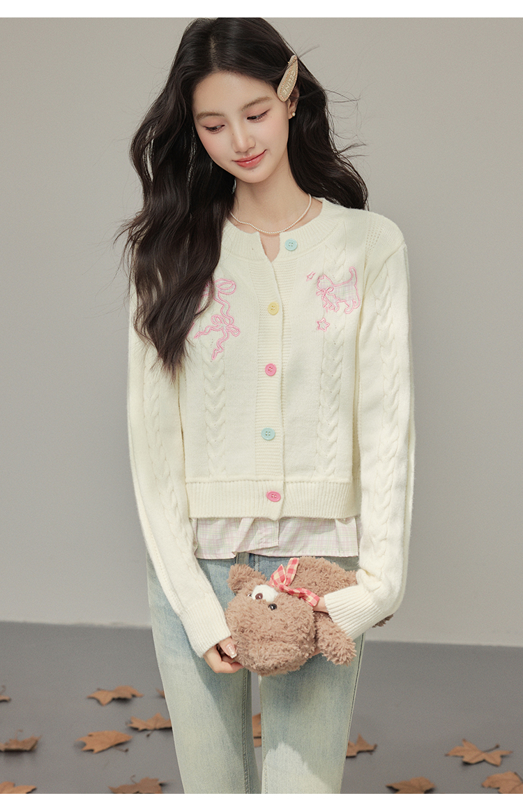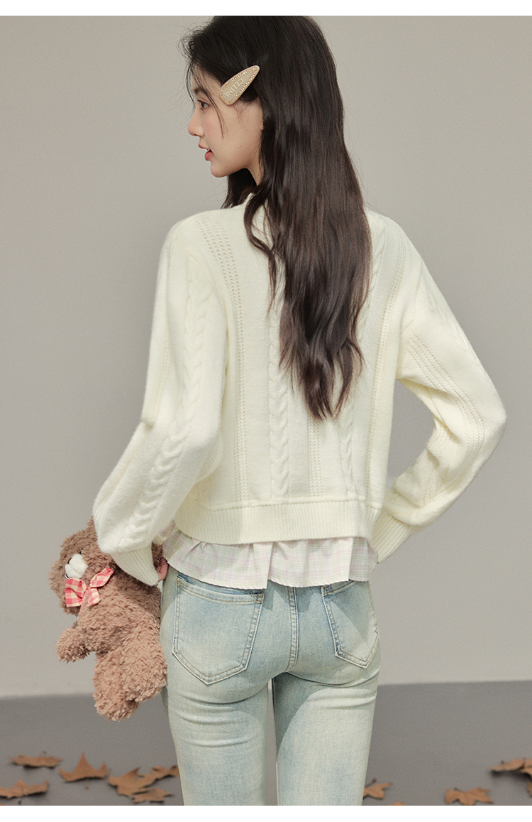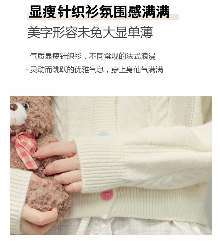 MY16792# 软糯毛衣外套绞花针织开衫糖果色纽扣猫咪下摆格子拼接毛衣女裝貨源服裝批發