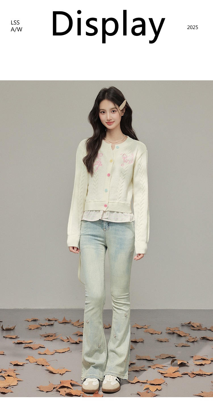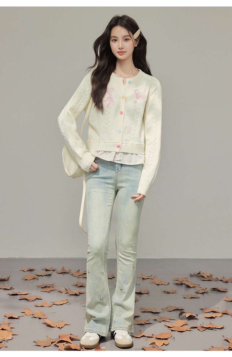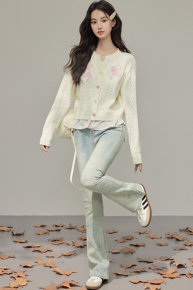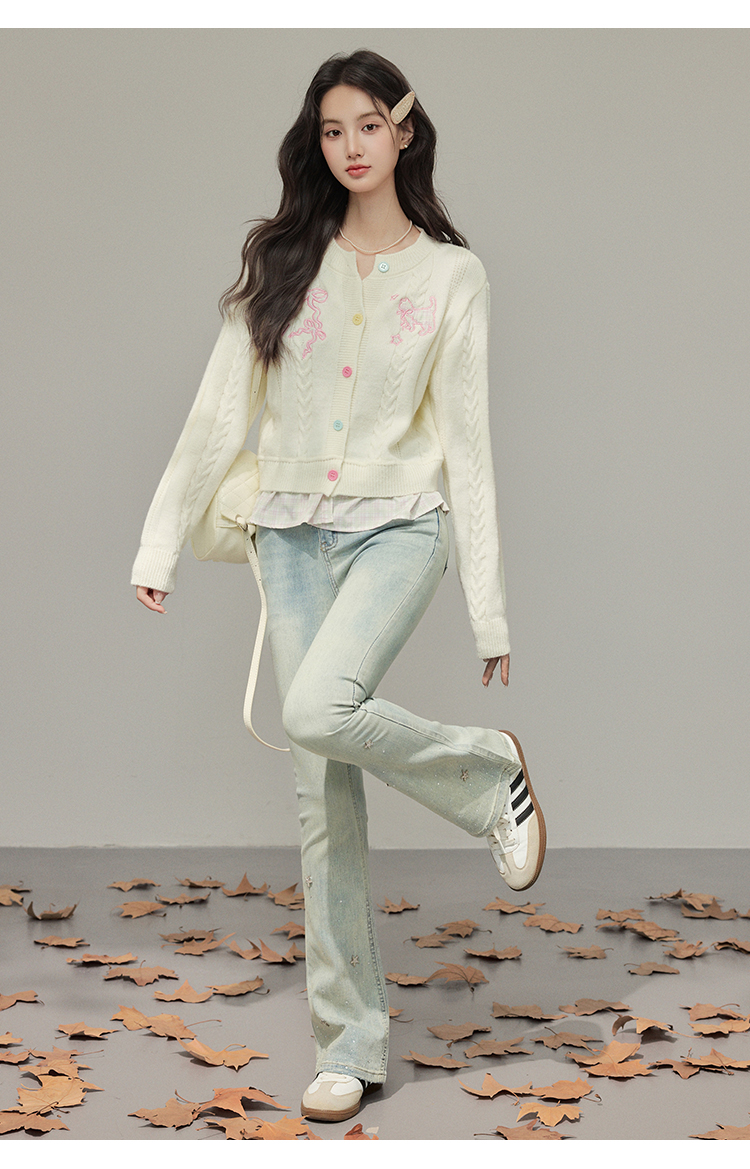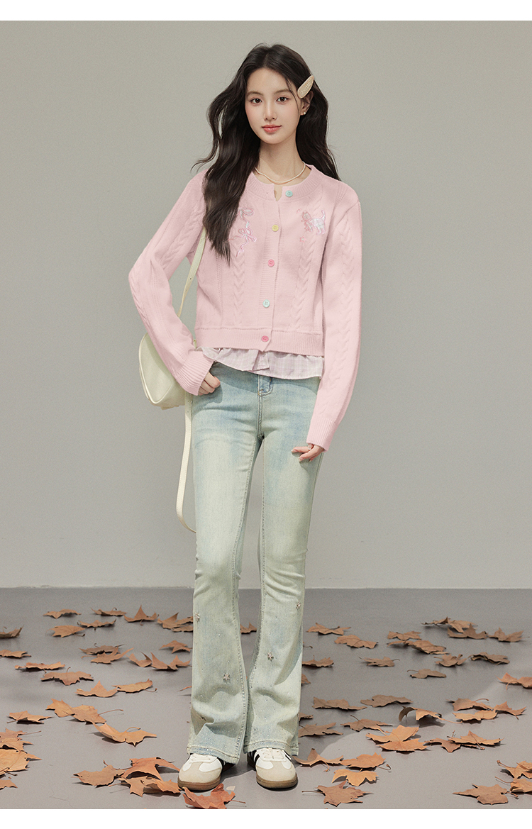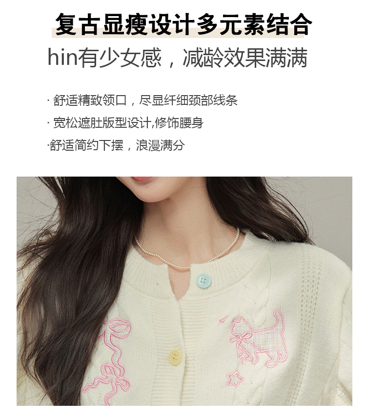 MY16792# 软糯毛衣外套绞花针织开衫糖果色纽扣猫咪下摆格子拼接毛衣女裝貨源服裝批發