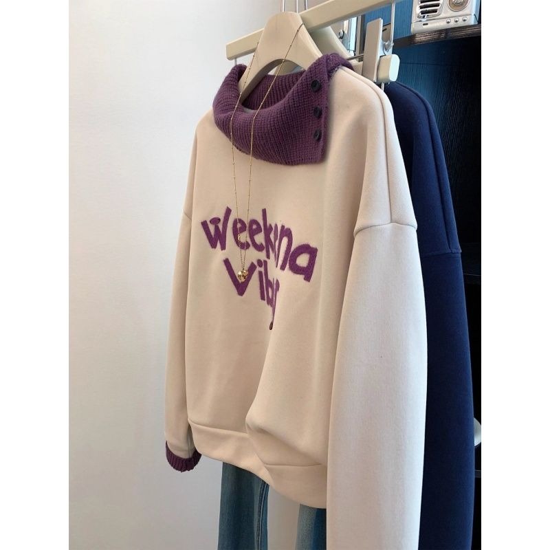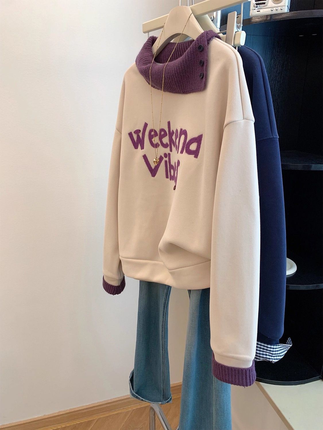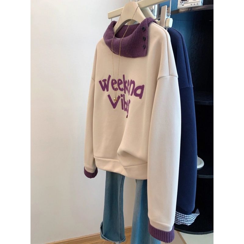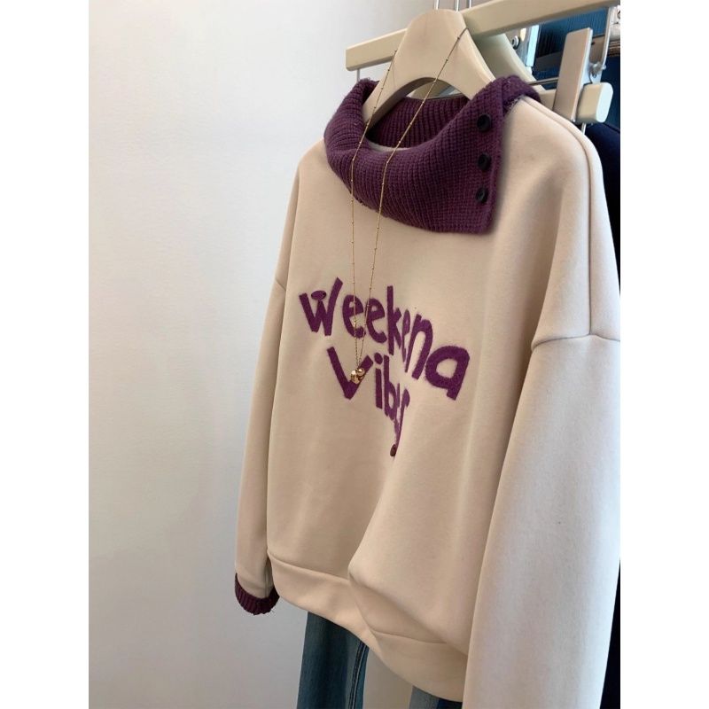MY16807# 原版韩系植绒字母拼接针织假两件落肩袖加绒卫衣宽松上衣潮女裝貨源服裝批發