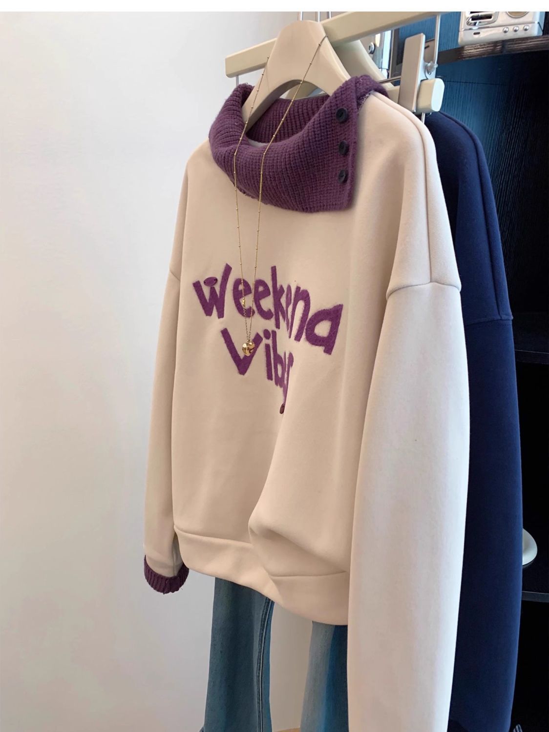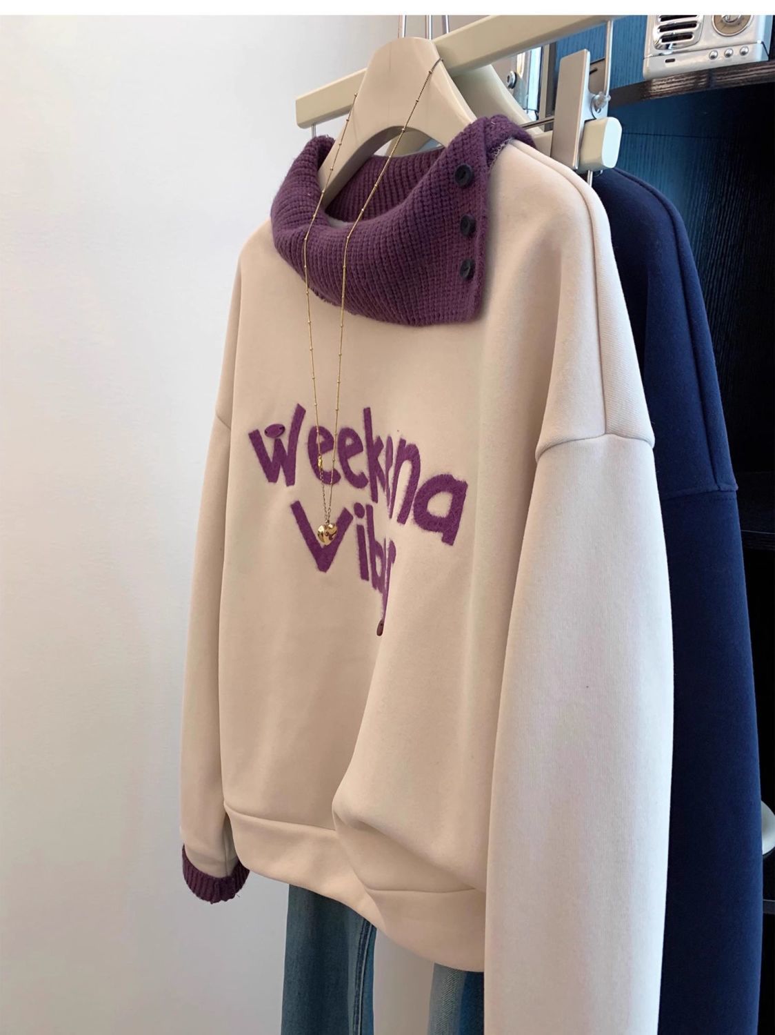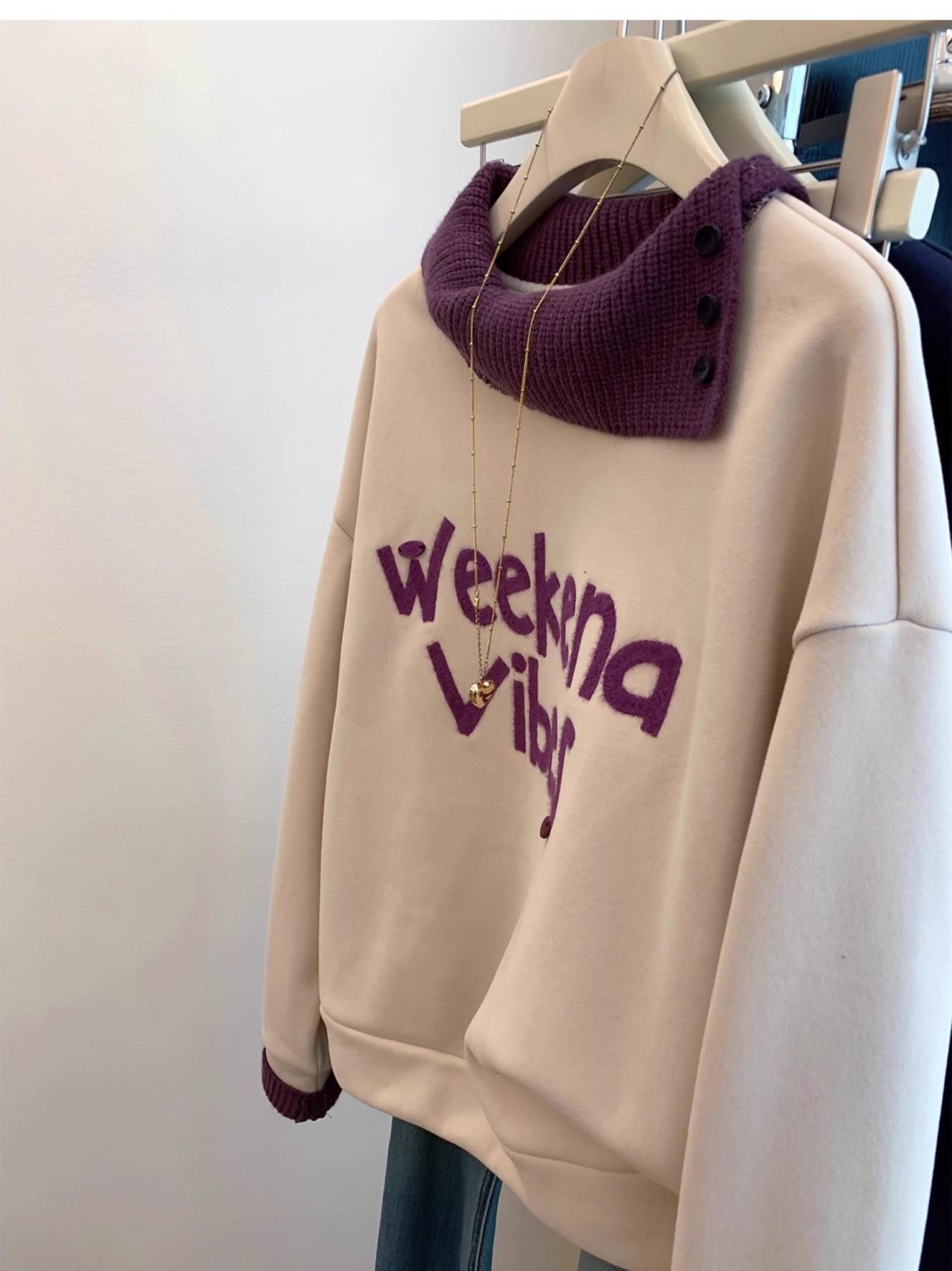 MY16807# 原版韩系植绒字母拼接针织假两件落肩袖加绒卫衣宽松上衣潮女裝貨源服裝批發