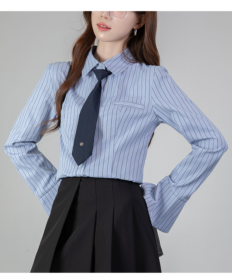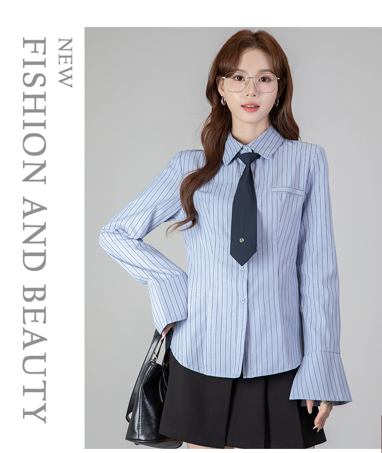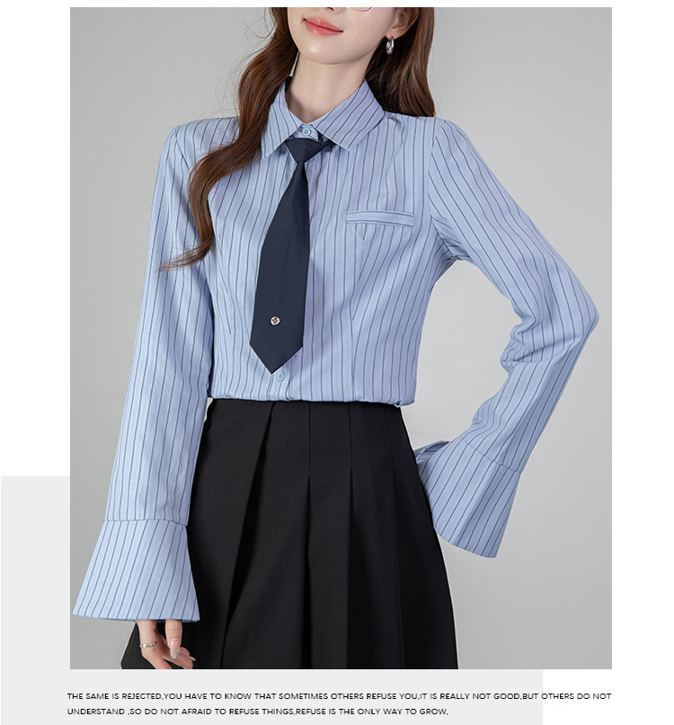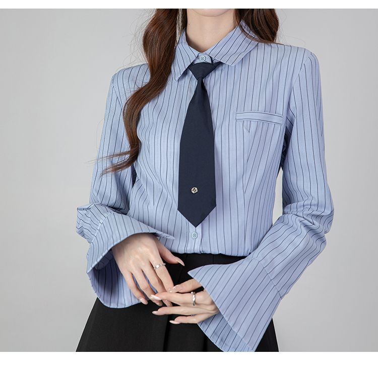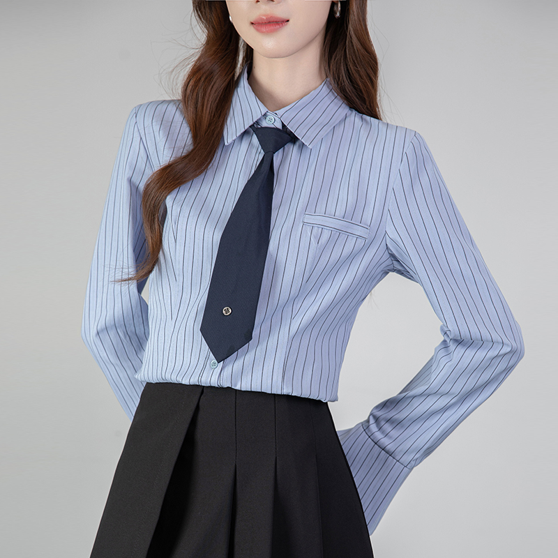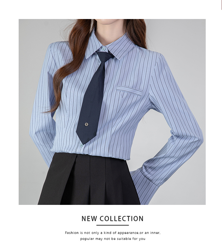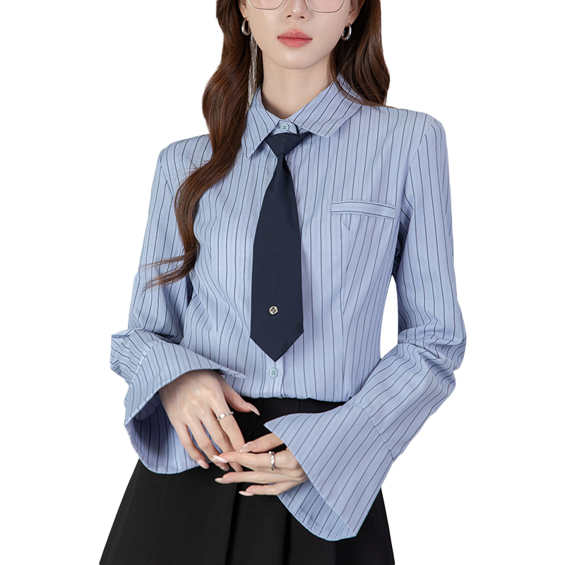 MY16821# 女装蓝色长袖慵懒风上衣条纹气质衬衫女女裝貨源服裝批發
