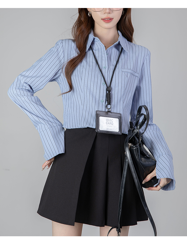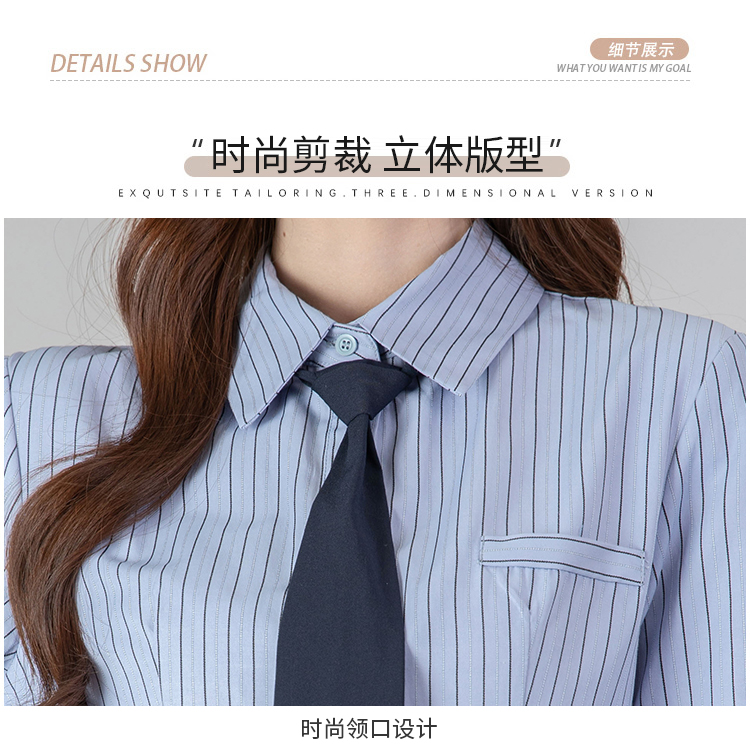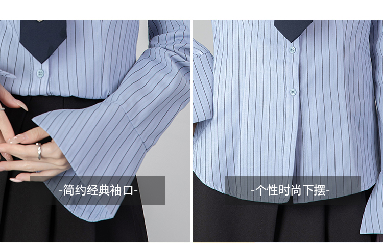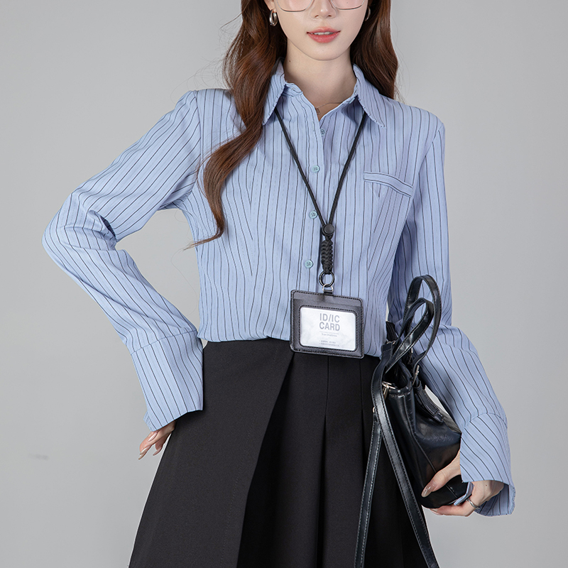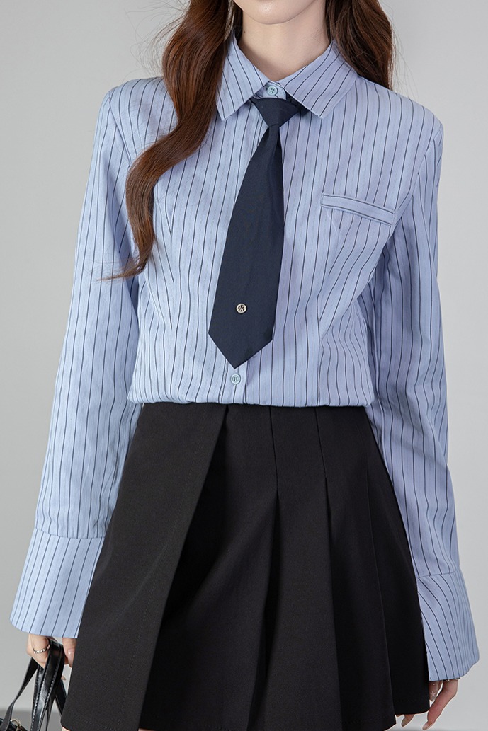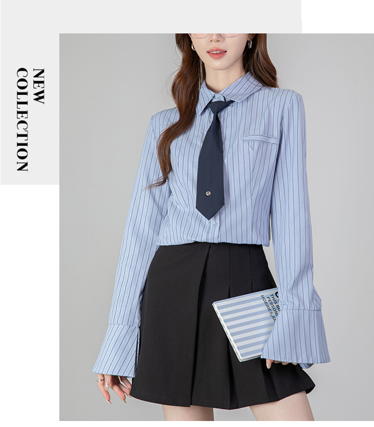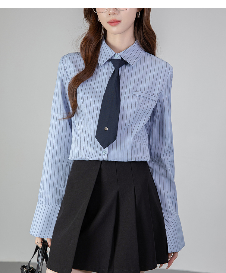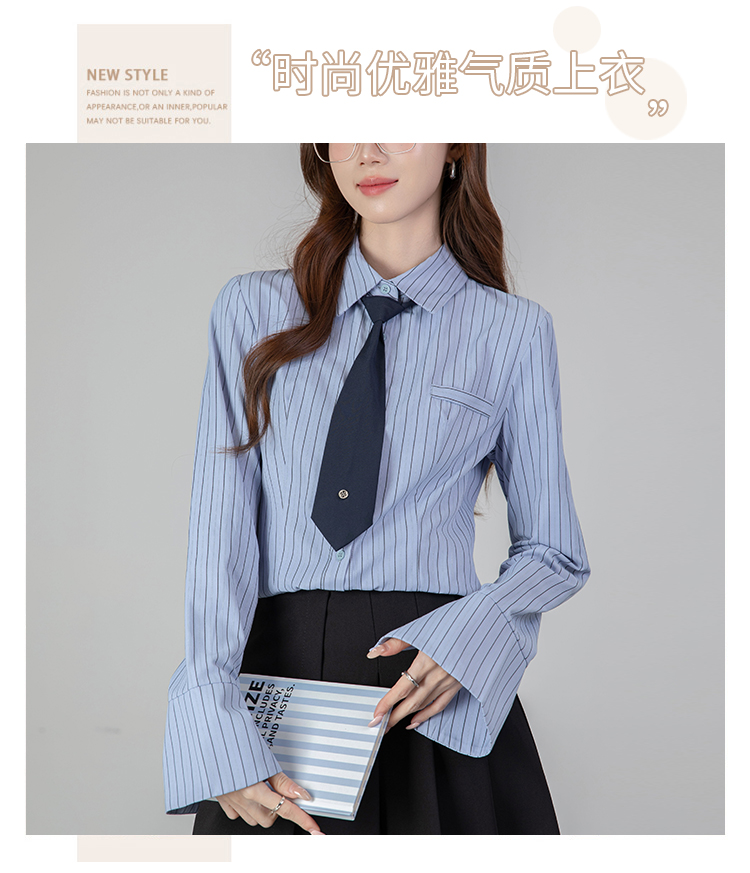 MY16821# 女装蓝色长袖慵懒风上衣条纹气质衬衫女女裝貨源服裝批發