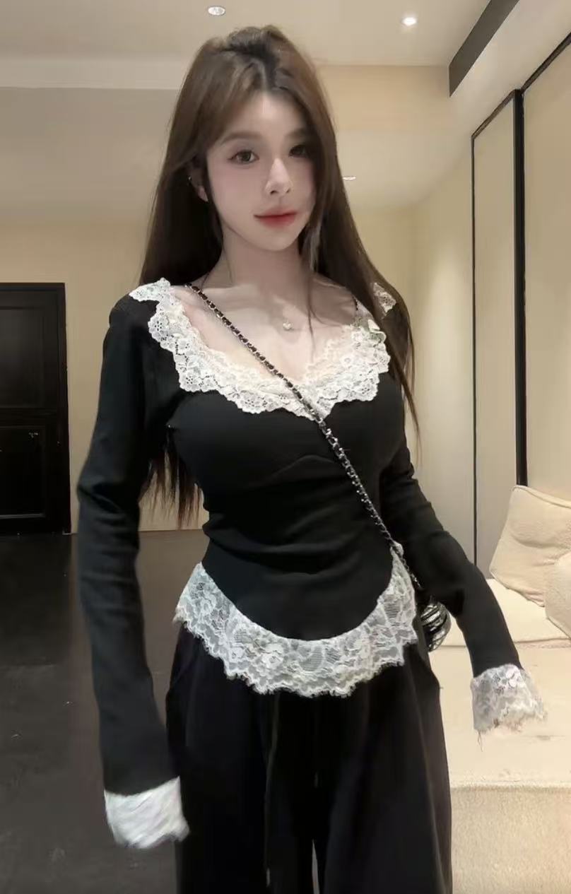 MY16823# 蕾丝花边领拼接V领长袖T恤女春季修身收腰温柔内搭打底针织衫上衣女裝貨源服裝批發