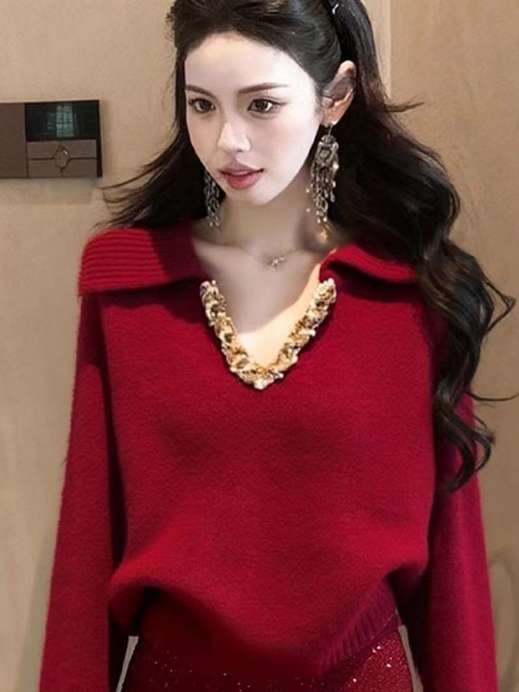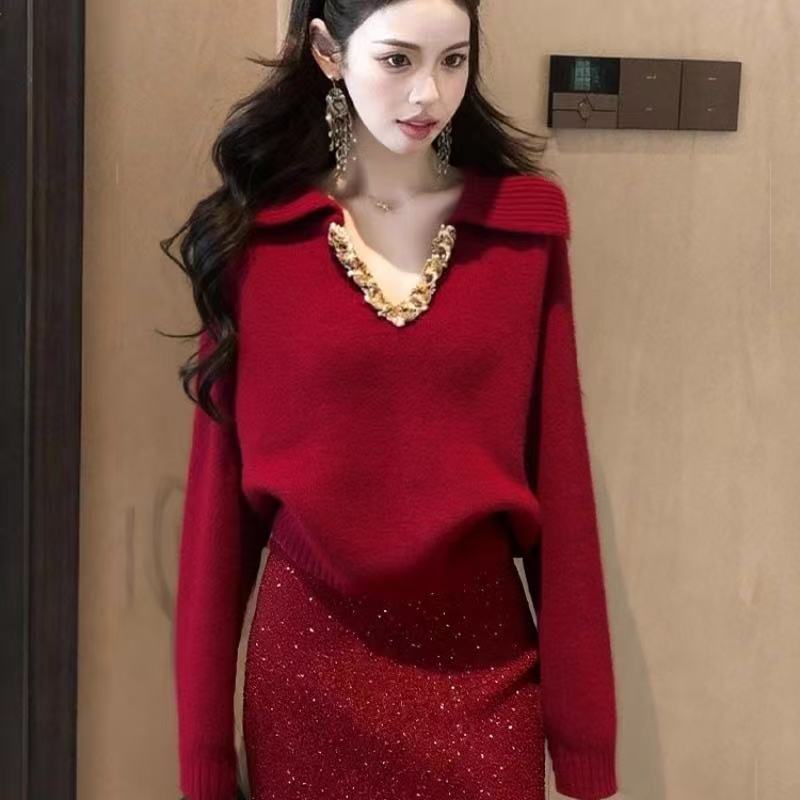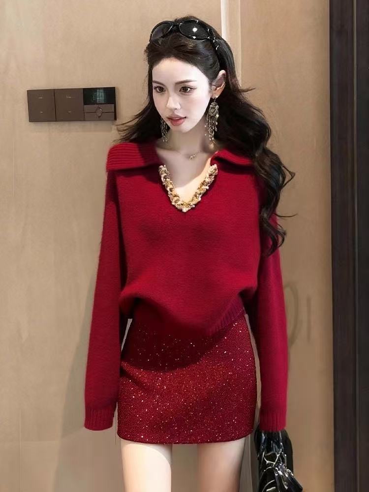 MY16824# 小个子圣诞风套装女减龄红色圣诞精致绝美针织毛衣短裙两件套女裝貨源服裝批發