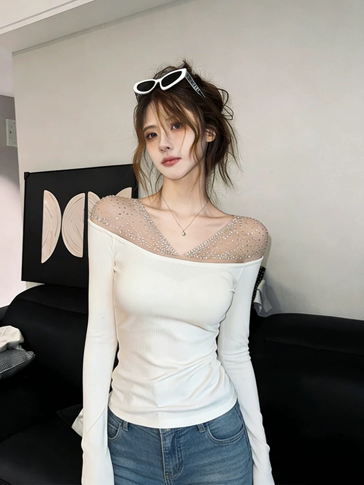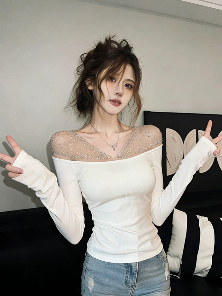 MY16835# 韩系不规则烫钻网纱V领长袖T恤衫气质辣妹拼接显瘦内搭上衣女裝貨源服裝批發