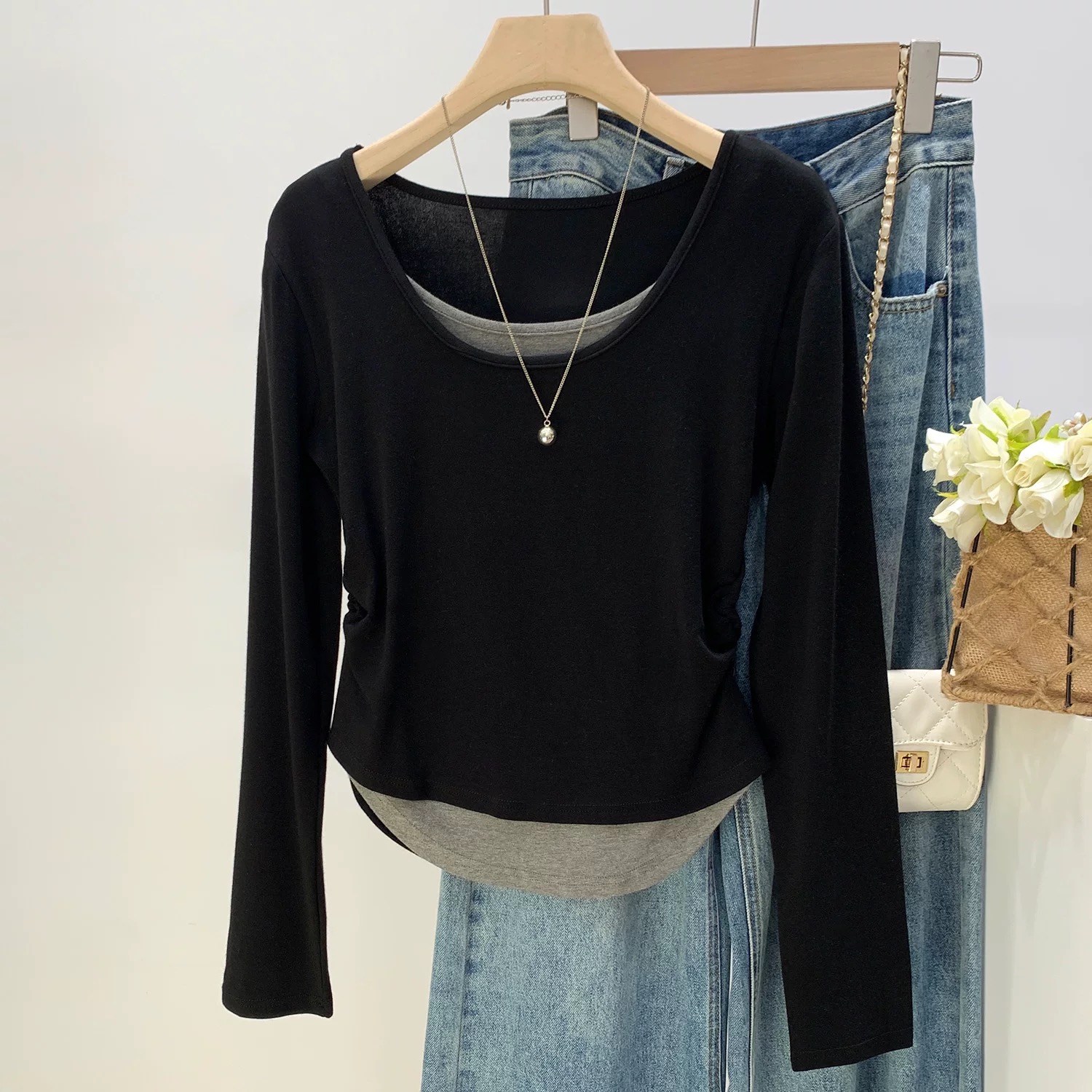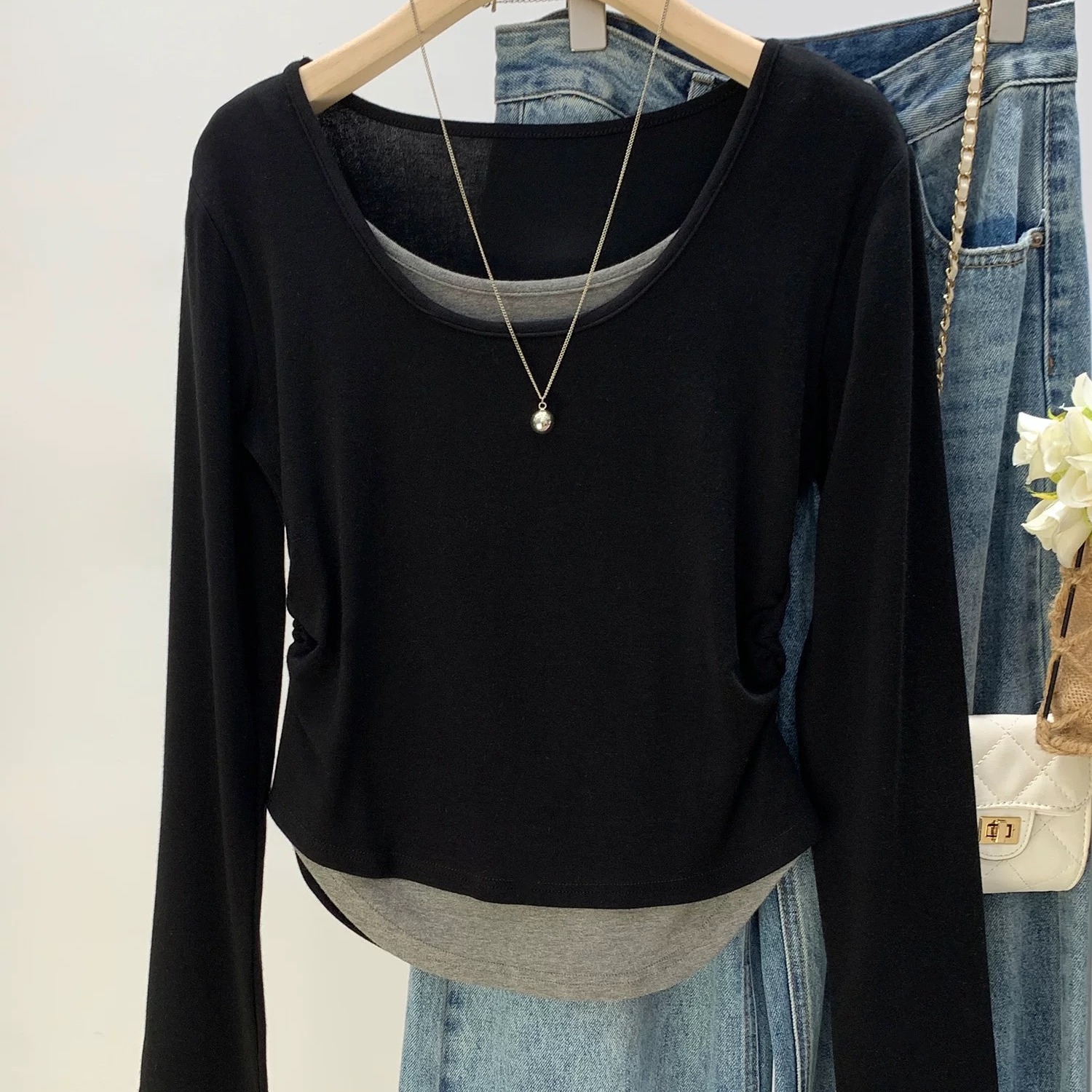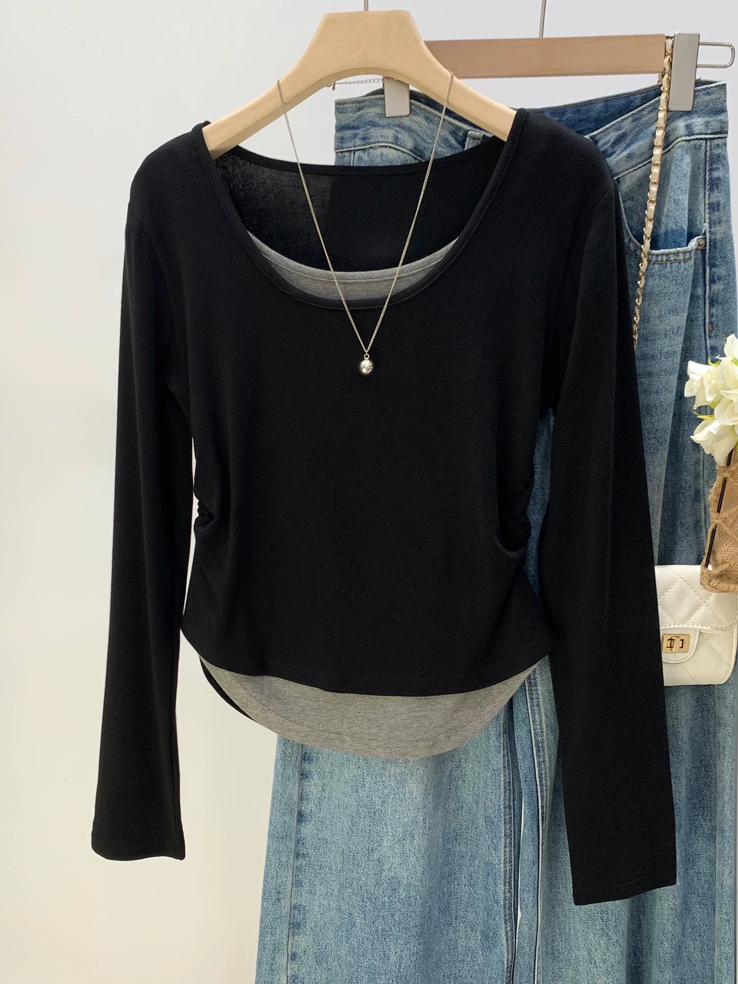 MY16836# 设计感圆领拼接假两件长袖T恤新款修身显瘦打底衫上衣女裝貨源服裝批發