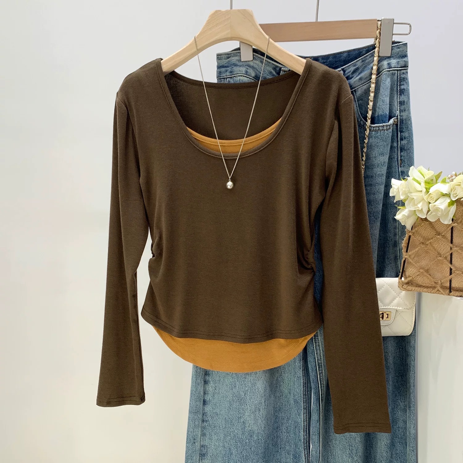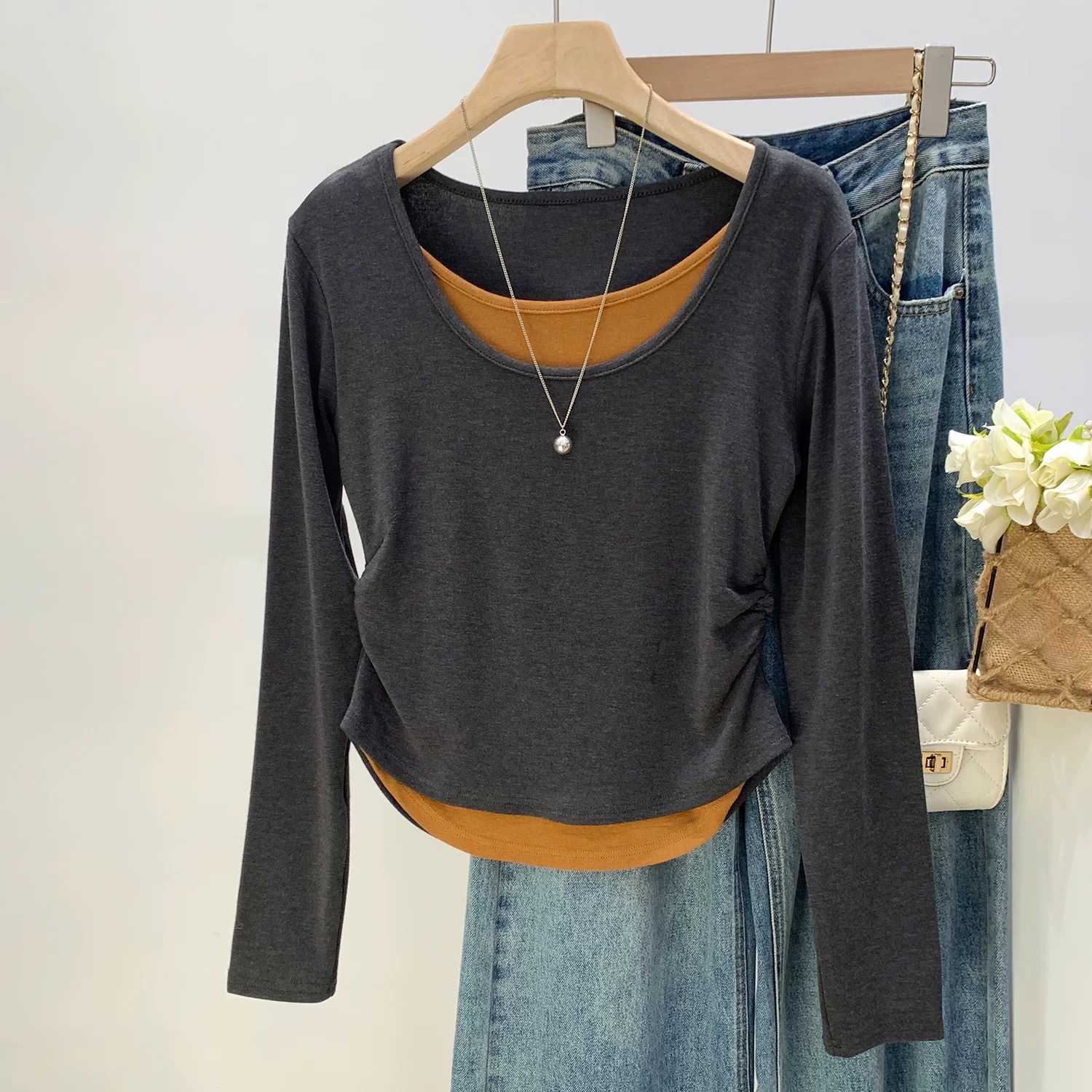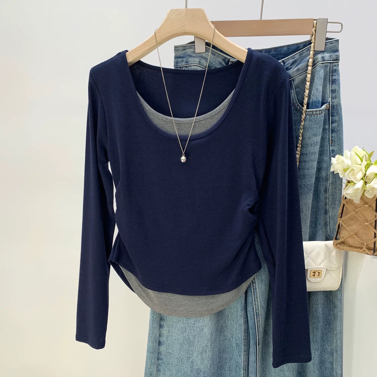 MY16836# 设计感圆领拼接假两件长袖T恤新款修身显瘦打底衫上衣女裝貨源服裝批發